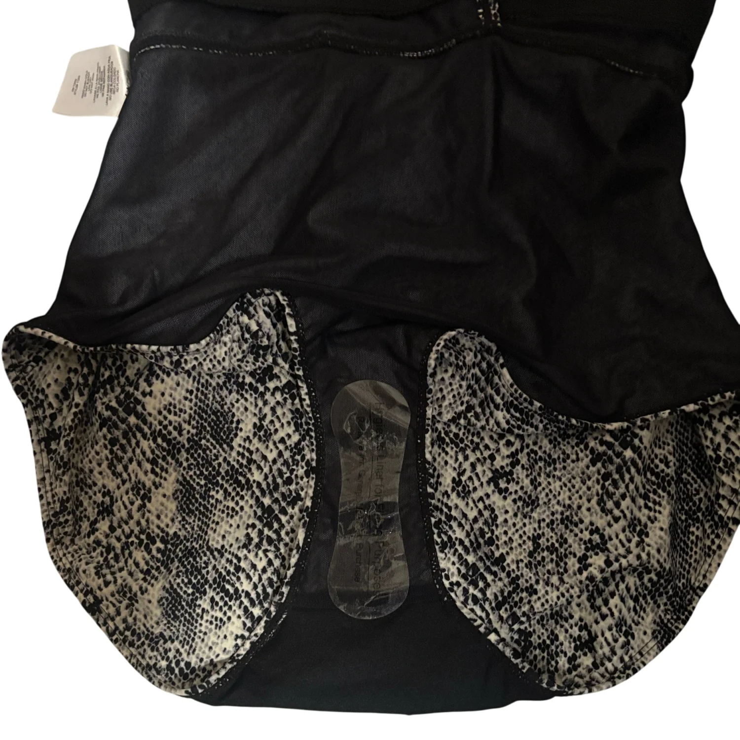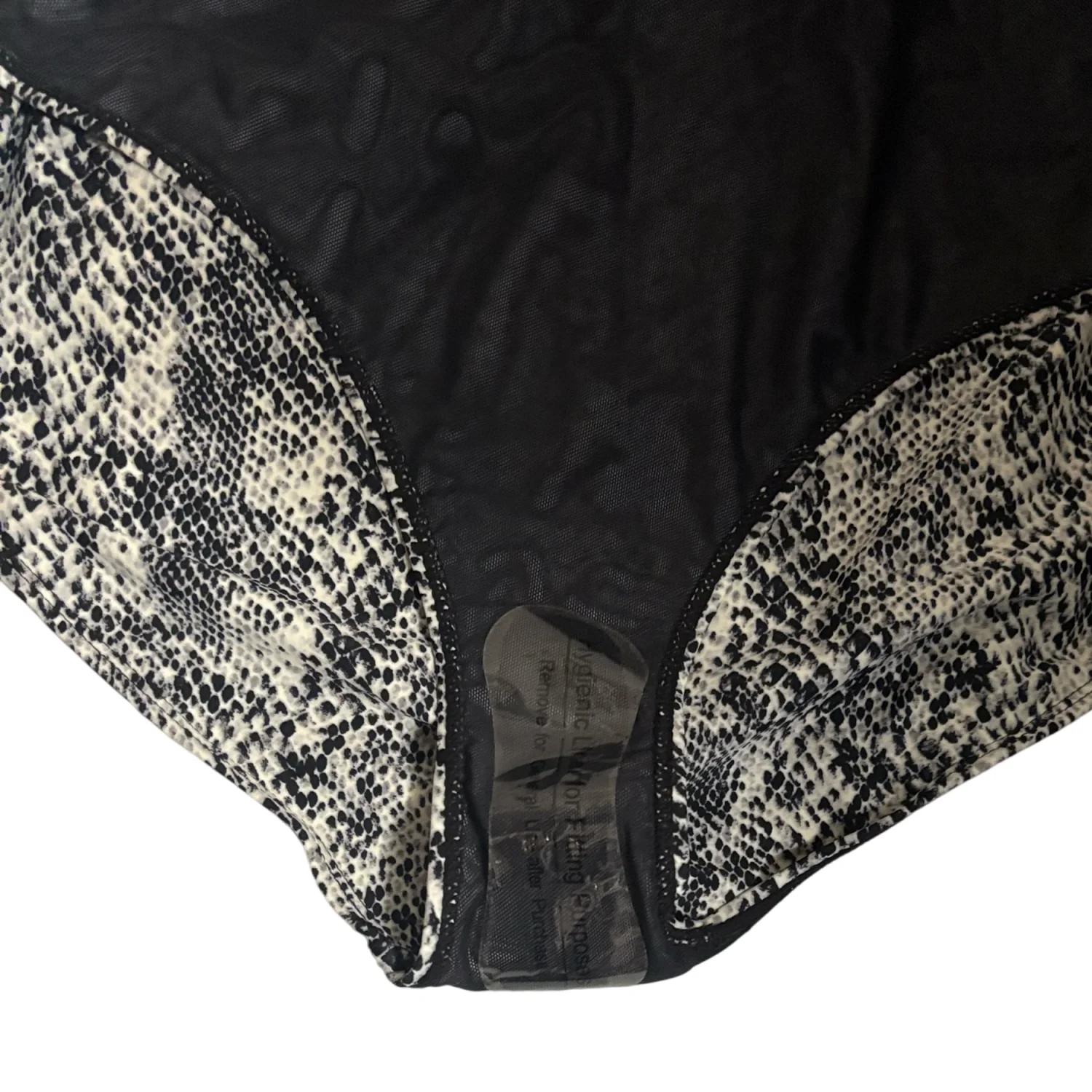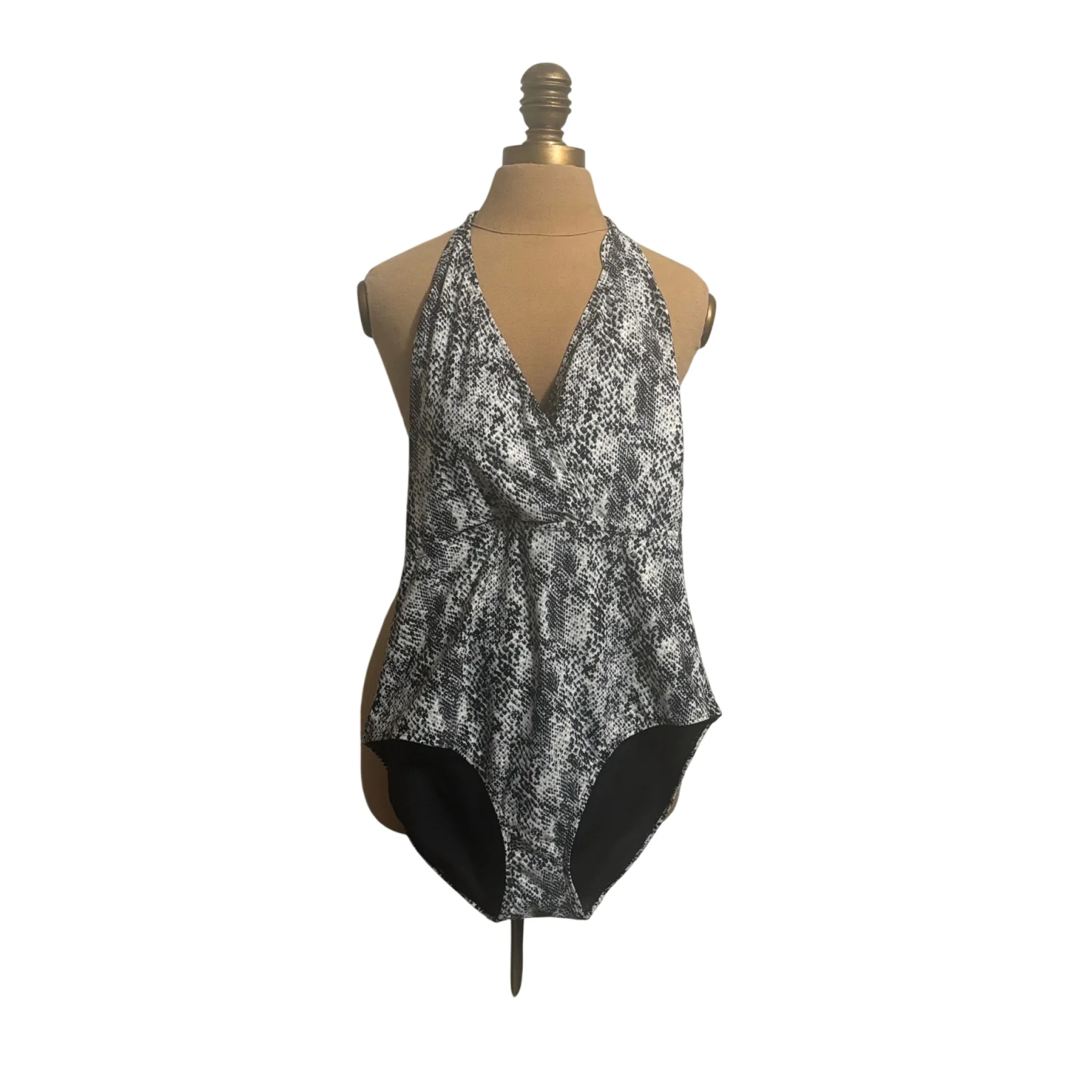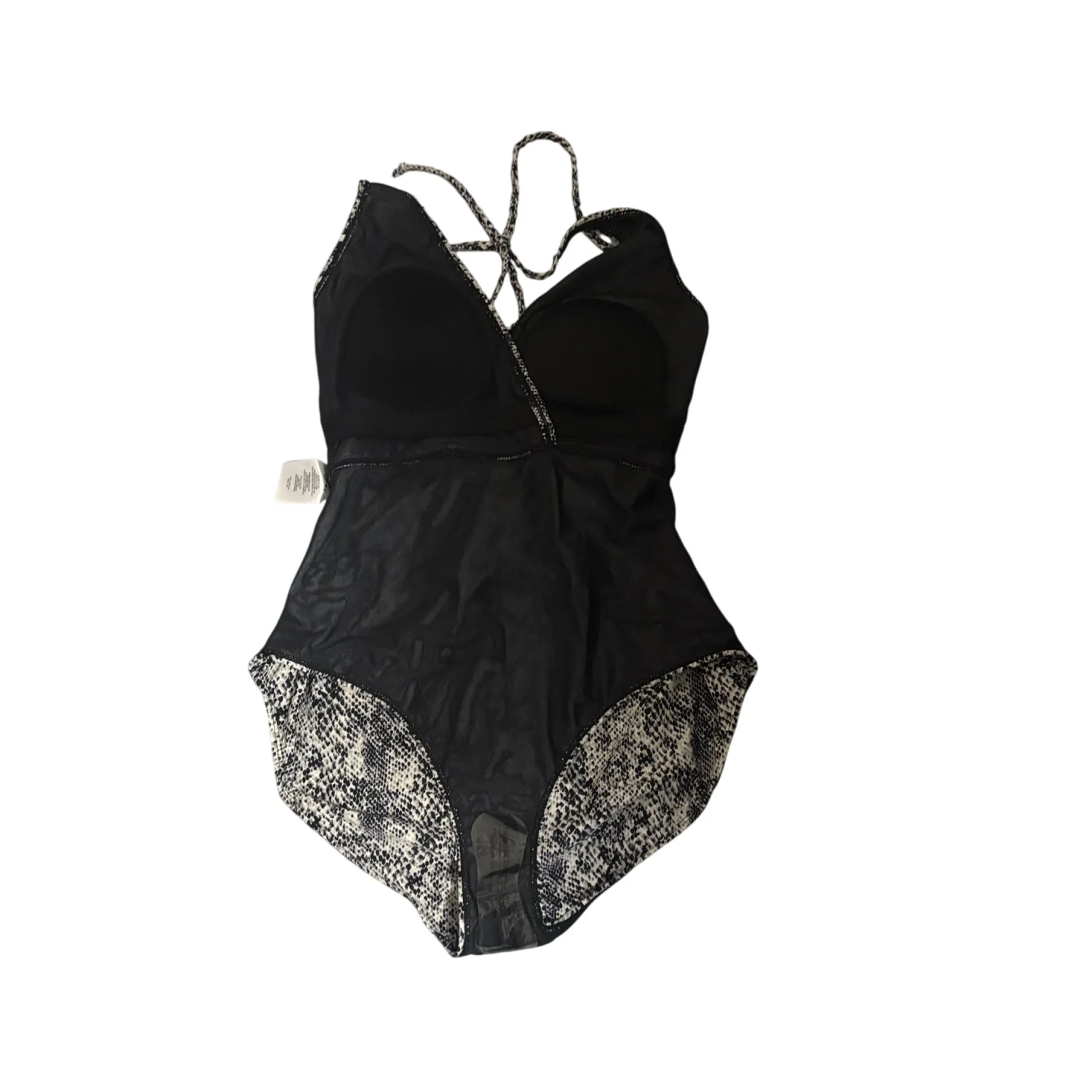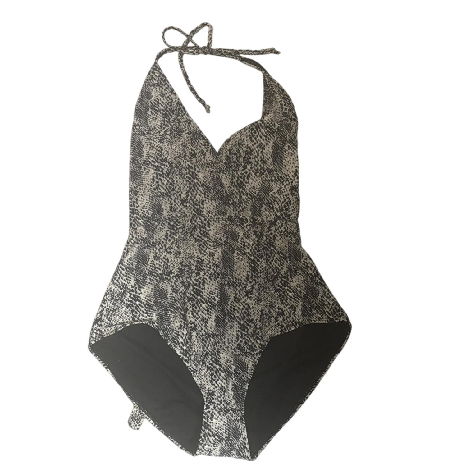 Style: Sleek one-piece swimsuit with a halter neck tie and tie across back. Color: Black and white snakeskin print. Solid black inner lining at the leg openings. Stylish and versatile piece. Size: L Armpit: 14" Length: 29" Condition: New without tag, hygiene strip intact 82% Nylon 18% Spandex Hand wash only
