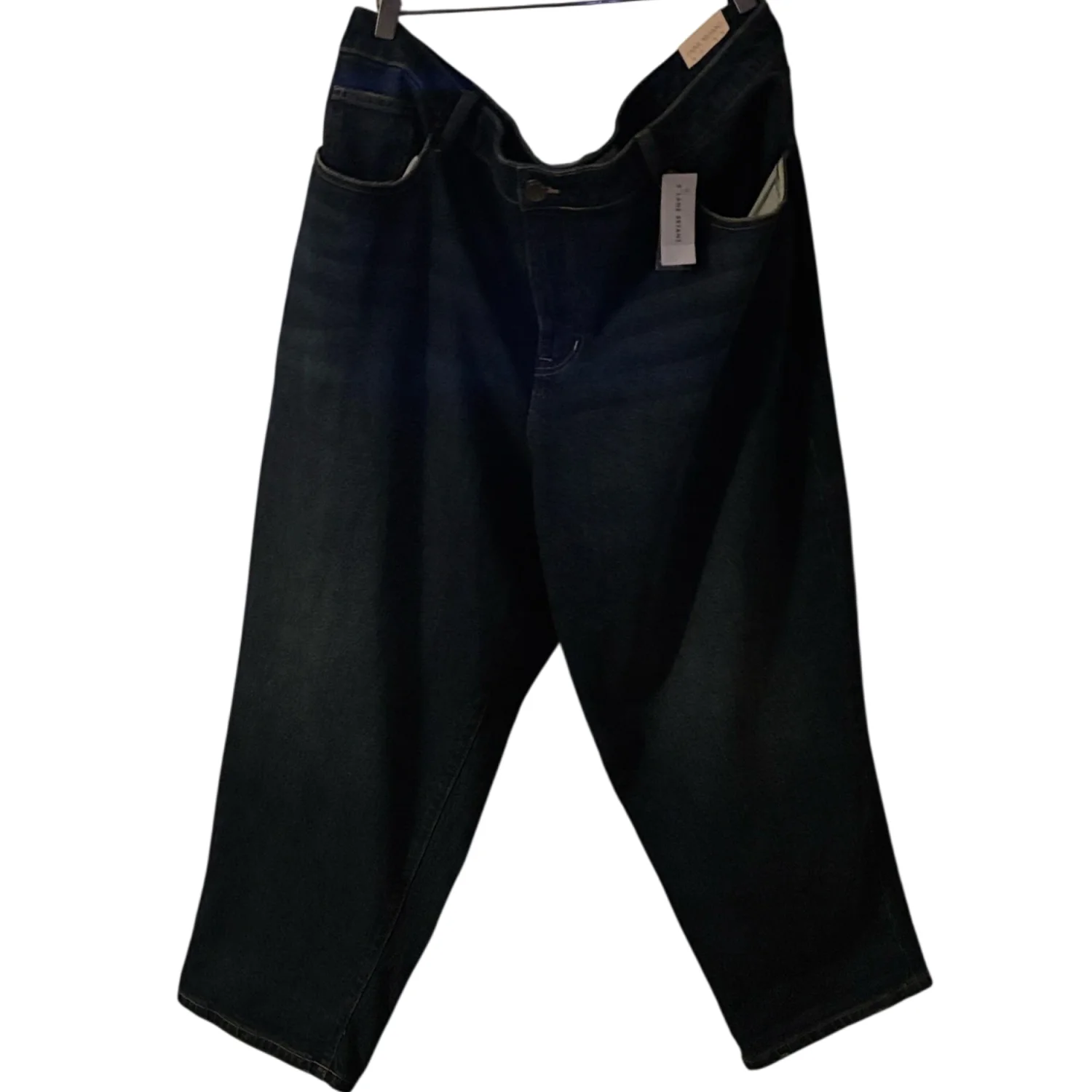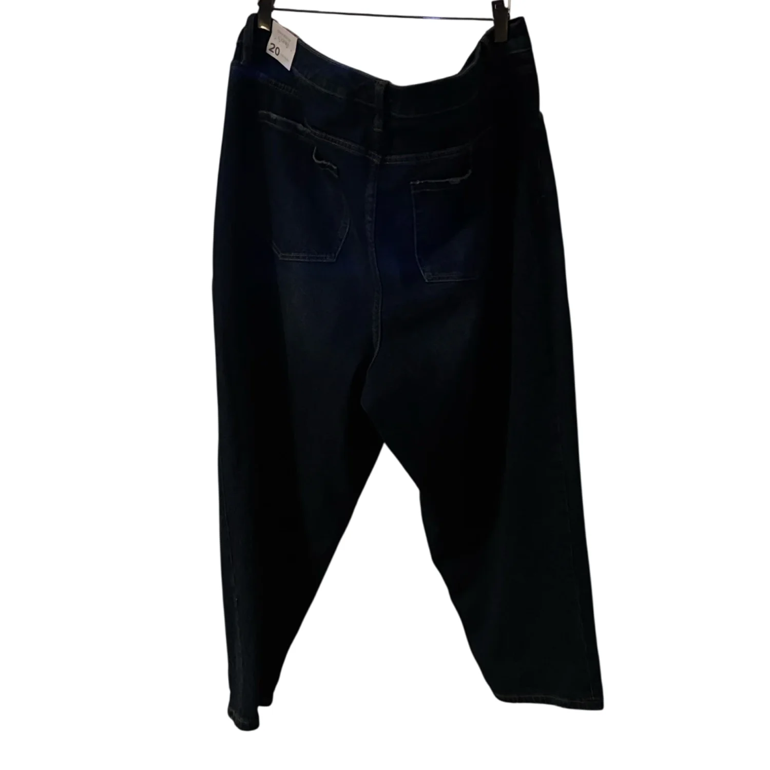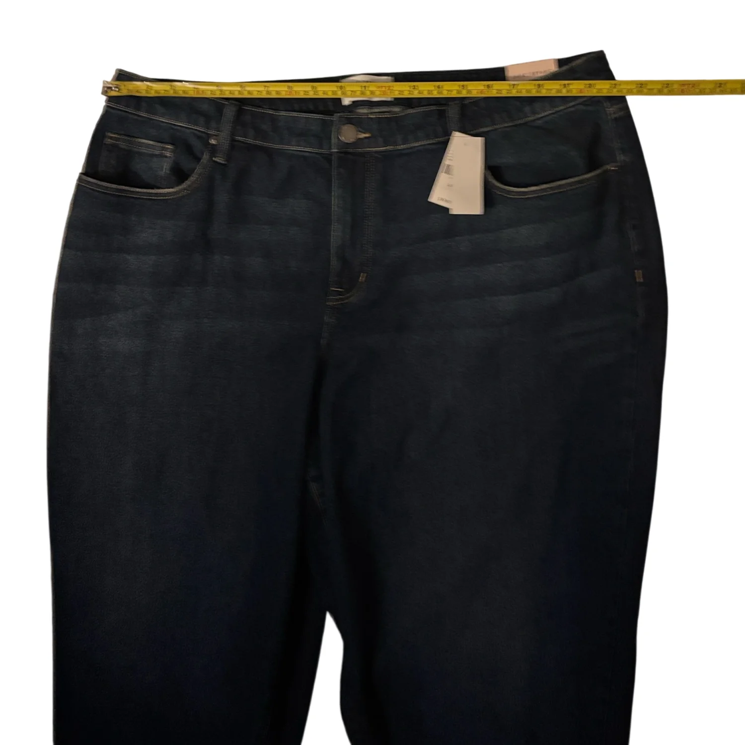 Style: Dark blue women's jeans in a classic mid-rise cut. Soft stretch denim for comfortable all-day wear. Versatile dark blue color pairs easily with casual or dressy tops. Functional pockets and secure zip-front closure. Stylish and flattering for everyday use. Color: Dark Wash Blue Size: 20" Waist: 21" Rise: 16" Inseam: 24" Condition: New with Tags 99% Cotton 1% Spandex Machine wash cold