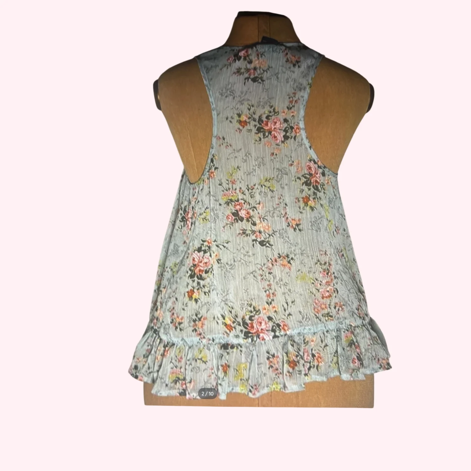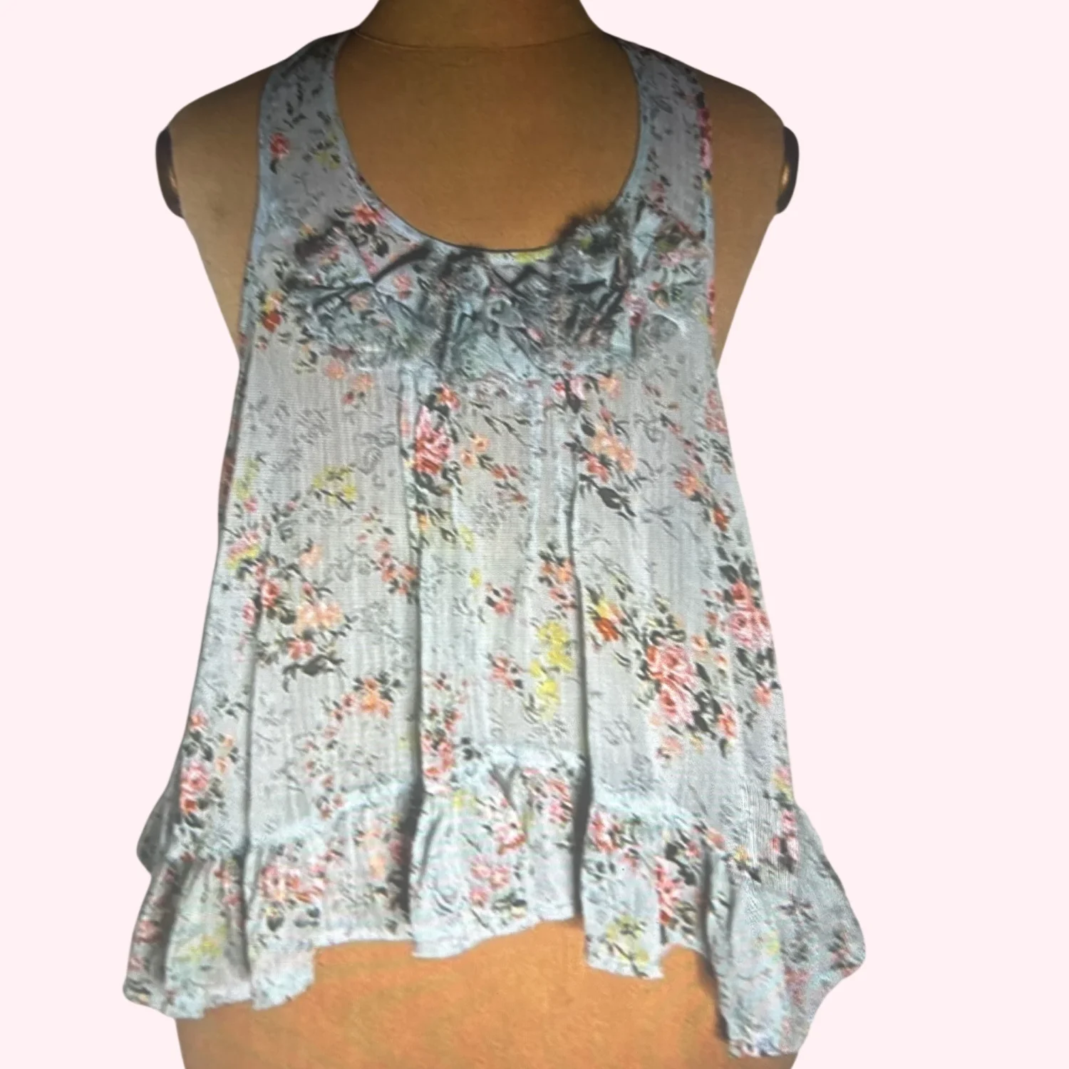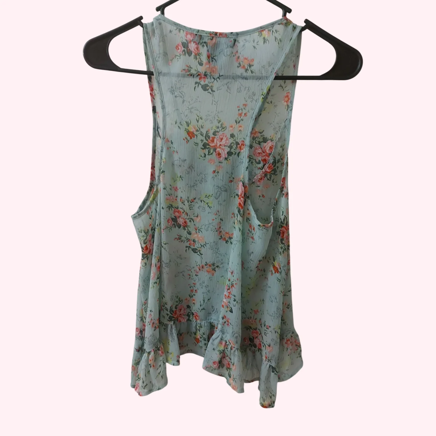 Style: Sleeveless floral tank top with ruffles Color: Seafoam Green/Multicolor Size: S Armpit: 15” Length: 23” Condition: Good 100% Polyester Machine wash cold