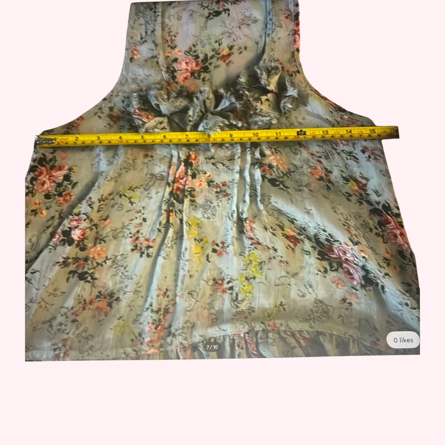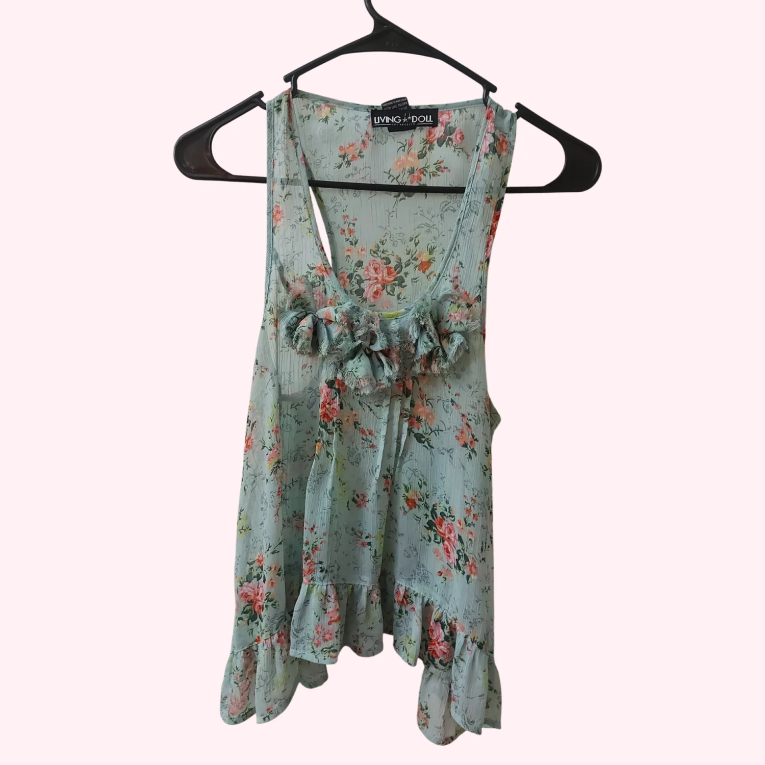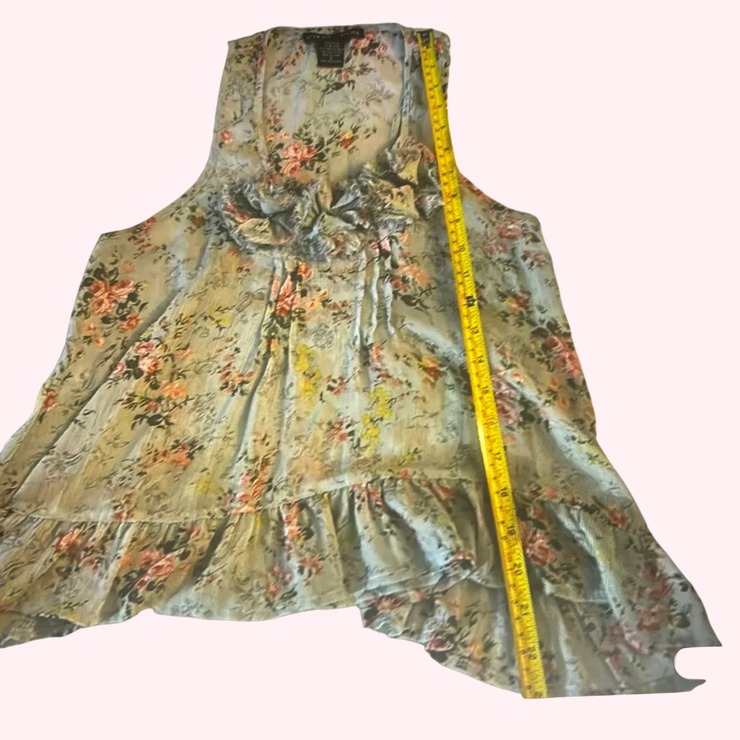 Style: Sleeveless floral tank top with ruffles Color: Seafoam Green/Multicolor Size: S Armpit: 15” Length: 23” Condition: Good 100% Polyester Machine wash cold