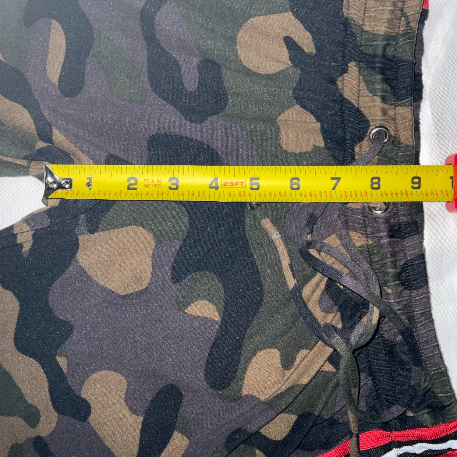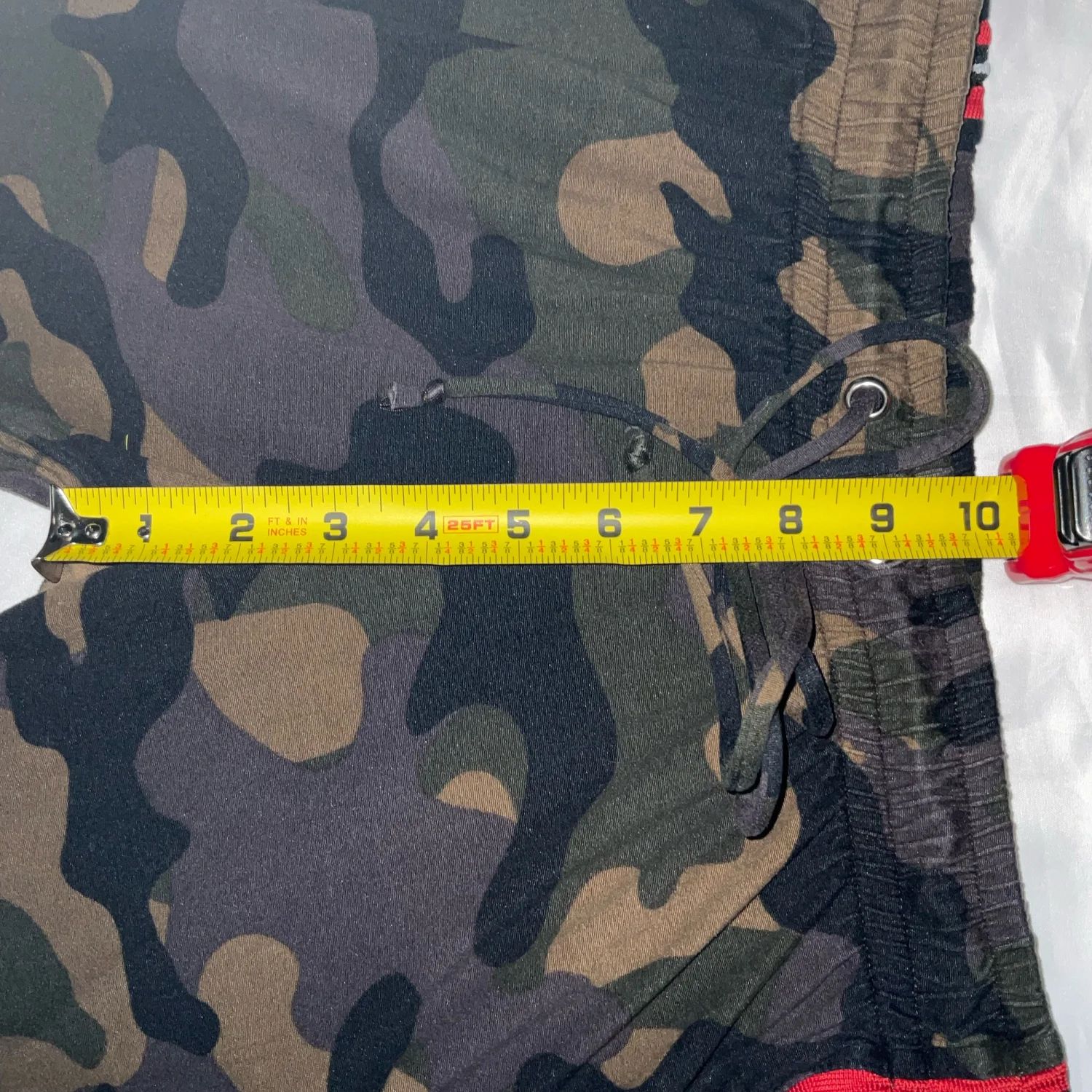 Style: Drawstring pants with racing stripes down the side Color: Green/White/ Red/Black Size: M Waist: 13" Rise: 10" Length: 30" Condition: Good 95% Polyester 5% Spandex Hand wash cold