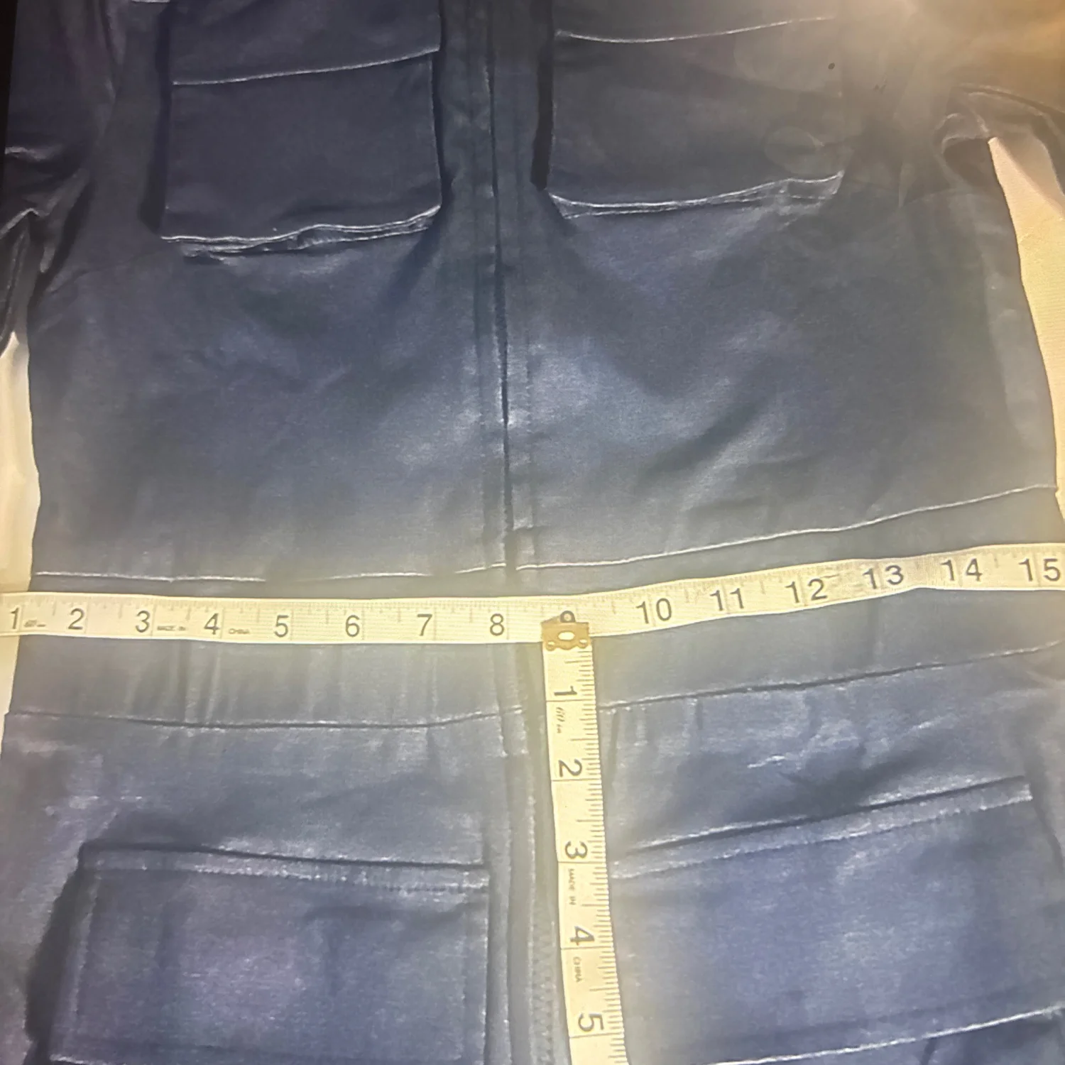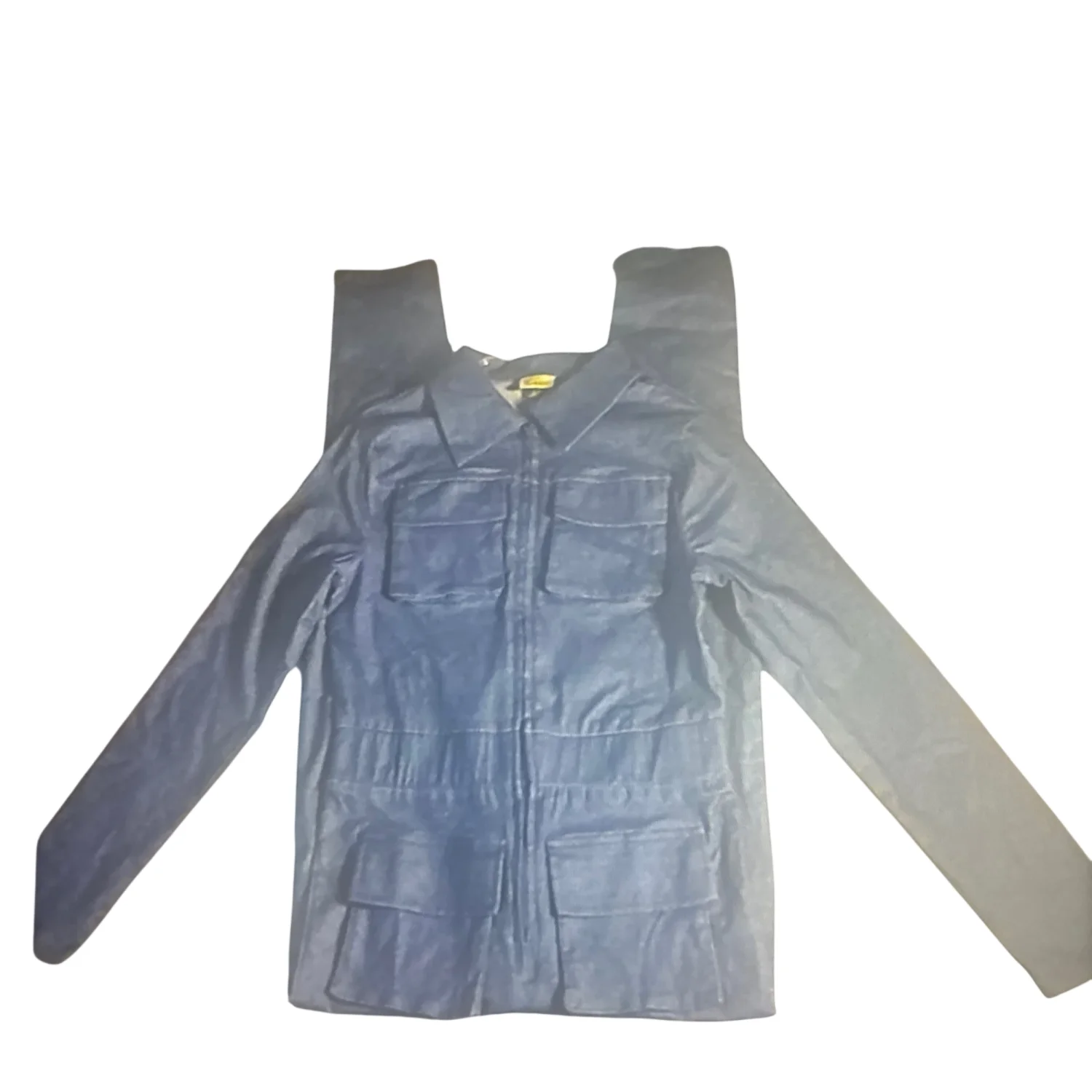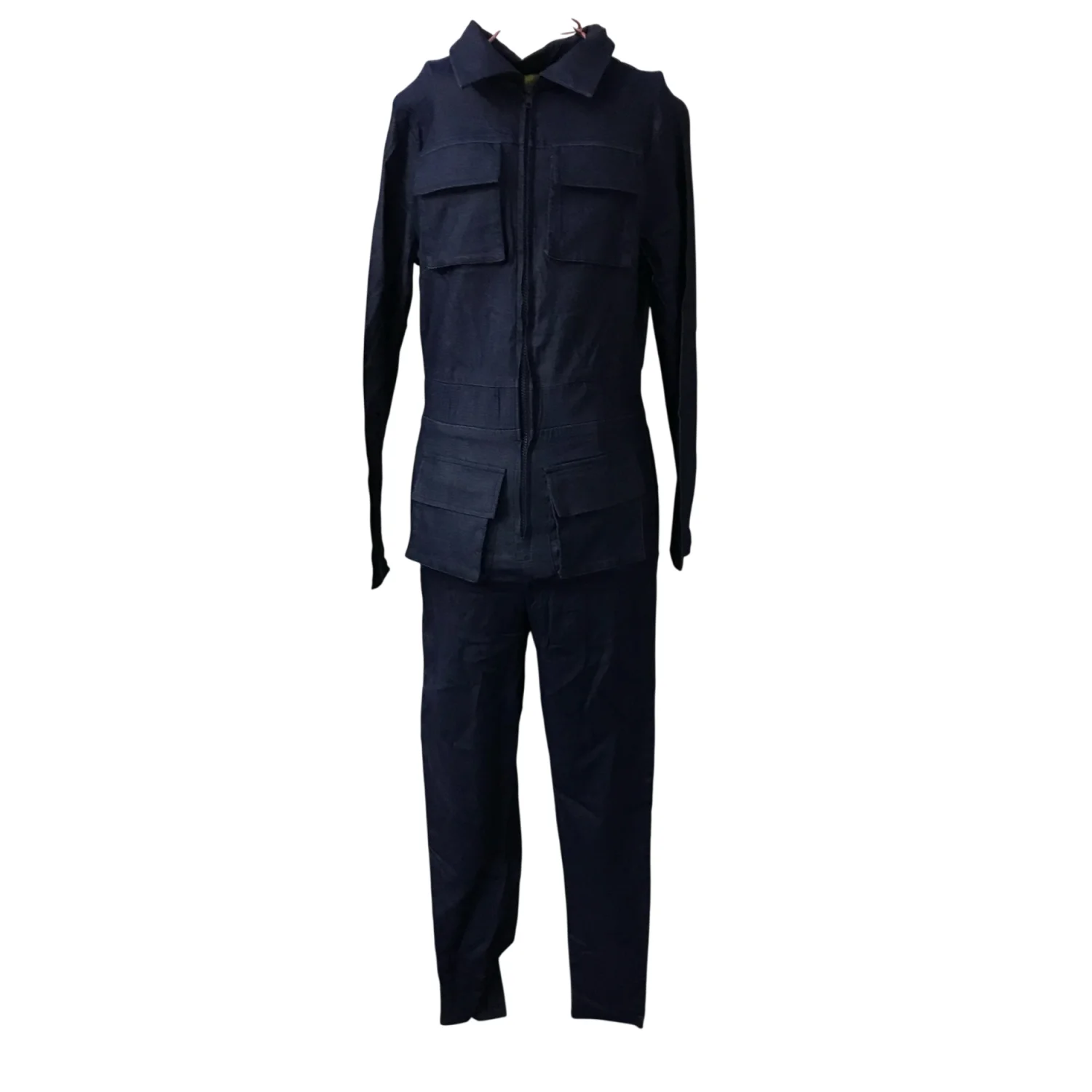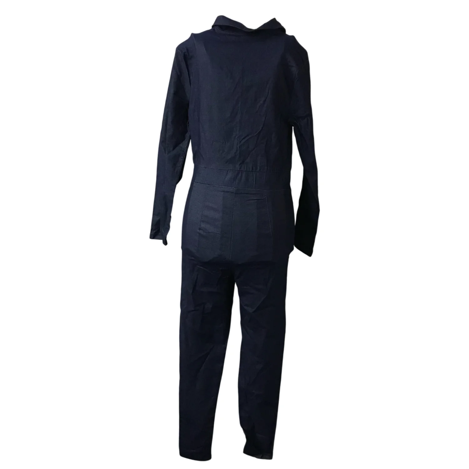 Style: 4 pocket, Long sleeve jumpsuit Color: Dark blue Size: L Armpit: 15" Waist: 14" Length: 28" Condition: Good 60% Viscose 35% Nylon 5% Spandex Dry Clean