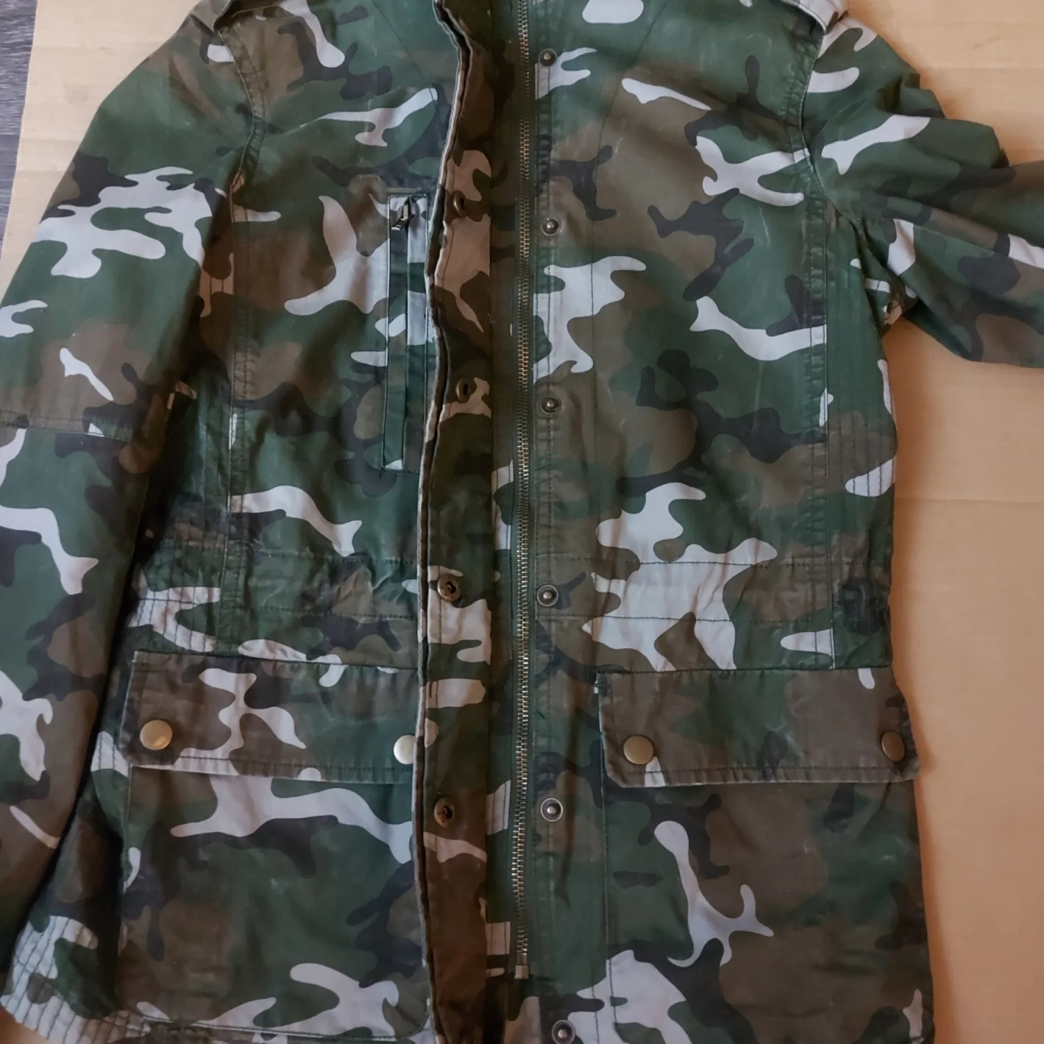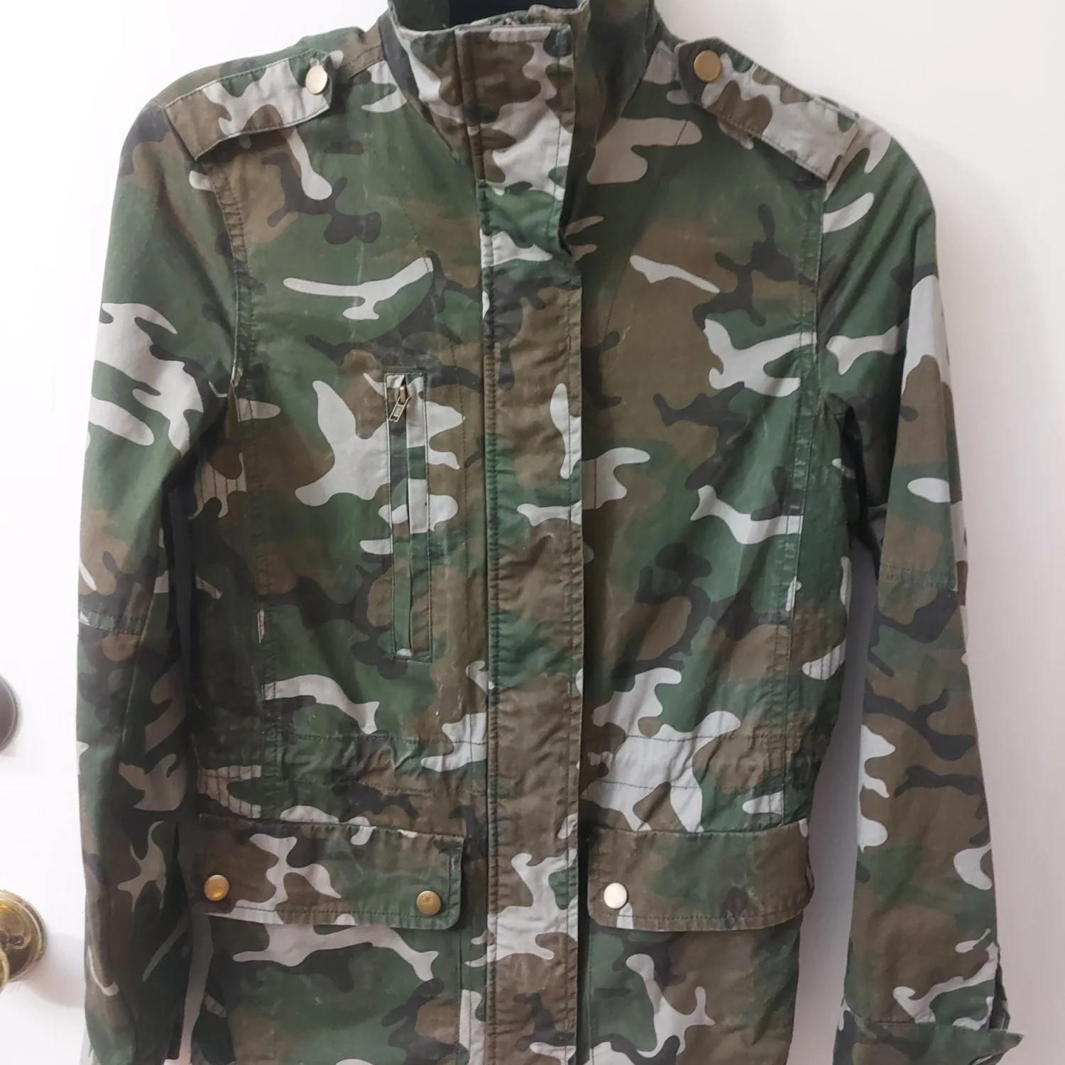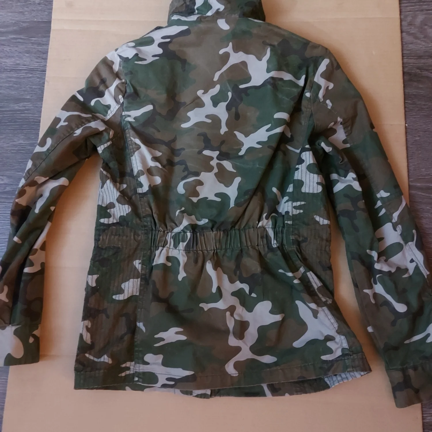 Style: Utility jacket with three pocket, zip and button closure and back ruching Color: Green/Brown Size: S Armpit: 16" Length: 25 Sleeve: 30" 100% Cotton Hand Wash Cold