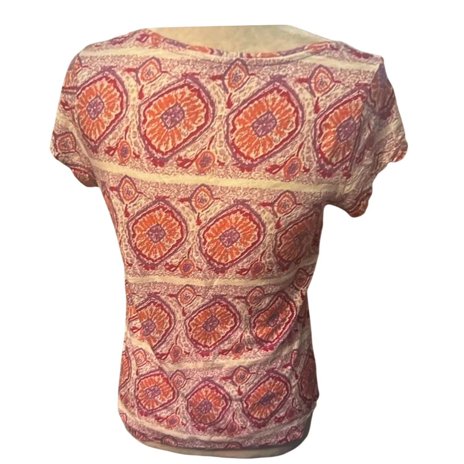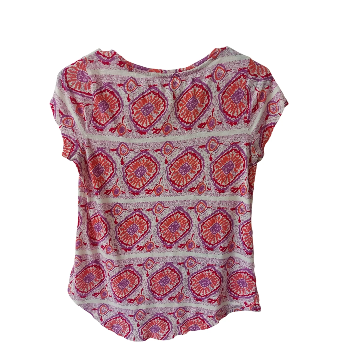 Style: Casual lightweight crewneck short sleeve t-shirt Color: Red/Purple/White Size: S Armpit: 16” Length: 23” Condition: Good Machine wash
