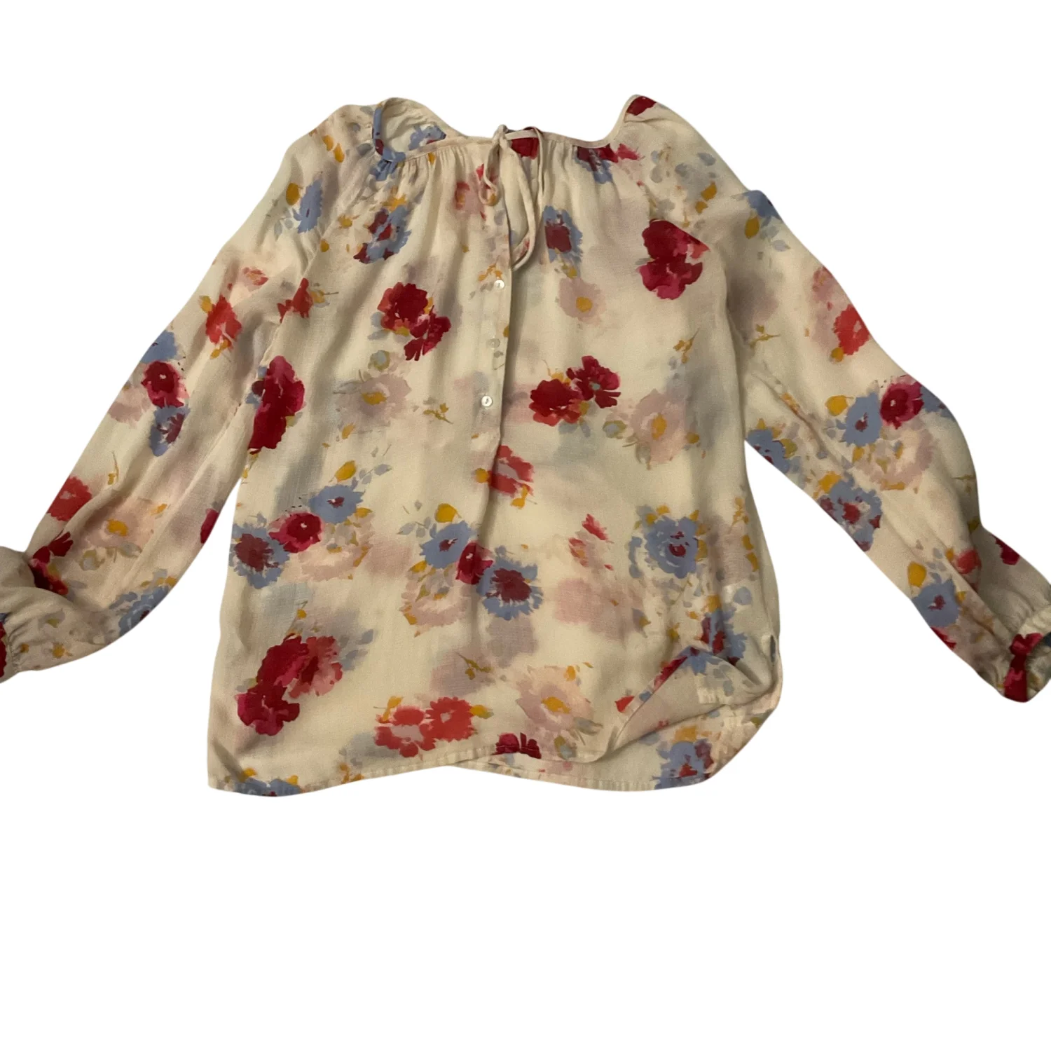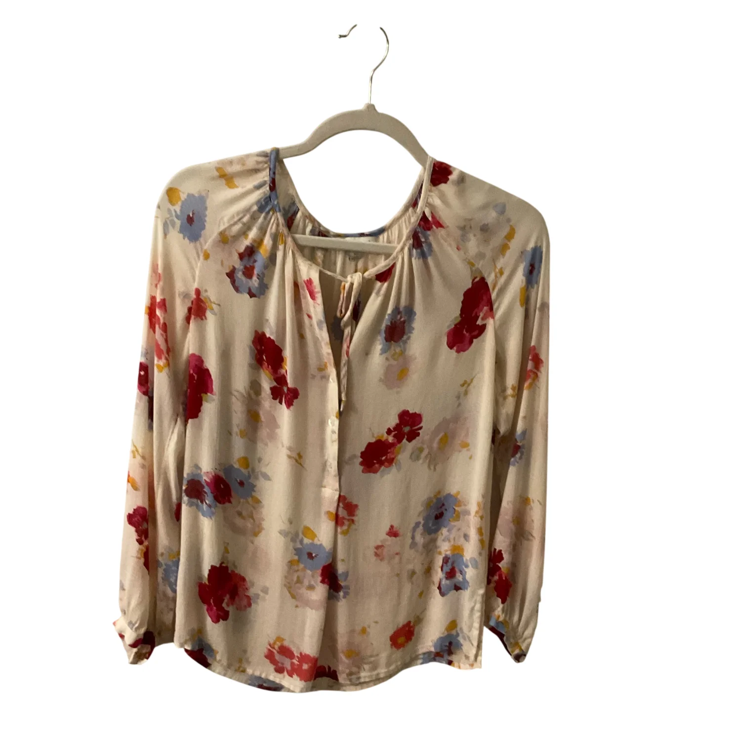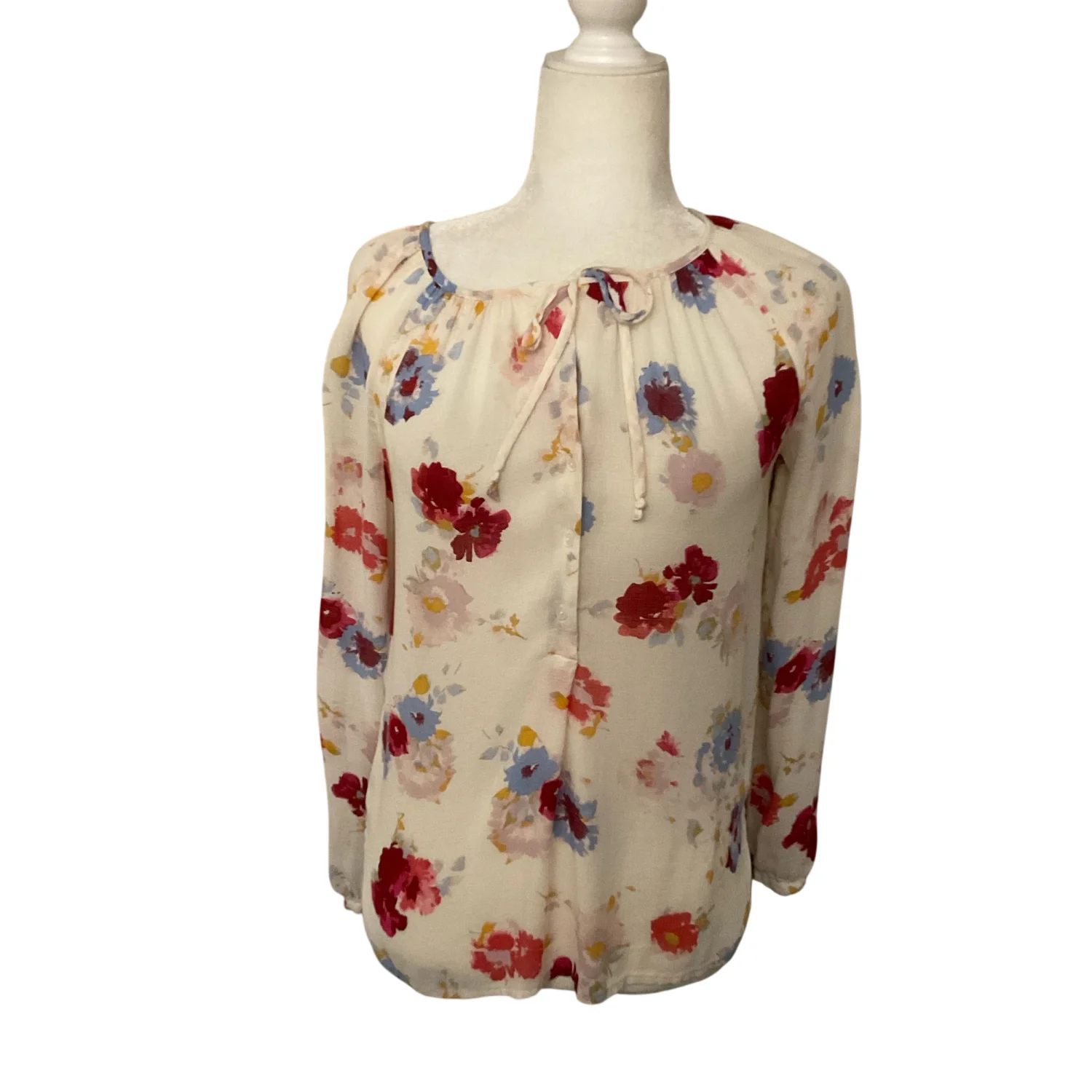 Style: Tie front button up blouse Color: Cream/Red Size: XS Armpit: 16” Length: 21” Sleeve: 26” Condition: Good 100% Viscose Machine wash cold