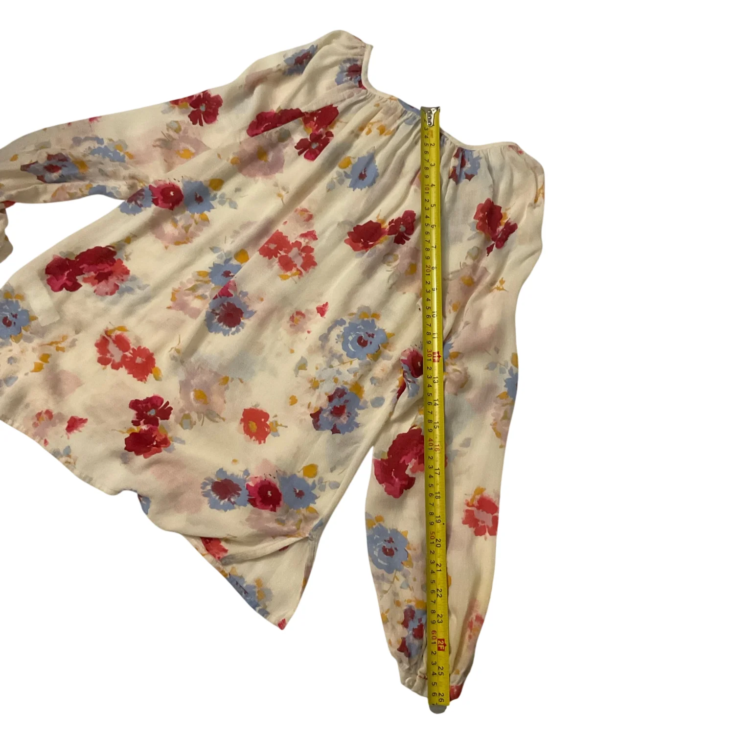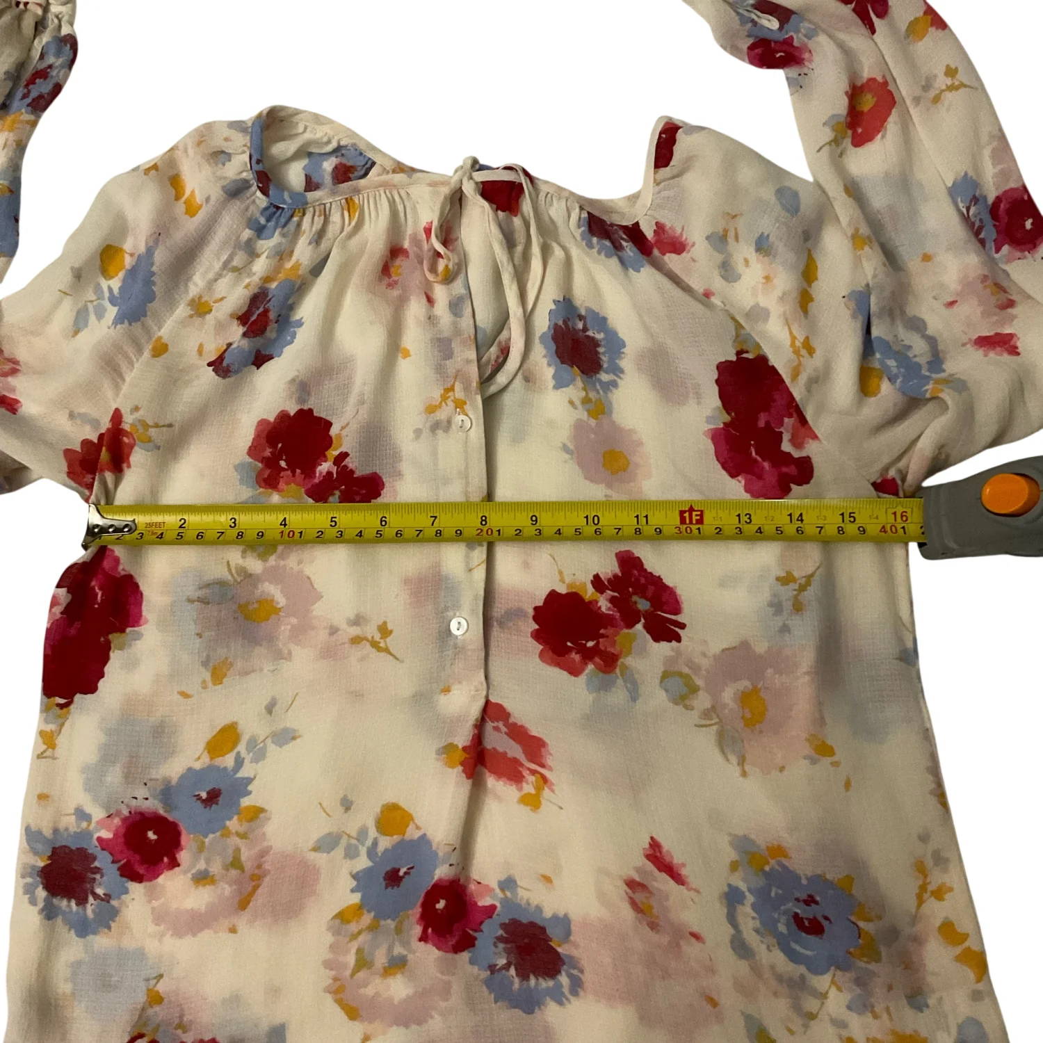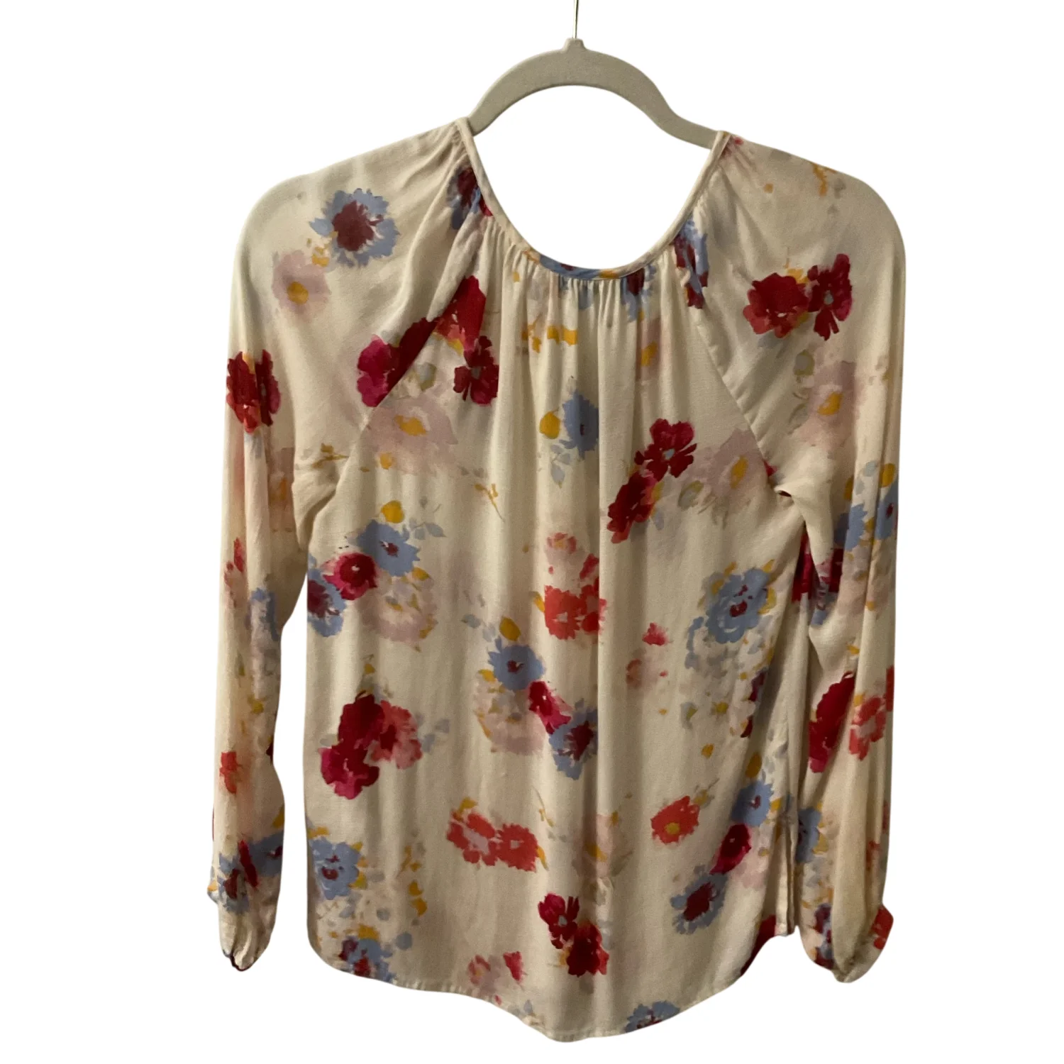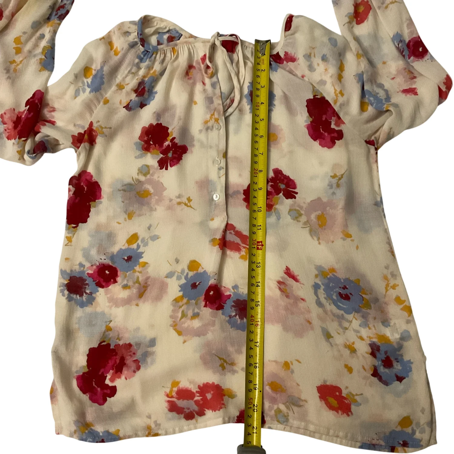 Style: Tie front button up blouse Color: Cream/Red Size: XS Armpit: 16” Length: 21” Sleeve: 26” Condition: Good 100% Viscose Machine wash cold
