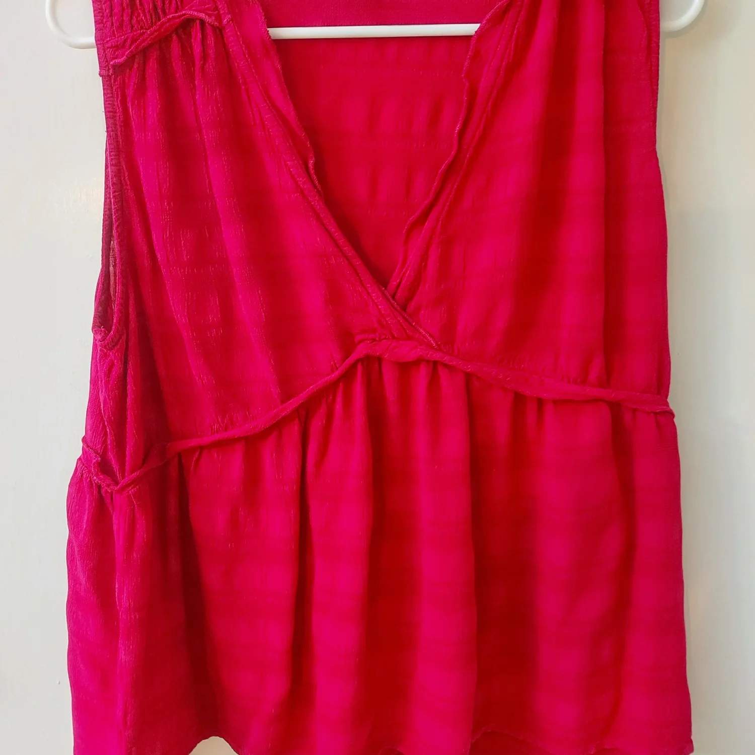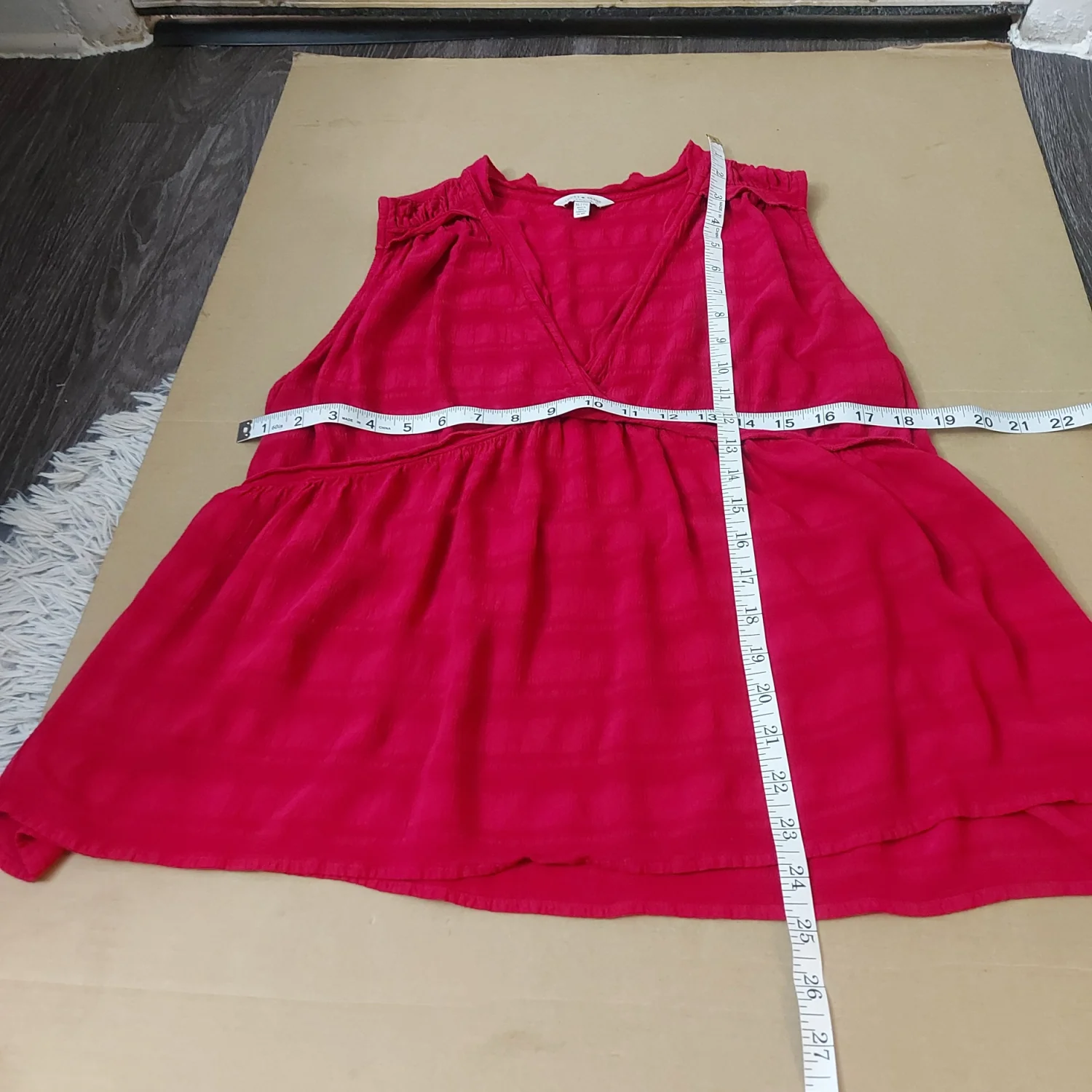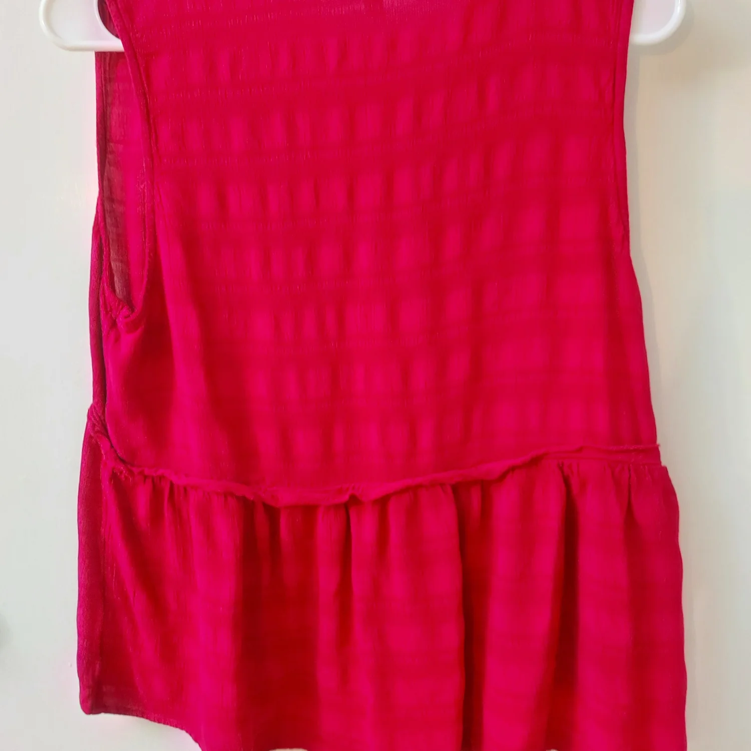 Style: V-neck sleeveless ruffle top that flares at bottom Color: Cherrie Jubilee( Dark reddish-pink) Size: XL Armpit: 18” Length: 24” Condition: Good, no care tag 100% Rayon Machine wash cold