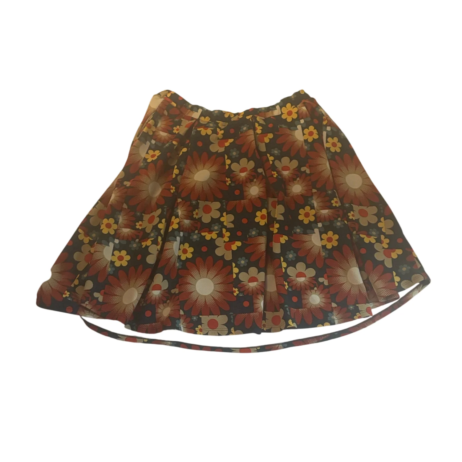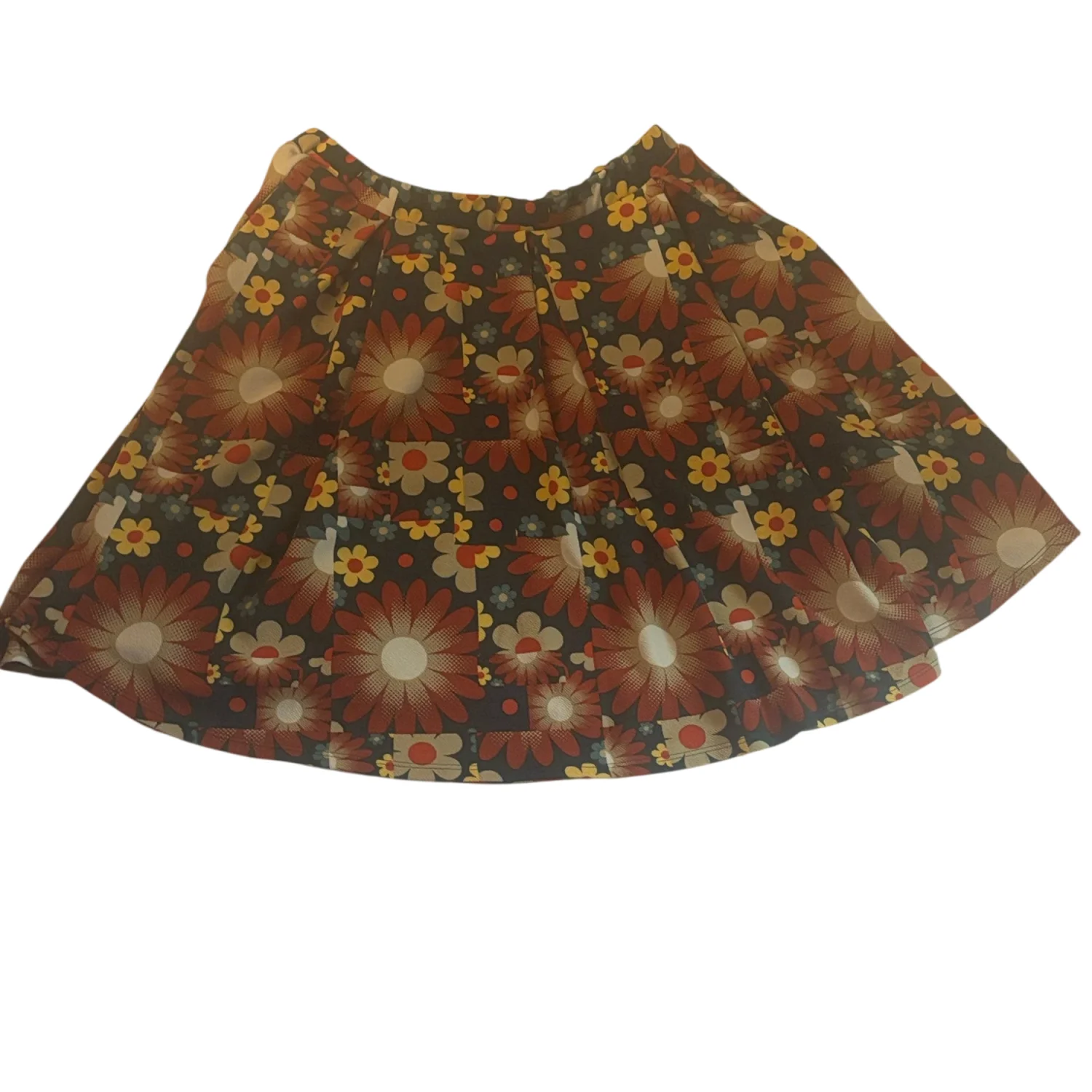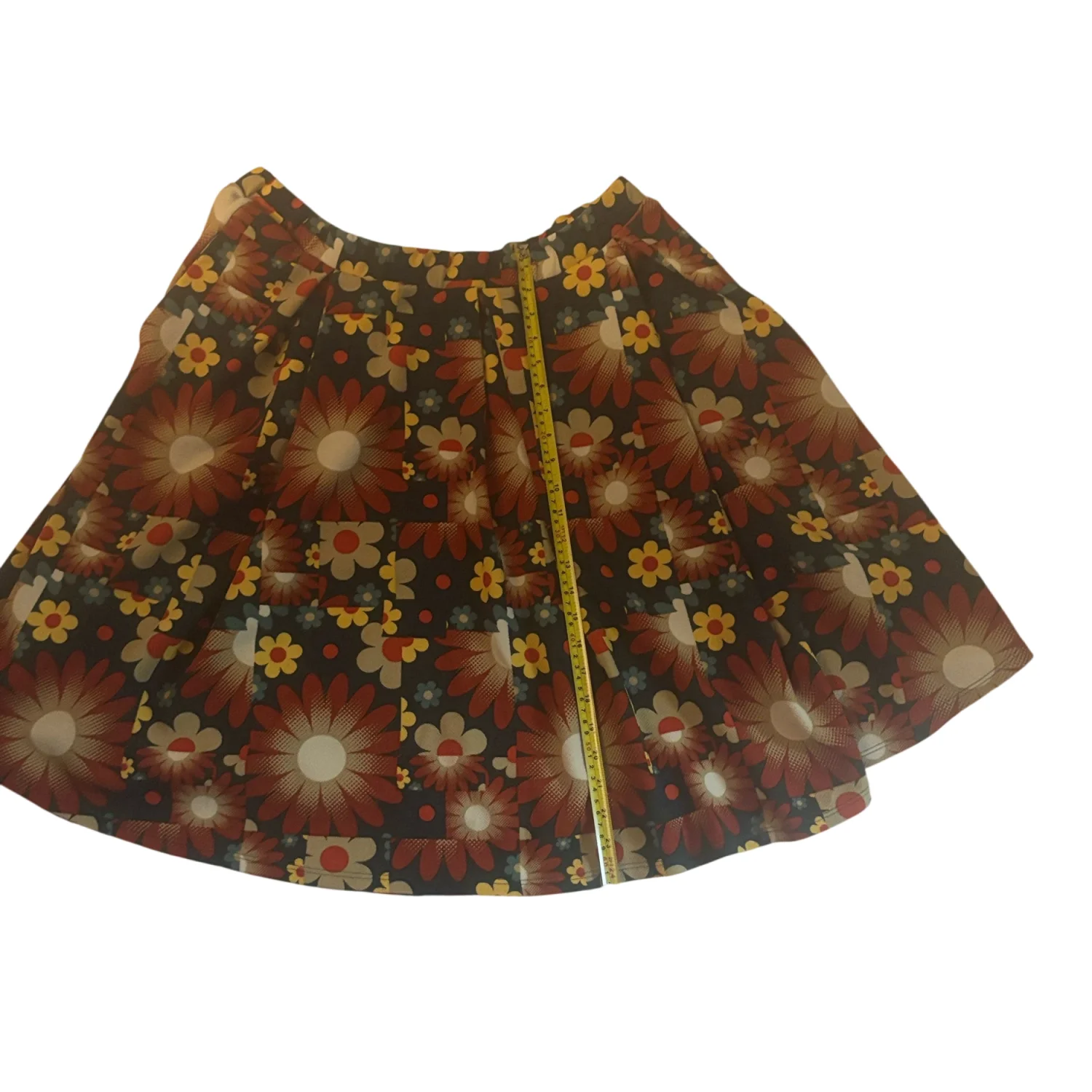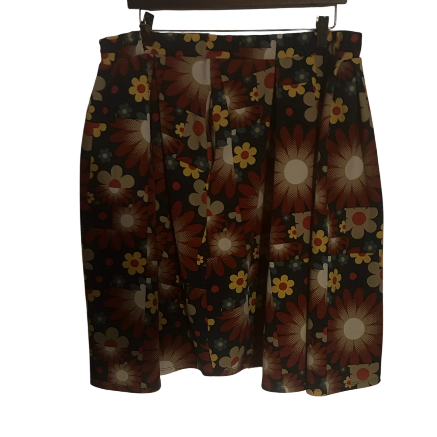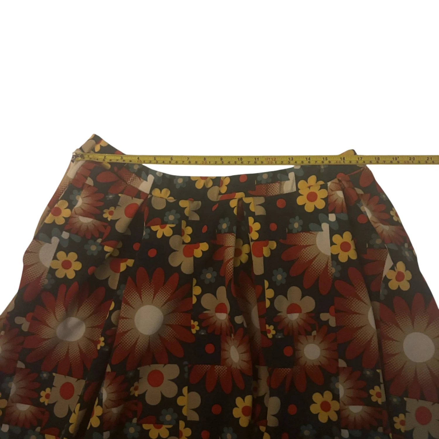 Style: A vintage-inspired pleated skirt with bold floral print. Soft green base with red and yellow daisy motifs for a statement look. Comfortable fit that pairs easily with tees or blouses. Eye-catching pattern adds retro charm to any outfit. Color: Red/Green/Yellow/Beige Size: 3XL Waist: 17" Length: 24" Condition: Good 97% Polyester 3% Spandex Machine wash/hang dry