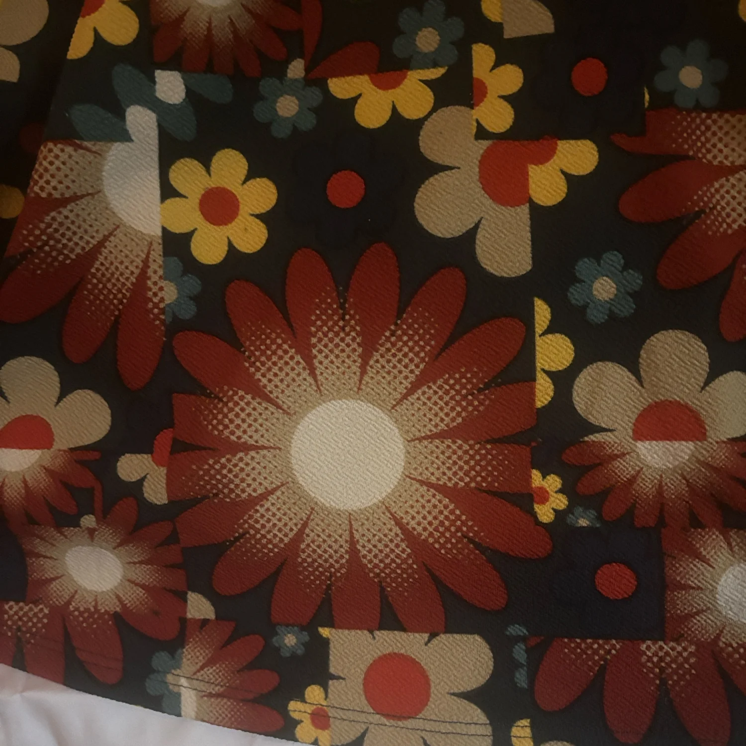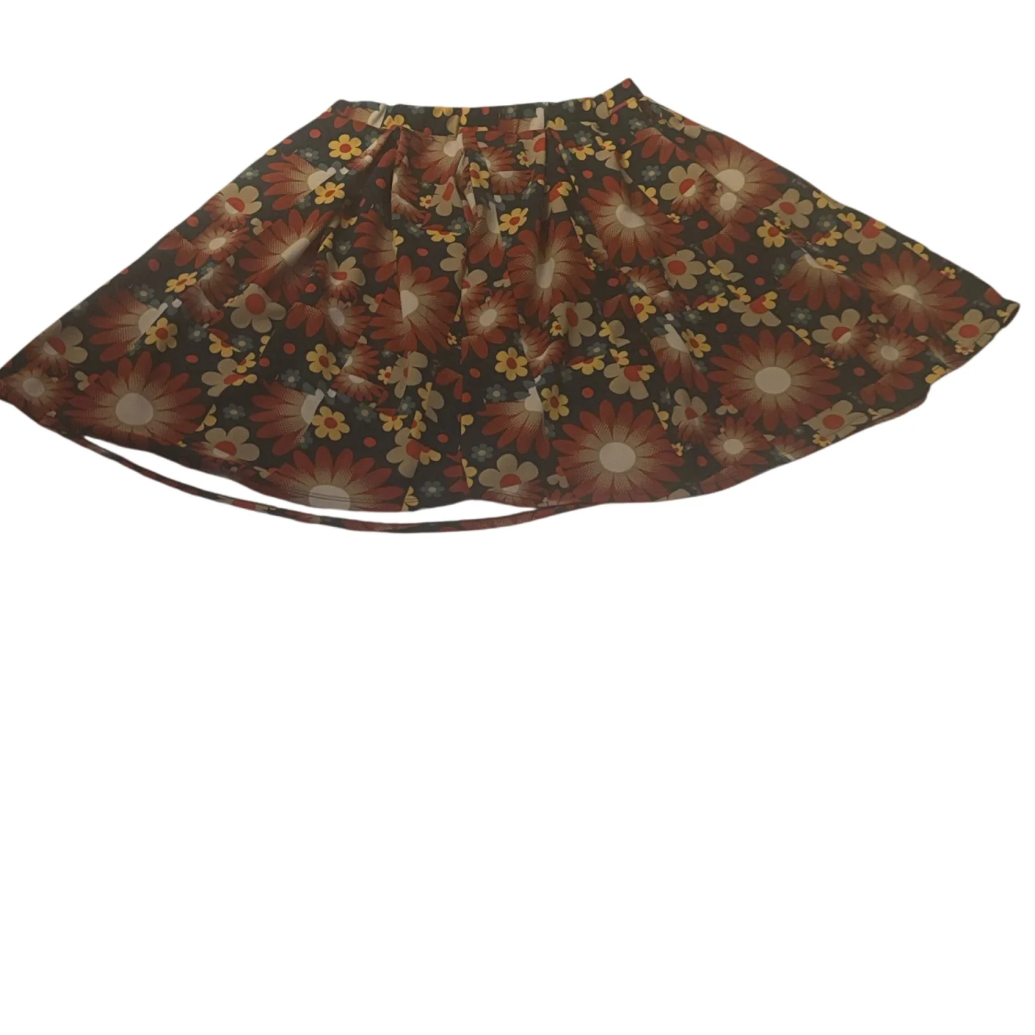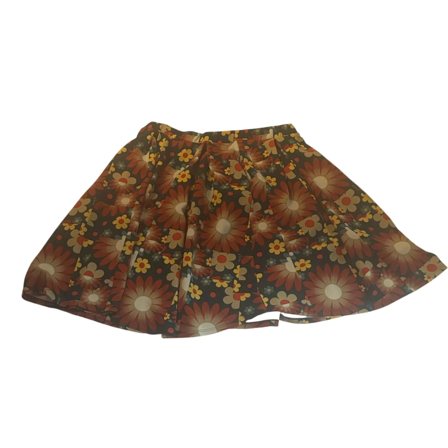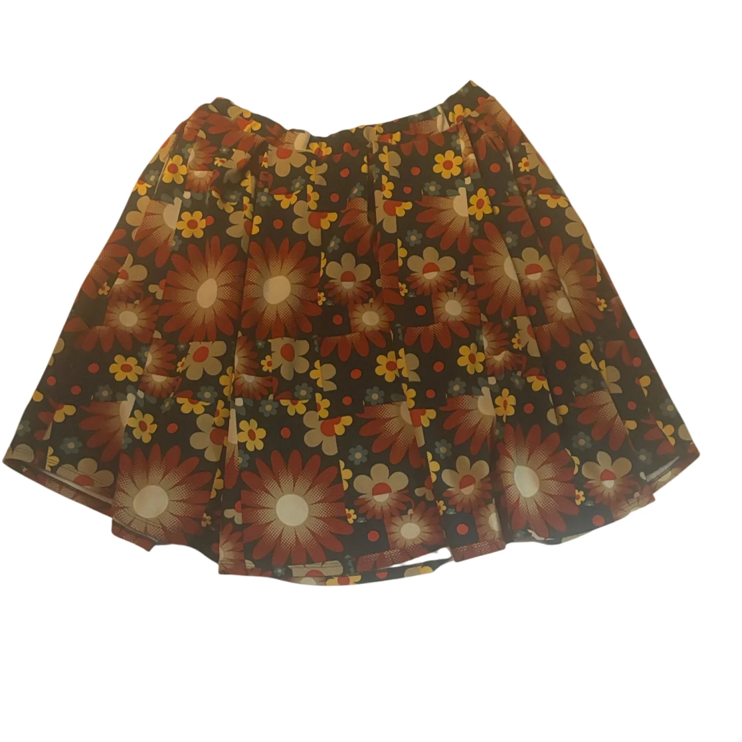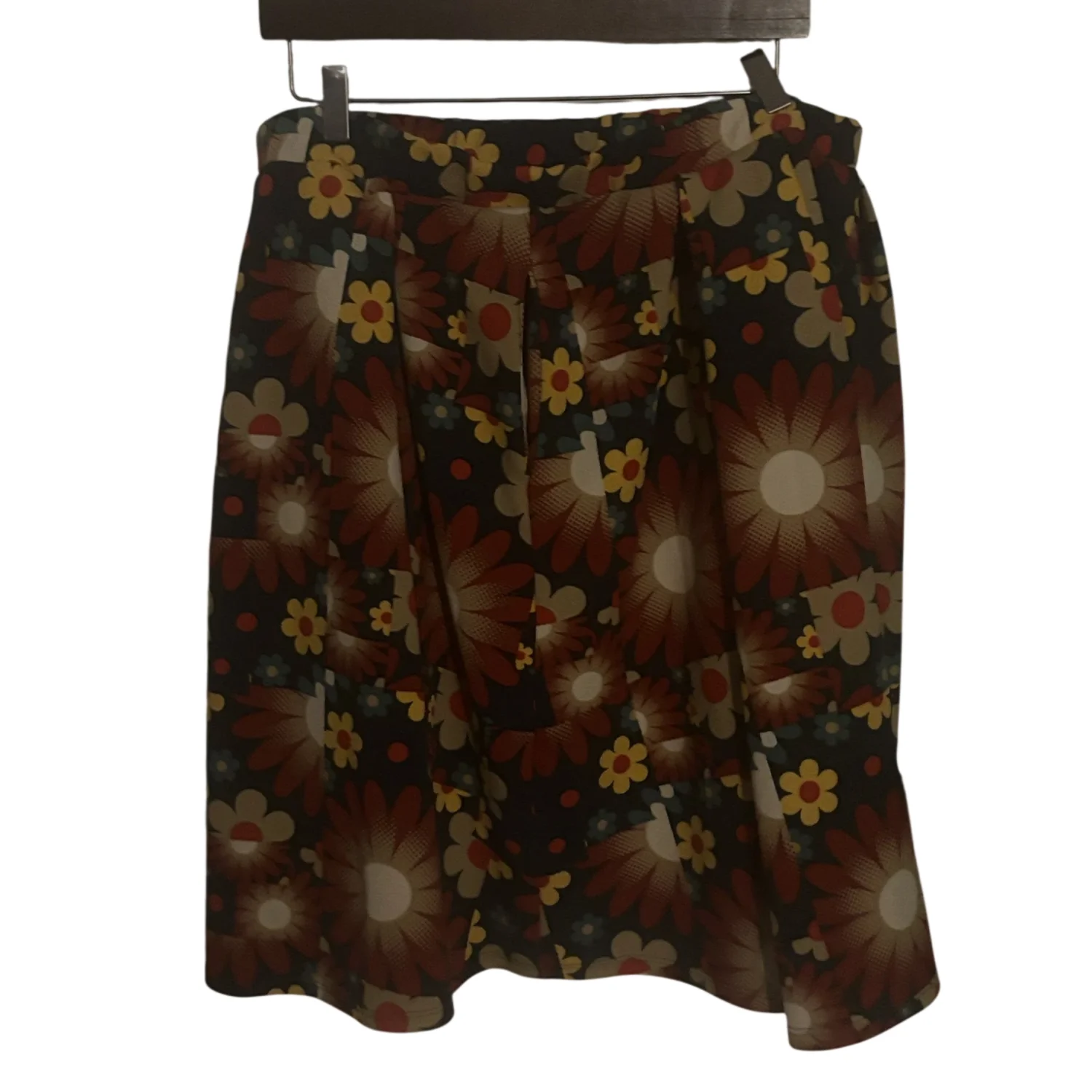 Style: A vintage-inspired pleated skirt with bold floral print. Soft green base with red and yellow daisy motifs for a statement look. Comfortable fit that pairs easily with tees or blouses. Eye-catching pattern adds retro charm to any outfit. Color: Red/Green/Yellow/Beige Size: 3XL Waist: 17" Length: 24" Condition: Good 97% Polyester 3% Spandex Machine wash/hang dry