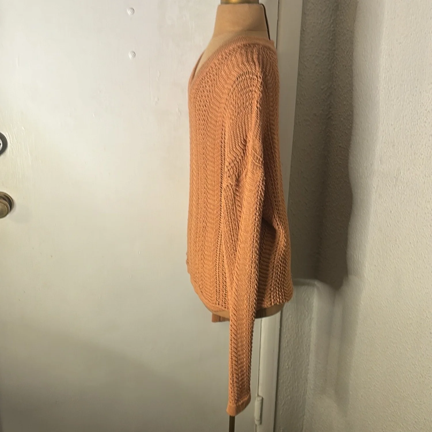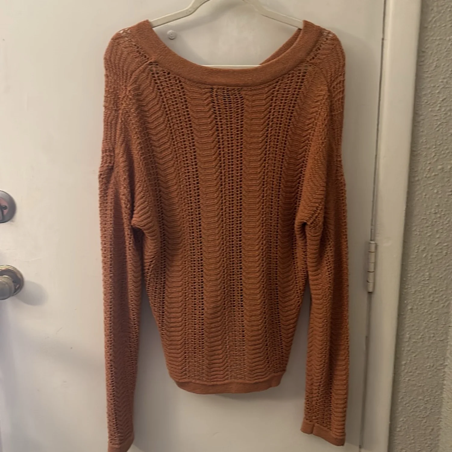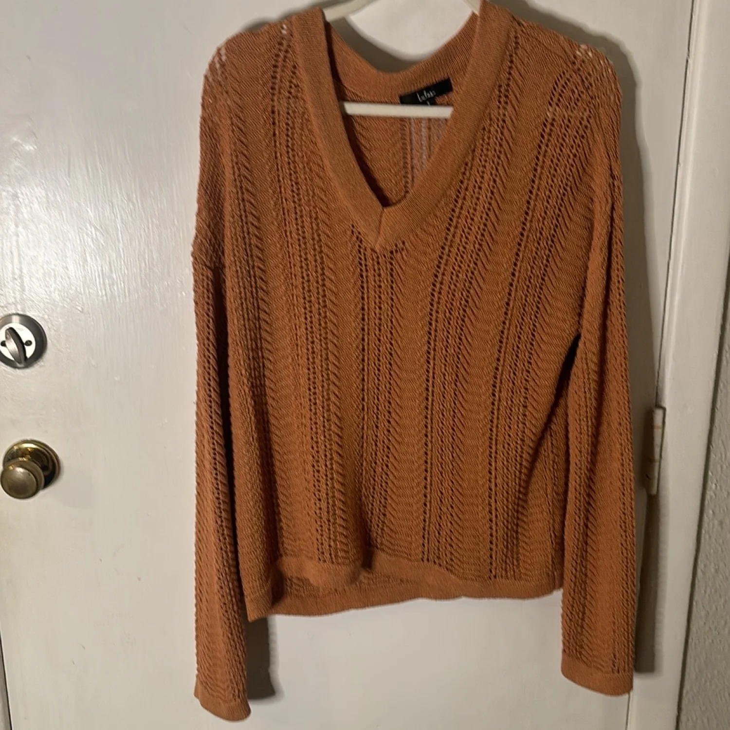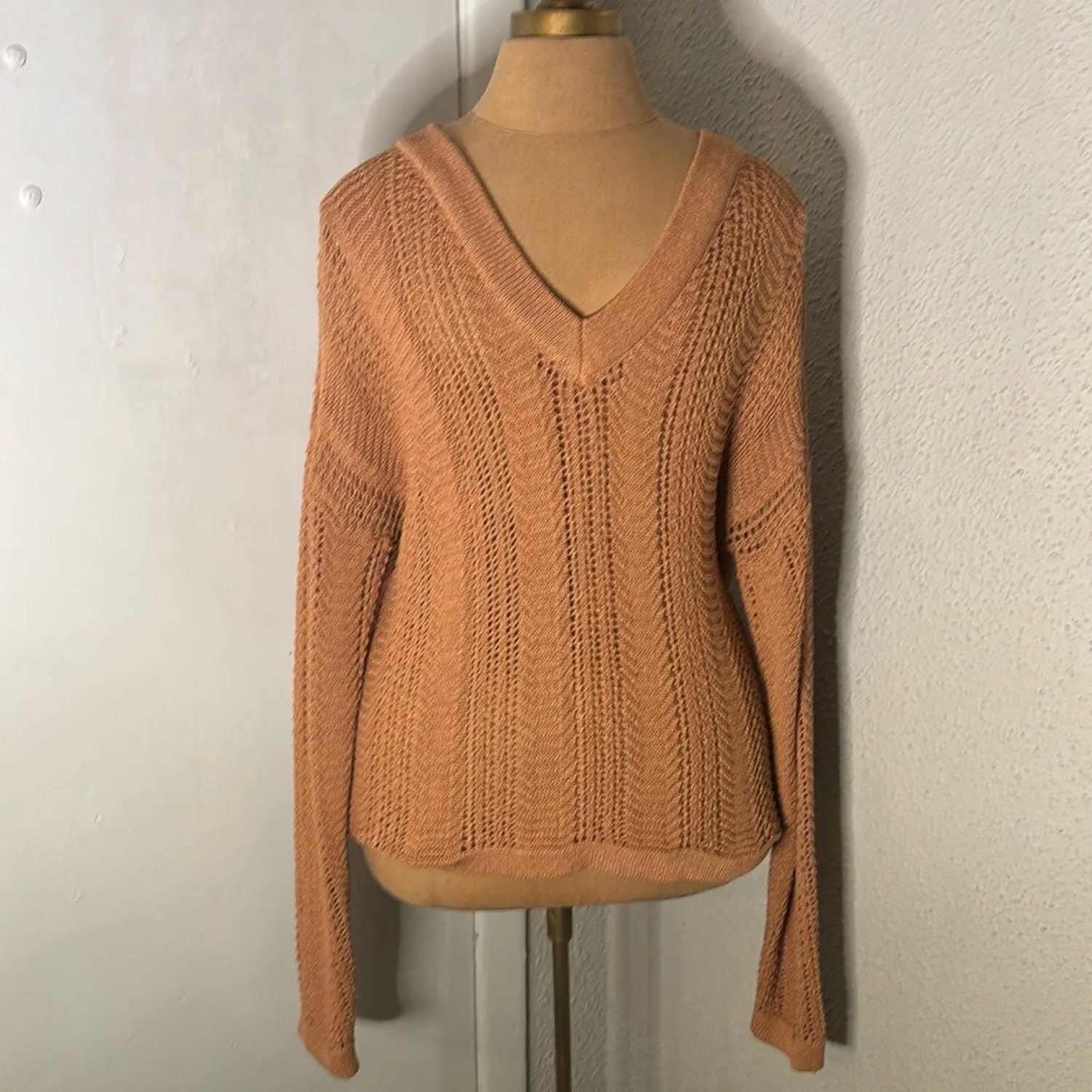 Style: Long sleeve v-neck sweater Color: Brown Size: S Armpit: 19” Length: 24” Sleeve: 31” Condition: Good 75% Acrylic 25% Nylon Hand wash