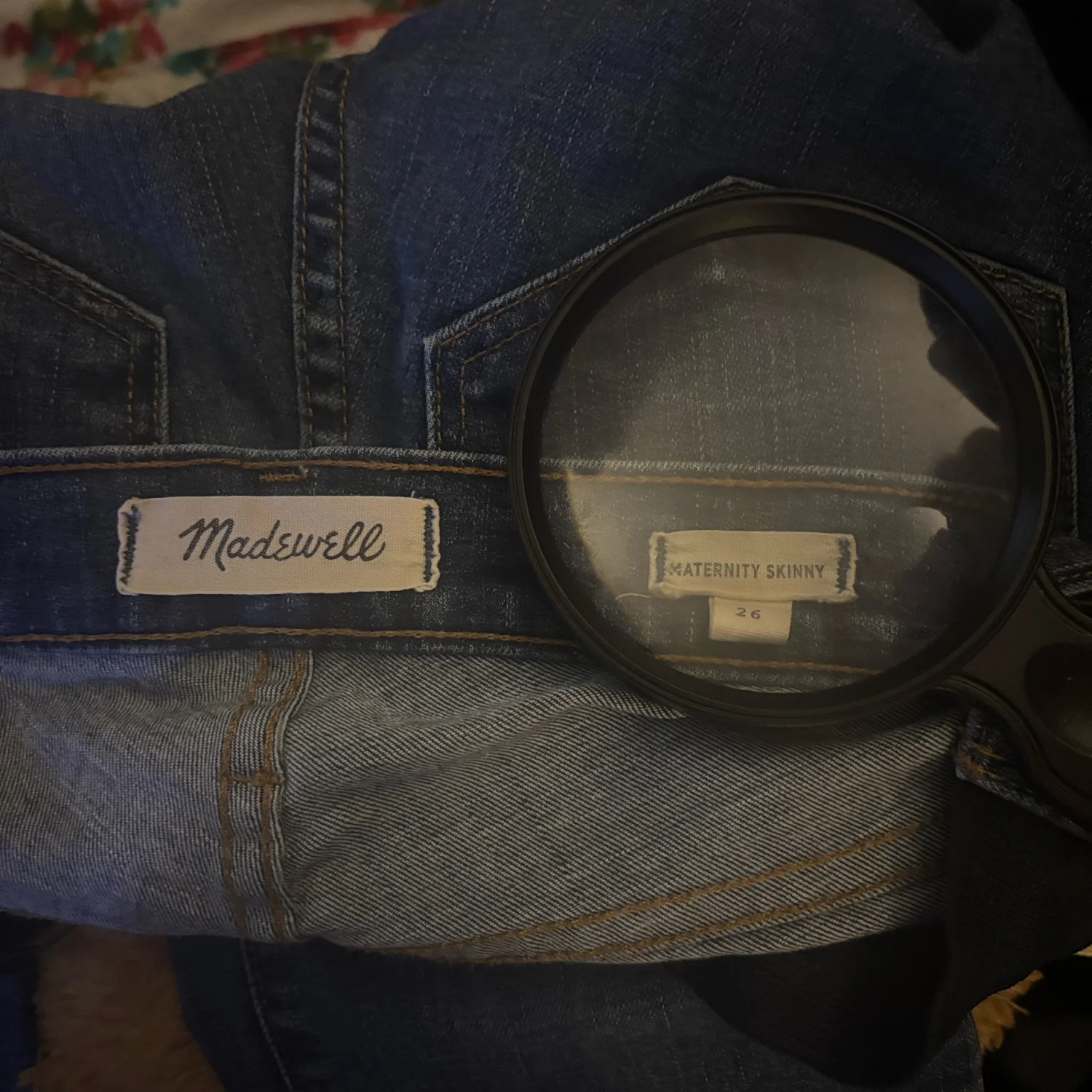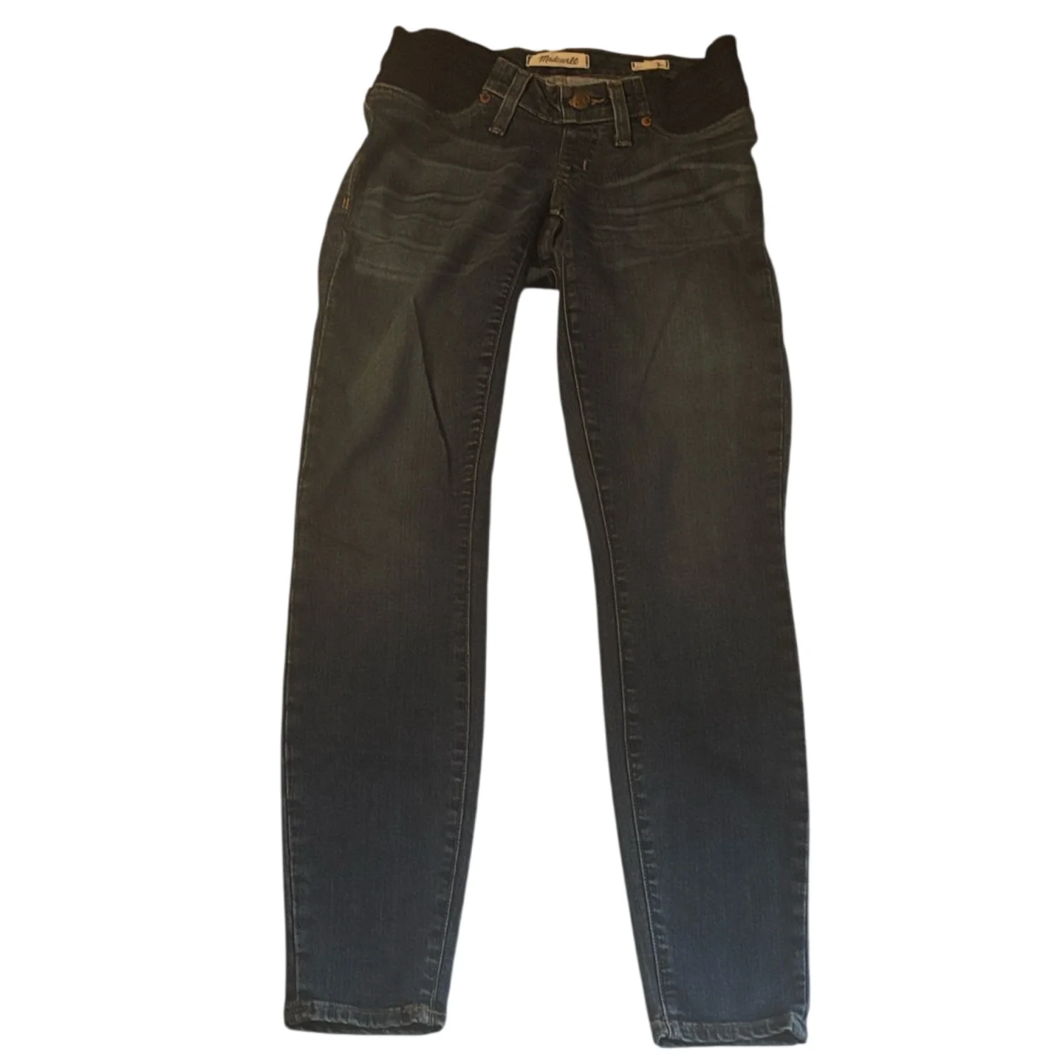Style: Slim-fitting Madewell jeggings with faded detailing. Stretch fabric for a flattering silhouette. Classic five-pocket styling and subtle whiskering. Easy-to-style dark wash for everyday wear. Color: Blue Size: 26 (Maternity) Waist: 14" Rise: 9" Inseam: 28" Condition: Good 88% Cotton 8% Polyester 4% Elastane Machine wash