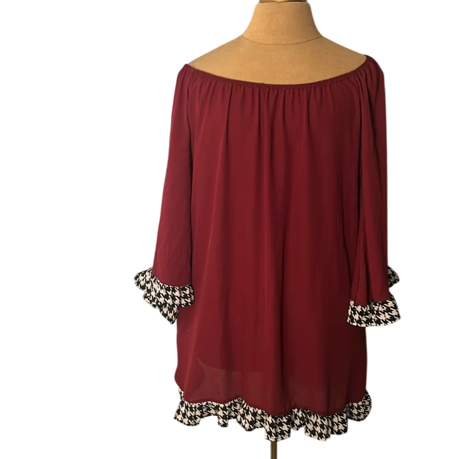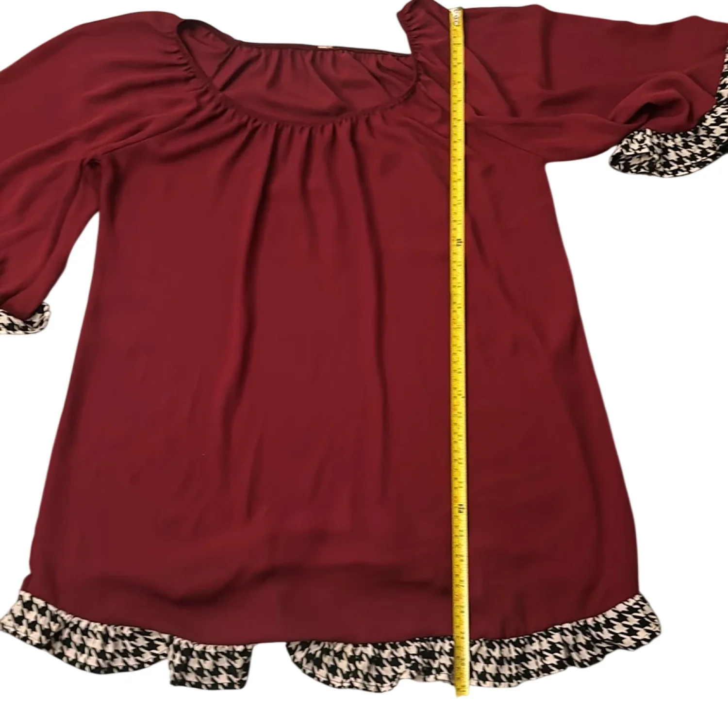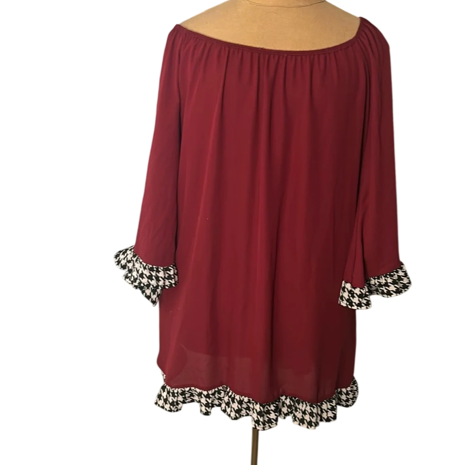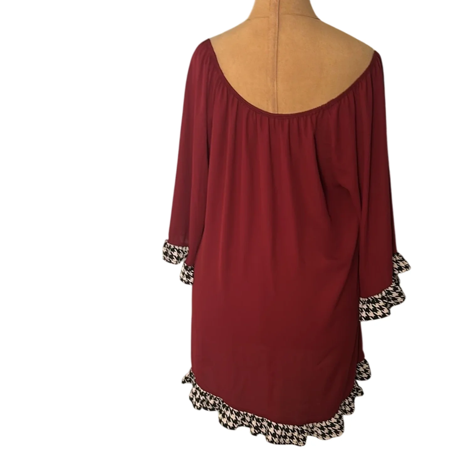 Style: Boat neck dress with houndstooth sleeves and hem Color: Maroon/ Black/White Size: No size please check measurements Armpit: 21" Length: 31" Condition: Good No care tags