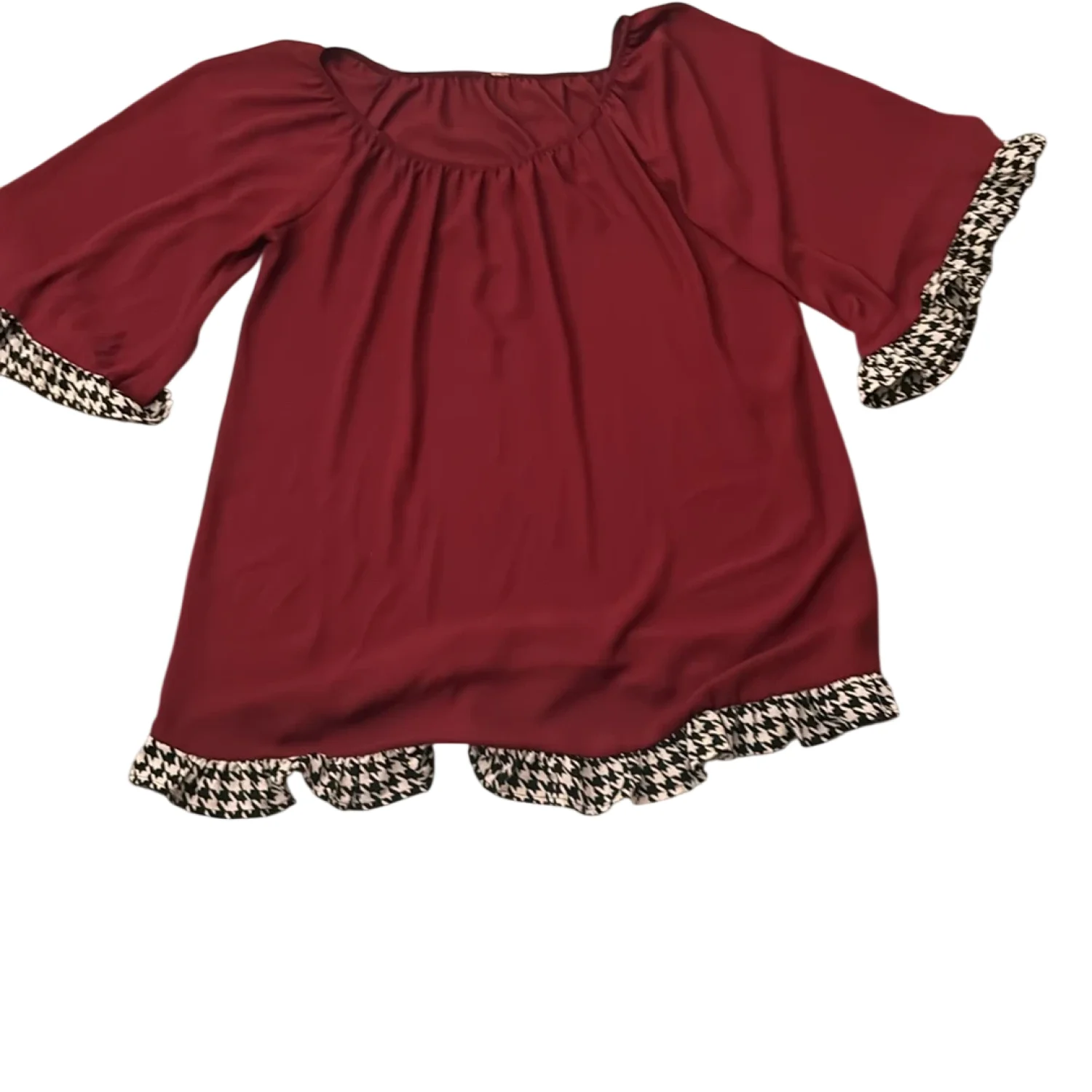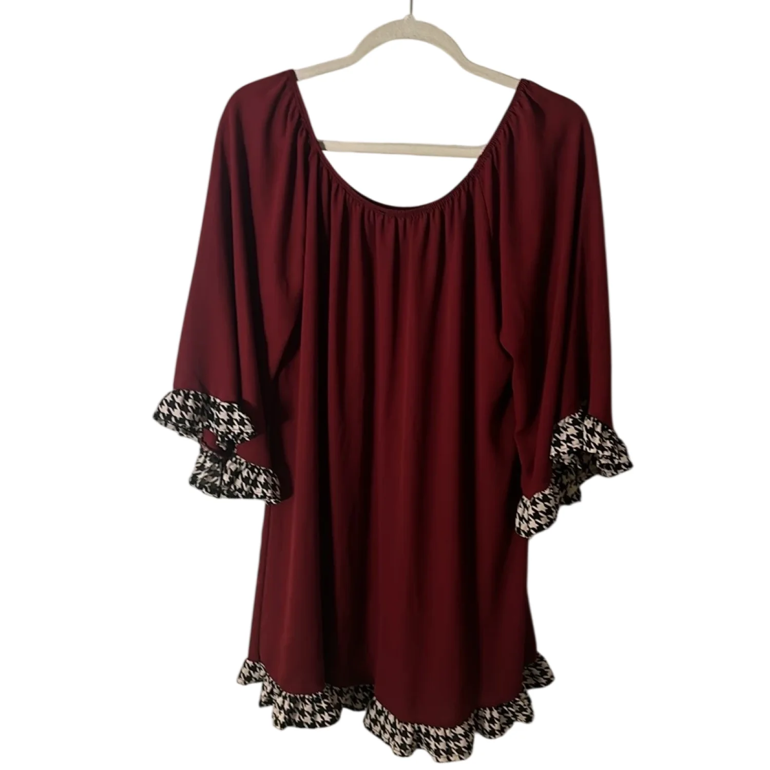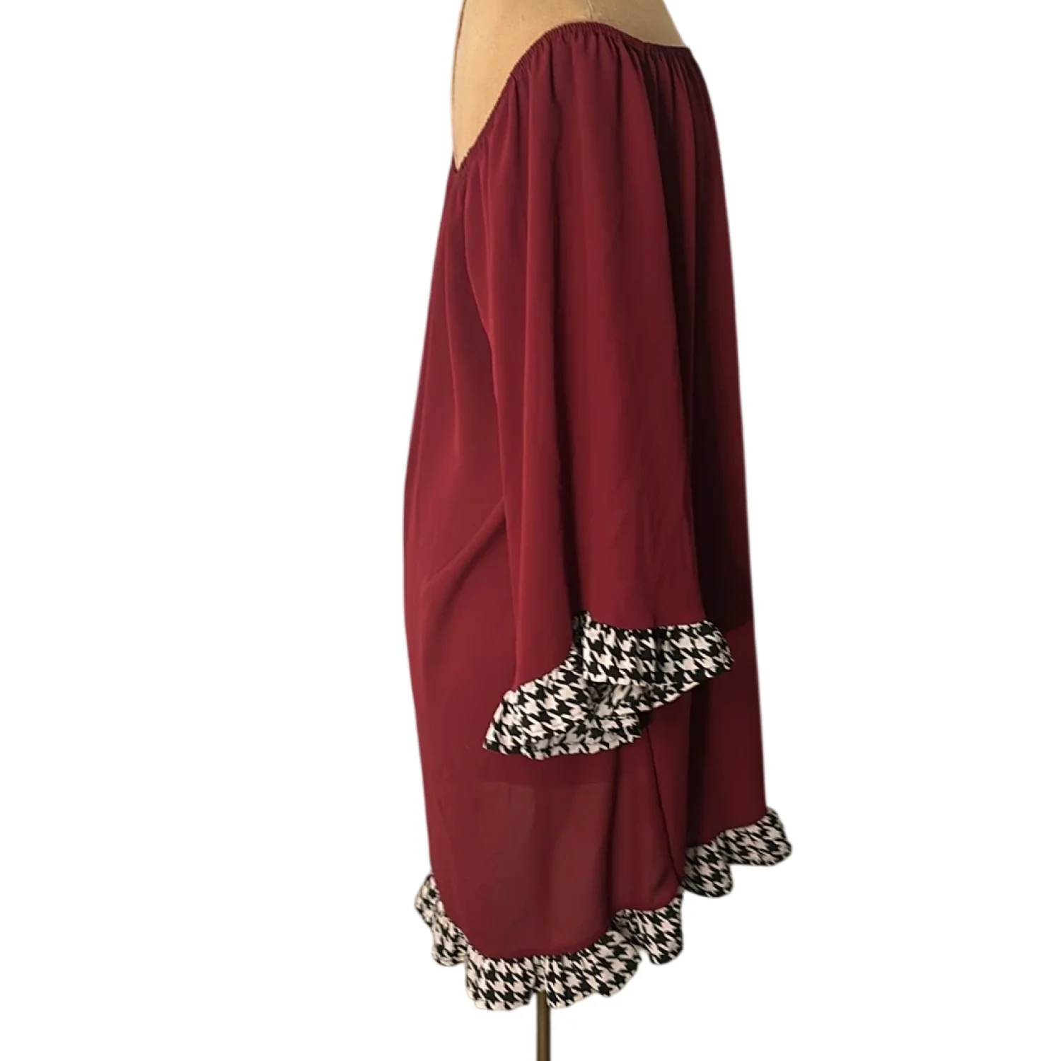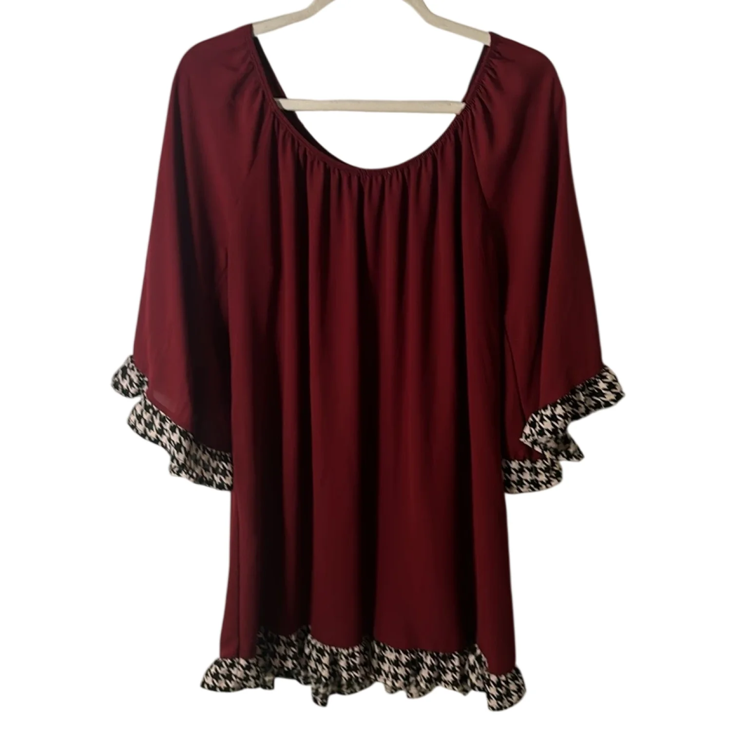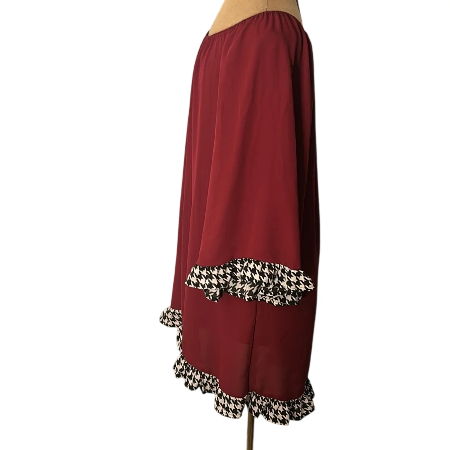 Style: Boat neck dress with houndstooth sleeves and hem Color: Maroon/ Black/White Size: No size please check measurements Armpit: 21" Length: 31" Condition: Good No care tags