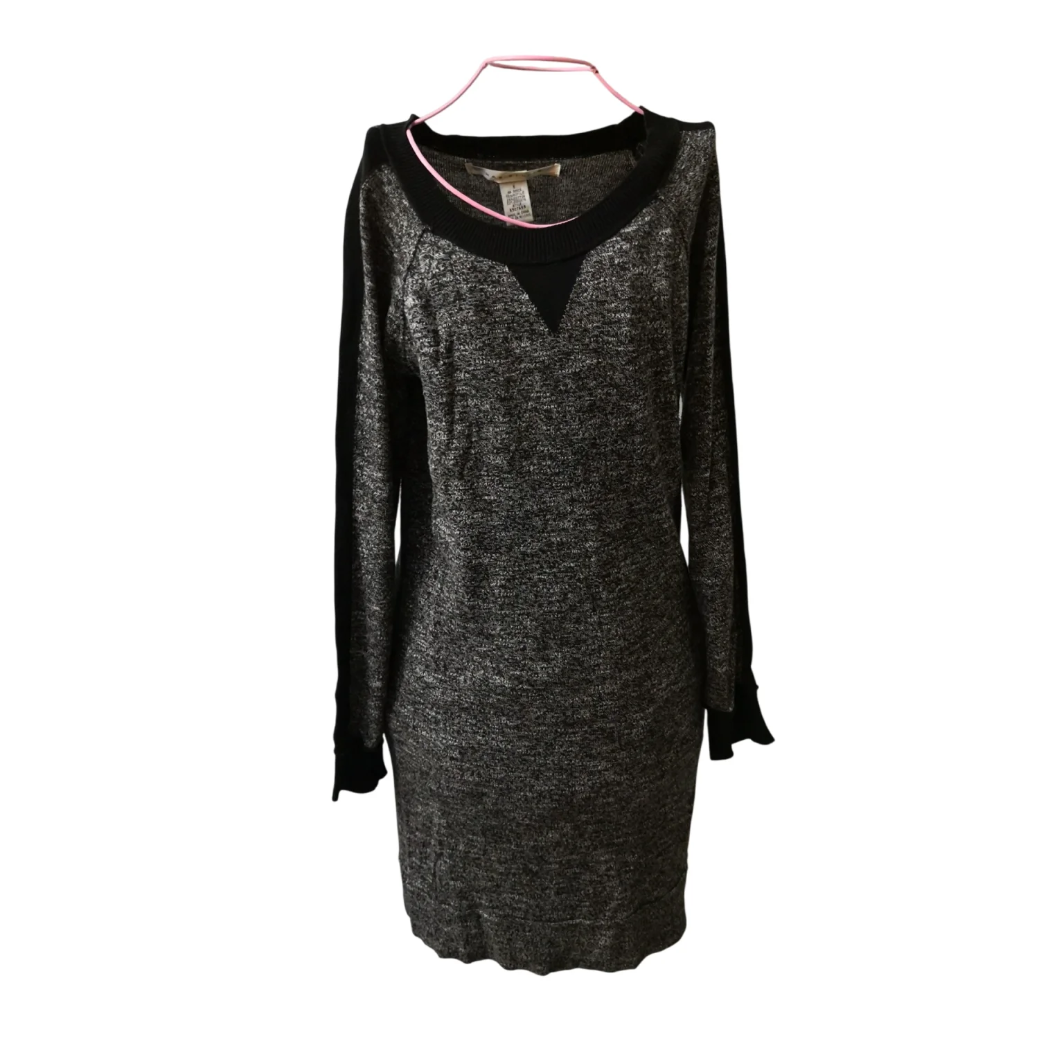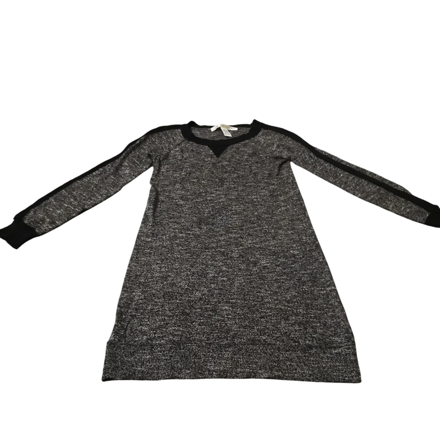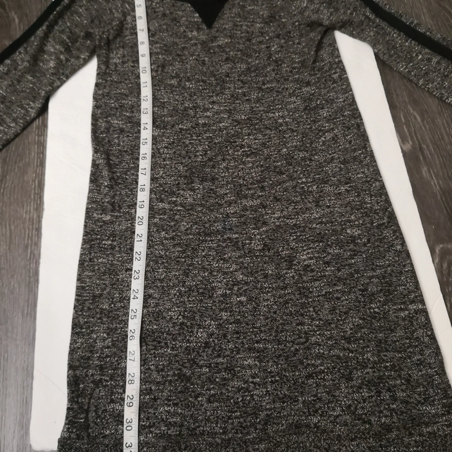 Style: Sweater dress with contrast color at sleeves and neck Color: Gray with black trim Size: S Armpit: 16” Length: 33” Condition: Good 75% Acrylic 25% Cotton Machine wash cold, gentle cycle