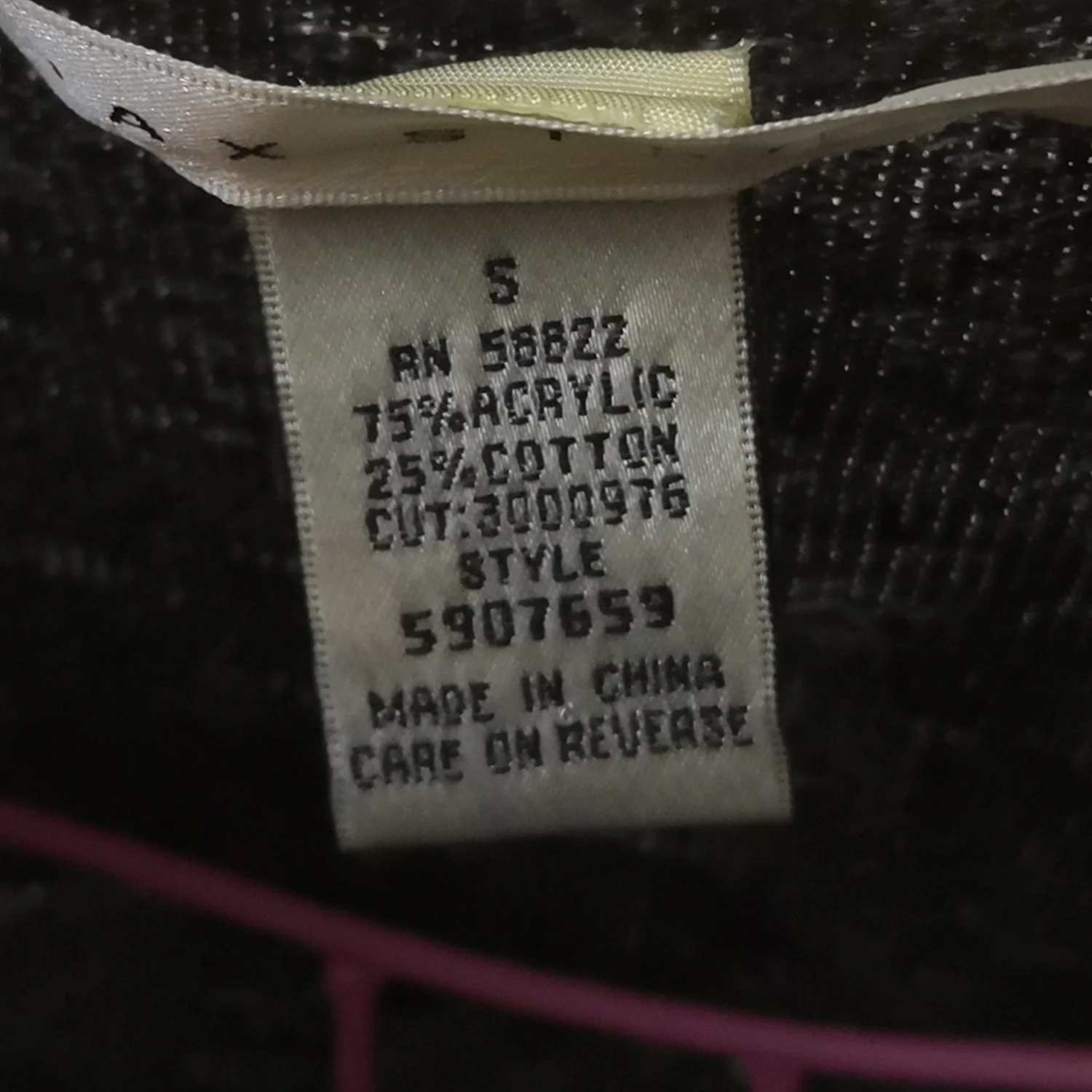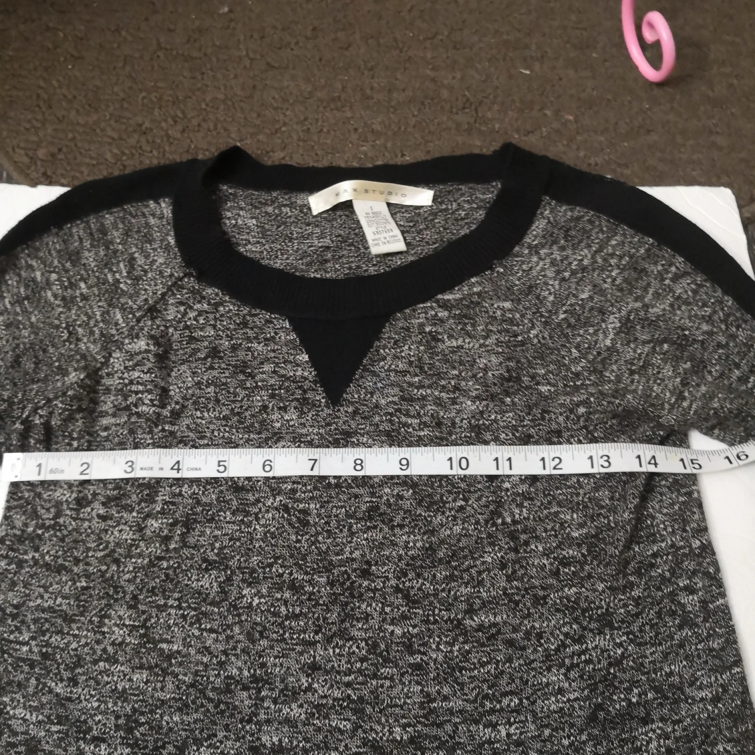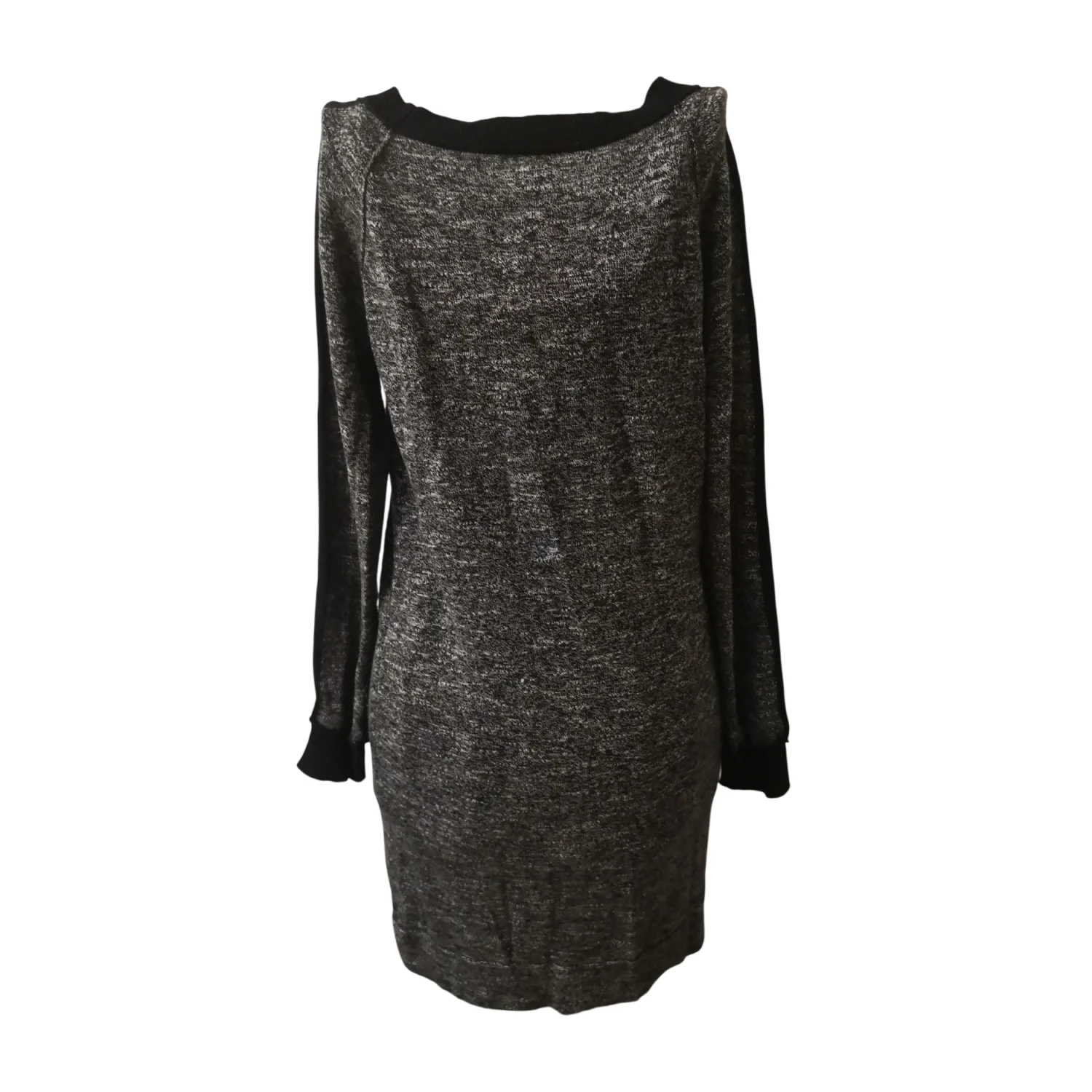 Style: Sweater dress with contrast color at sleeves and neck Color: Gray with black trim Size: S Armpit: 16” Length: 33” Condition: Good 75% Acrylic 25% Cotton Machine wash cold, gentle cycle