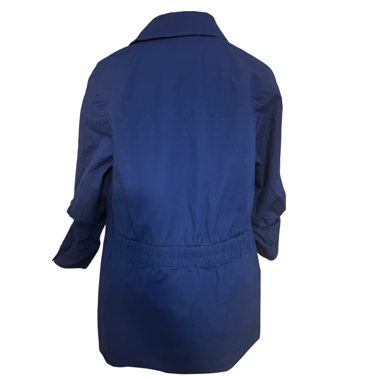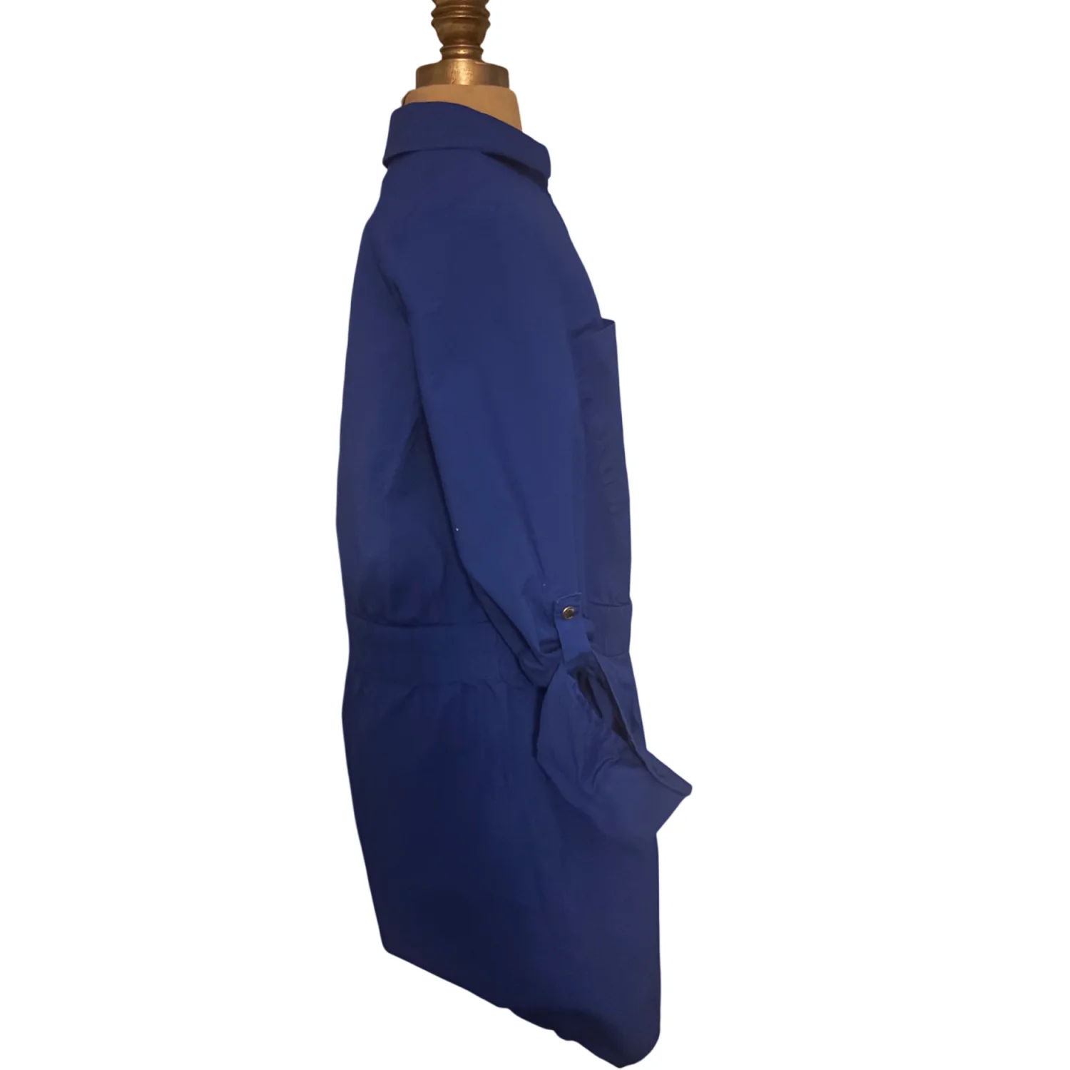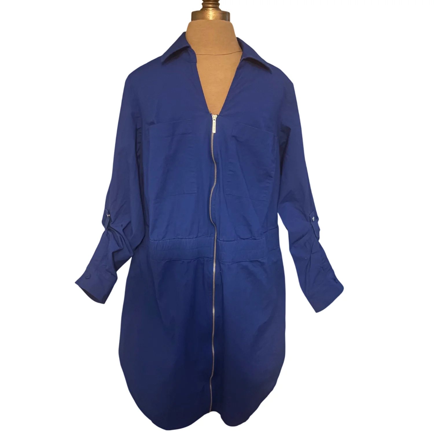 Style: Short sleeve shirt dress with full front zip & pockets Color: Royal Blue Size: OX Armpit: 20" Waist: 20" Length: 40" Sleeve: 31" Condition: Good Cotton blend material
