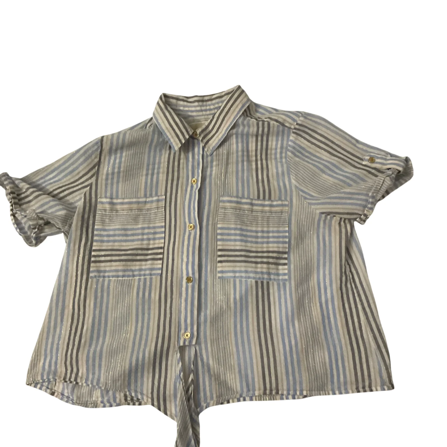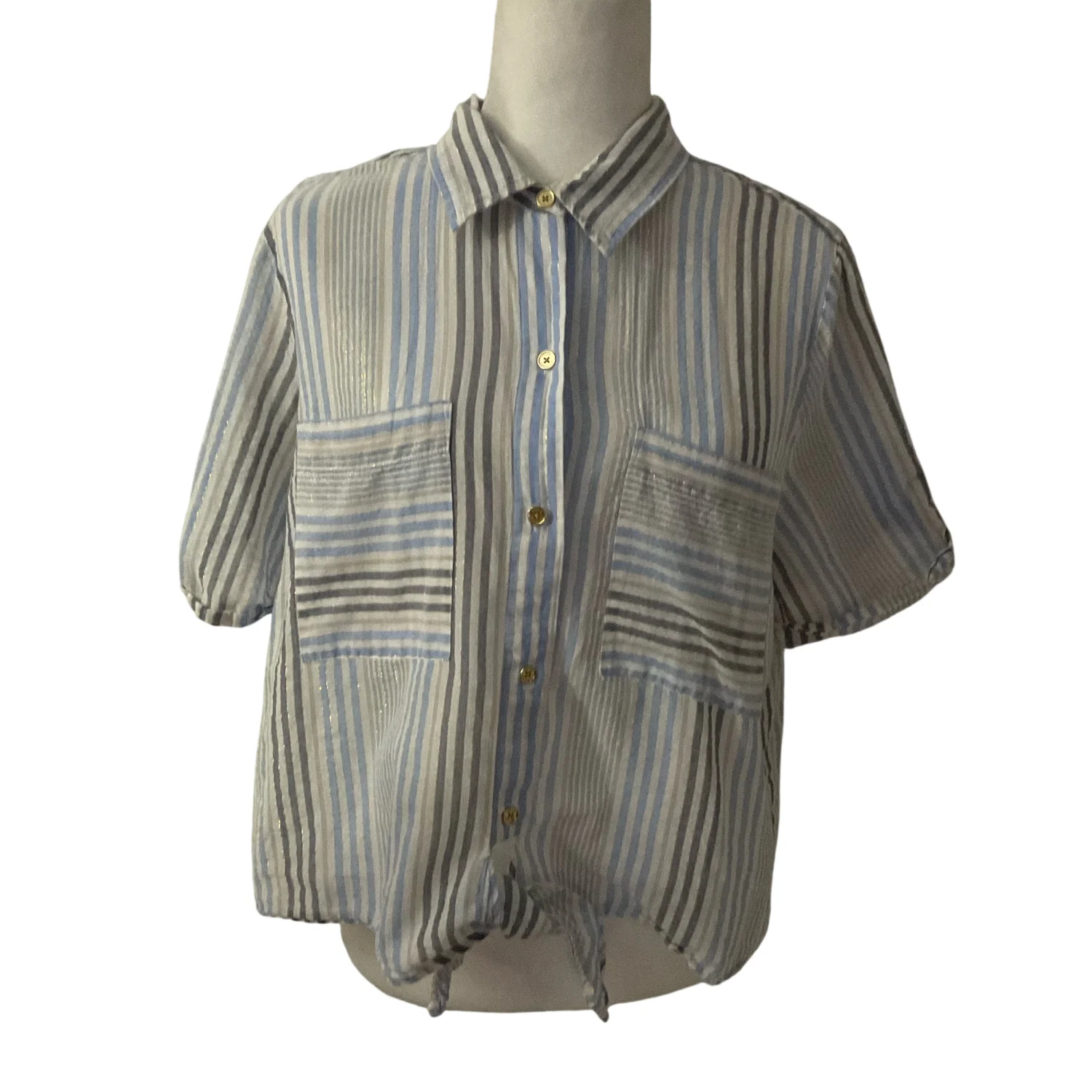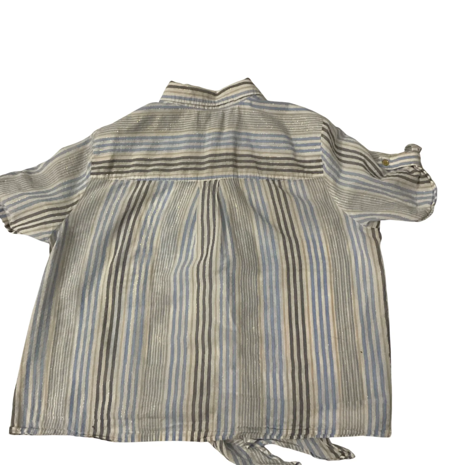 Style: Cropped short sleeve , neutral striped blouse with tie front Color: Blue/Gold/White Size: XL Armpit: 21" Length: 22" Condition: Good Polyester material