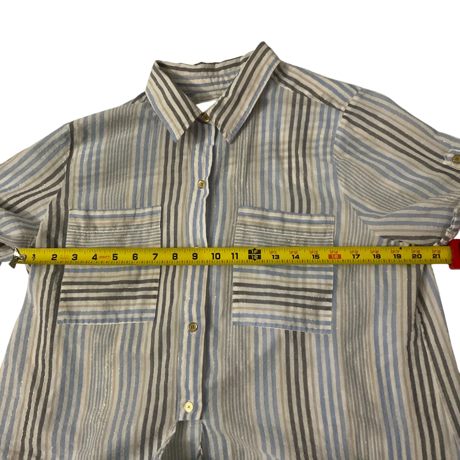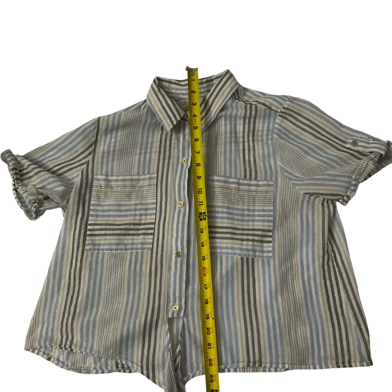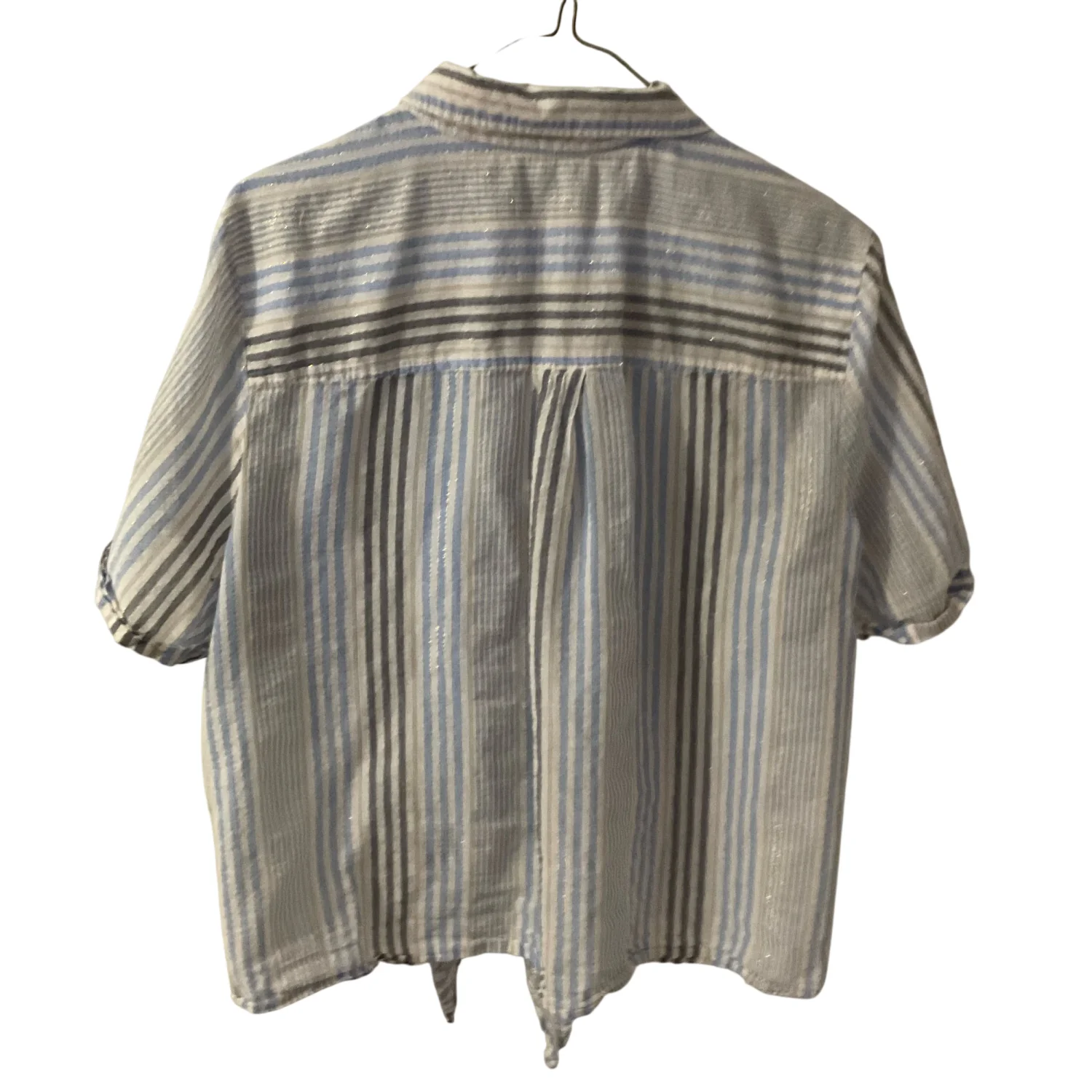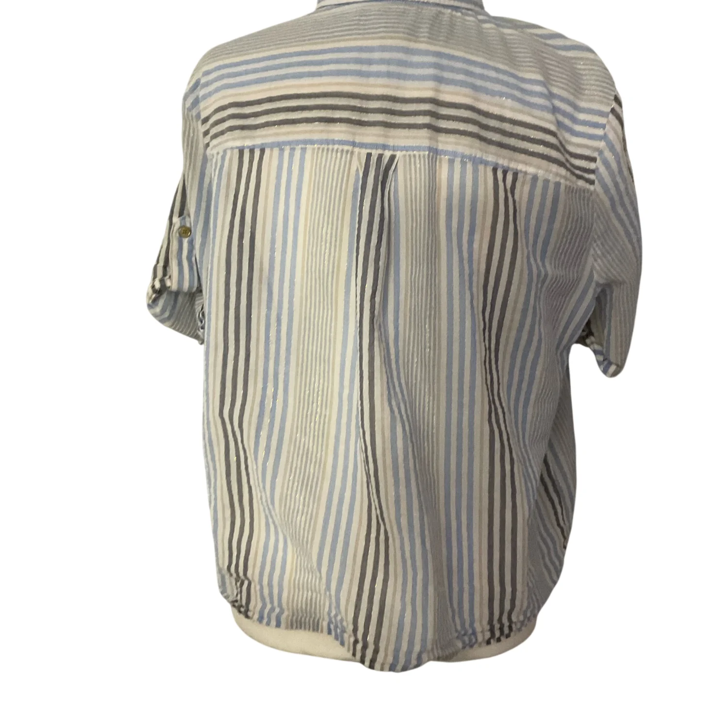 Style: Cropped short sleeve , neutral striped blouse with tie front Color: Blue/Gold/White Size: XL Armpit: 21" Length: 22" Condition: Good Polyester material