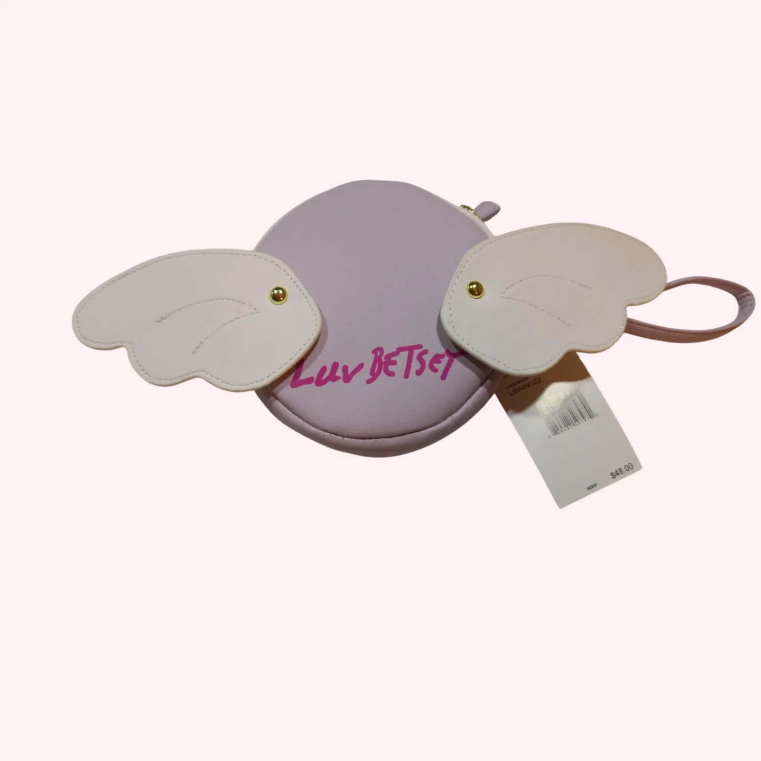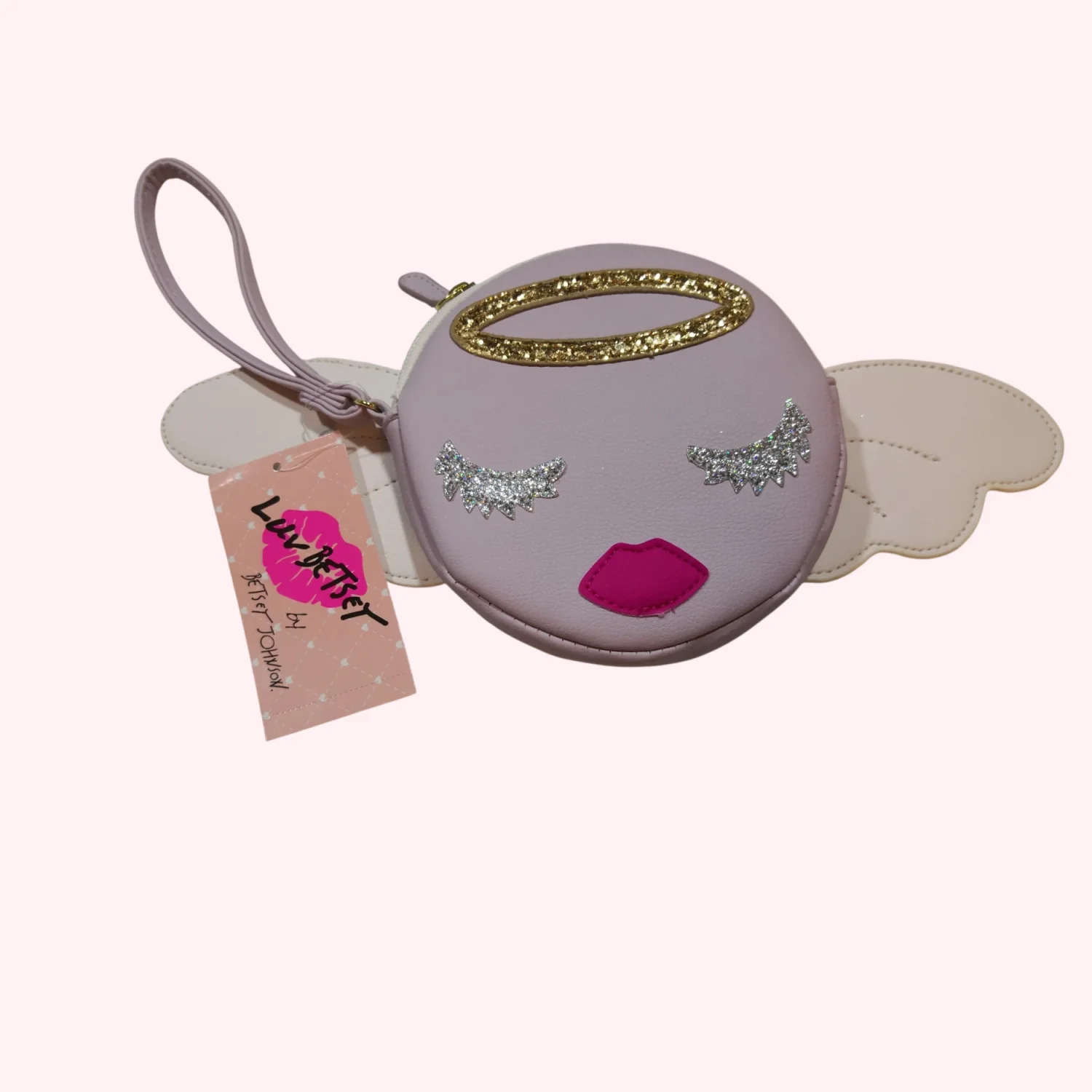 Style: Luv Betsey Johnson Angel/Cherub Emoji w/Wings Coin Purse Wristlet Bag Color: Lavender Condition: New w/tags Zip closure Wipe with damp cloth to clean