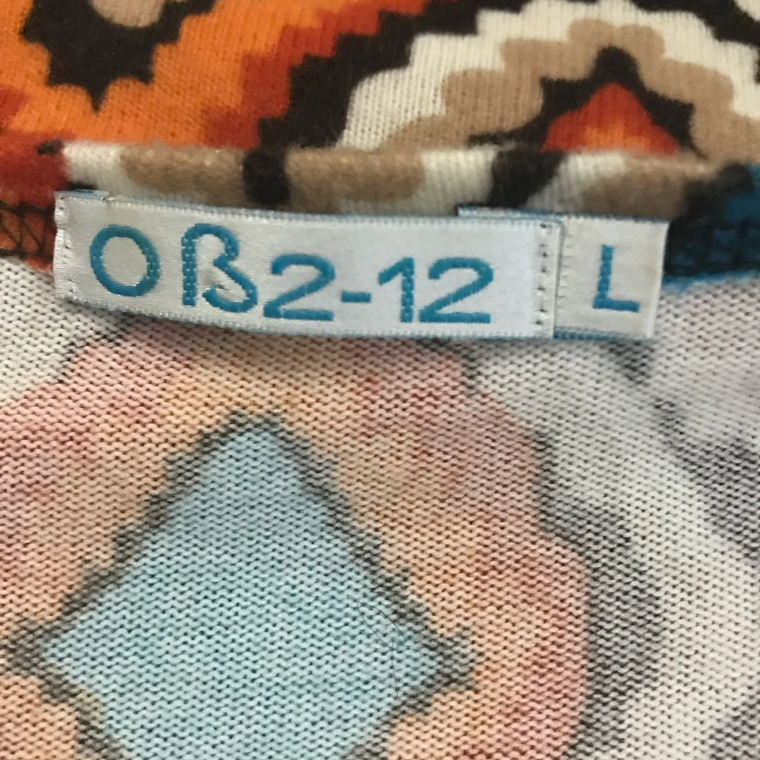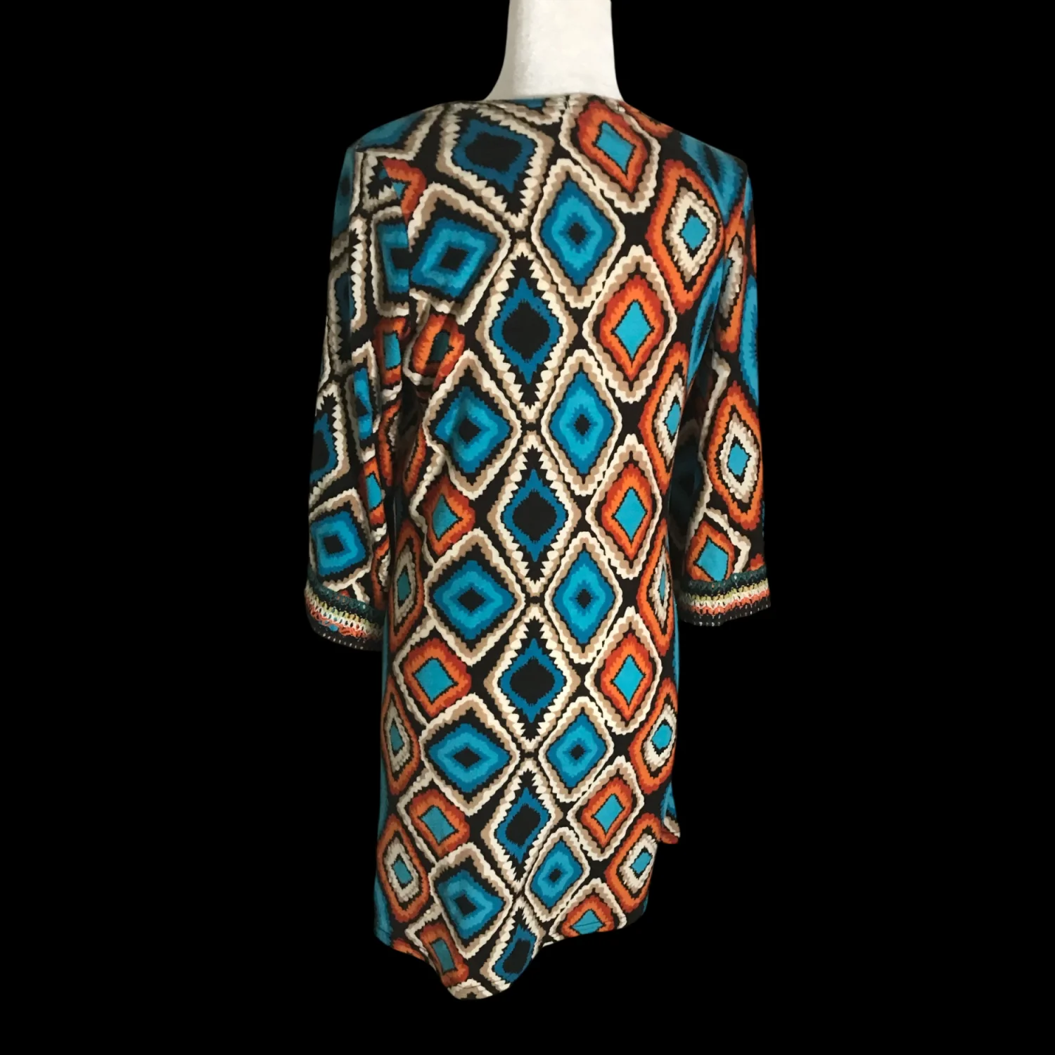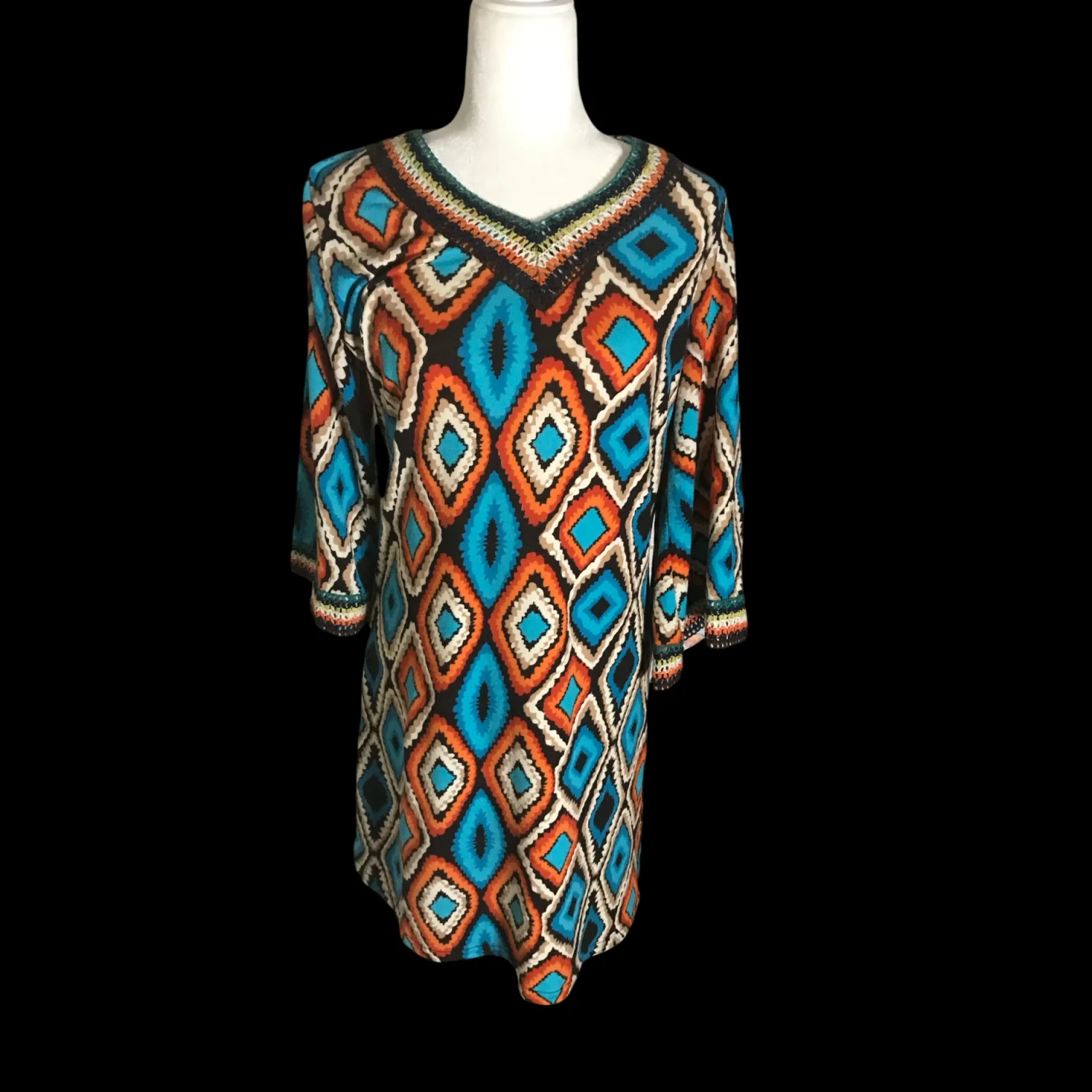 Style: V- Neck casual comfy mini shift dress Color: Turquoise/Orange/Brown Size: L Armpit: 18" Length: 35" Condition: Good with flaws, loose threads shown in last pics 93% Polyester 7% Elastane