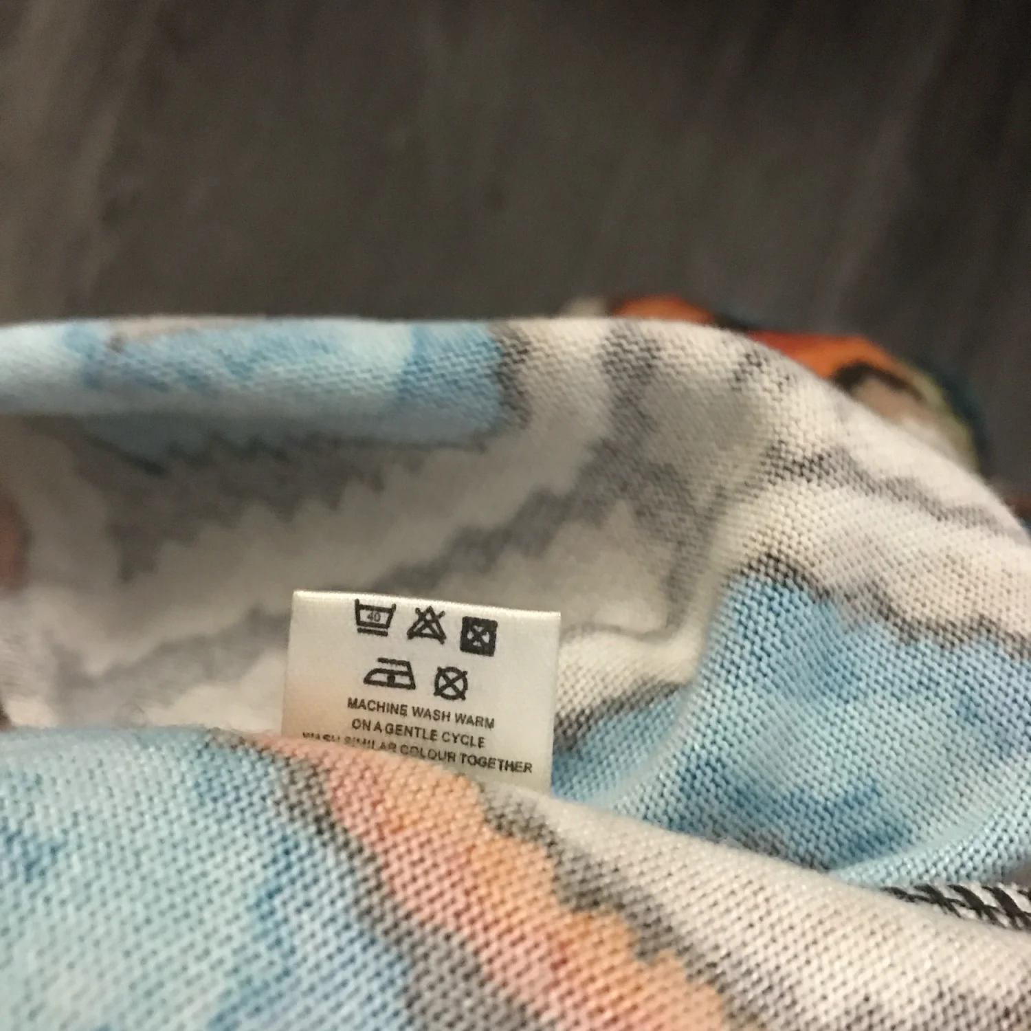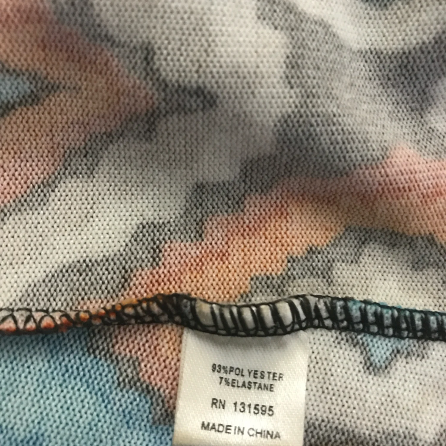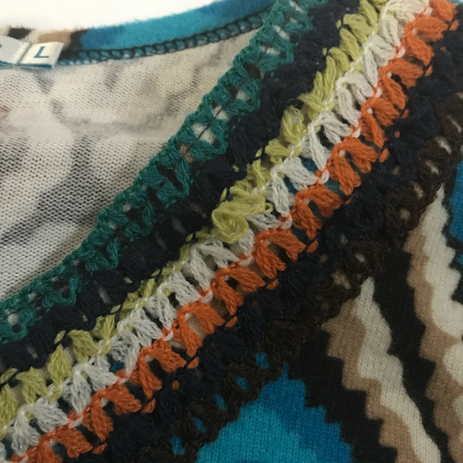 Style: V- Neck casual comfy mini shift dress Color: Turquoise/Orange/Brown Size: L Armpit: 18" Length: 35" Condition: Good with flaws, loose threads shown in last pics 93% Polyester 7% Elastane
