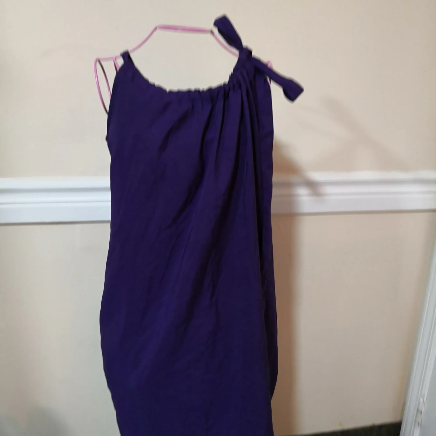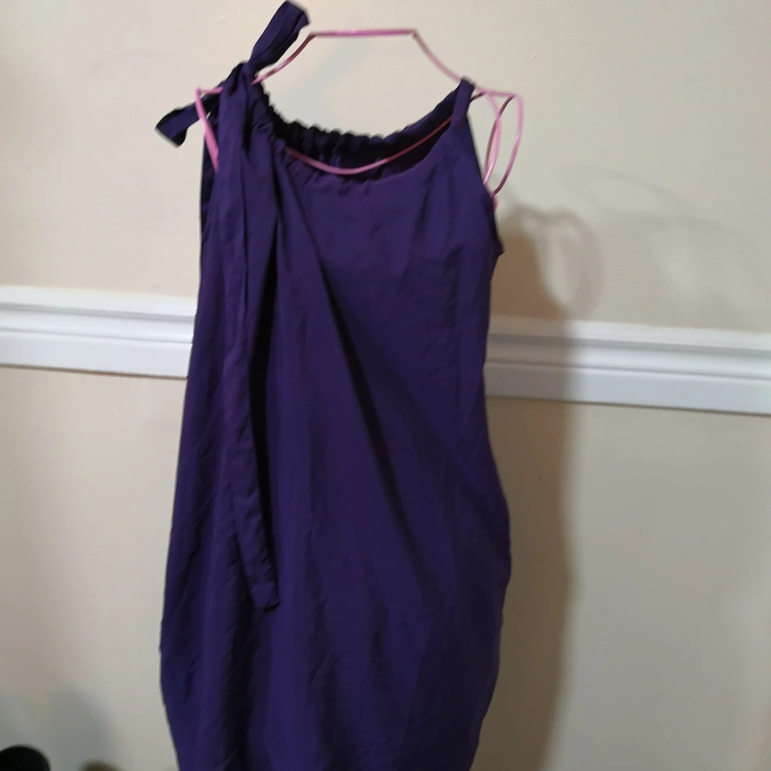 Style: Midi shift dress with one adjustable tie shoulder and two hidden pockets Color: Deep purple Size: M Armpit: 19" Waist: 21" Length: 30" 100% Polyester Machine wash cold