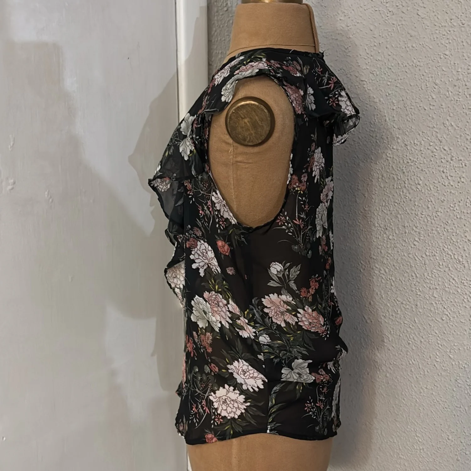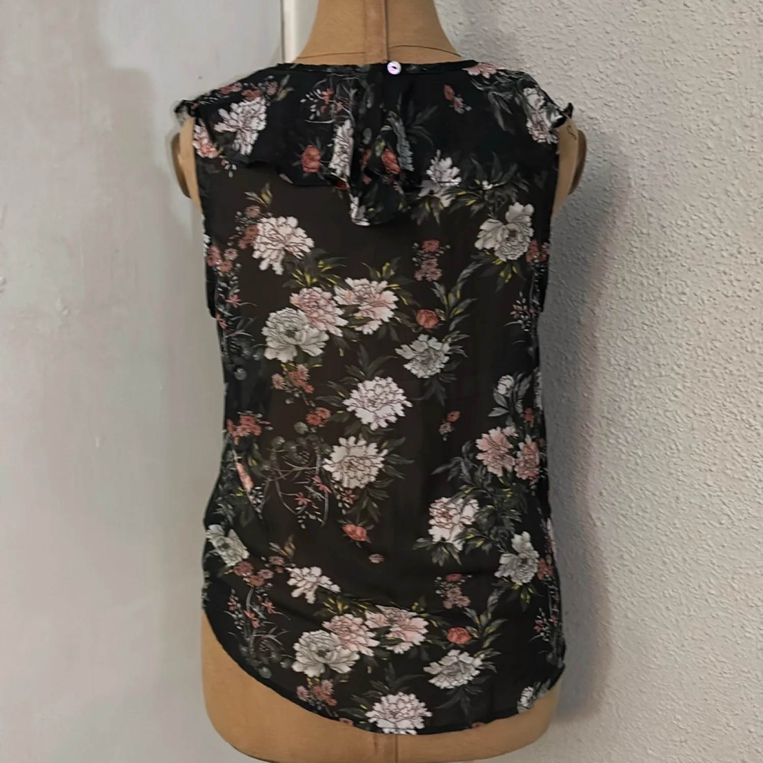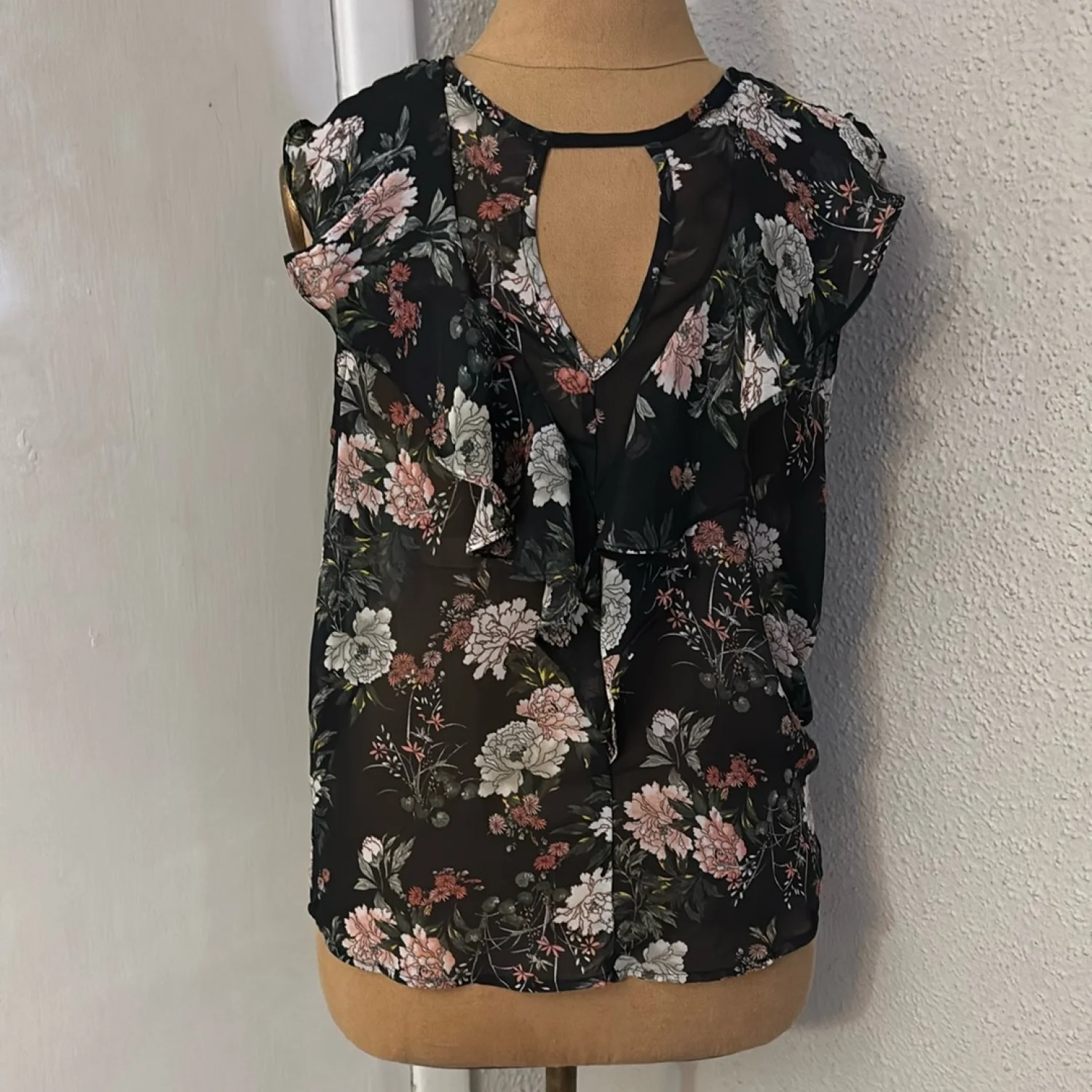 Style: Floral high low sheer ruffle blouse with keyhole front and buttonhole closure Color: Black/Multicolor Size: S Armpit: 17” Length: 24” Condition: Good 100% Polyester Hand wash