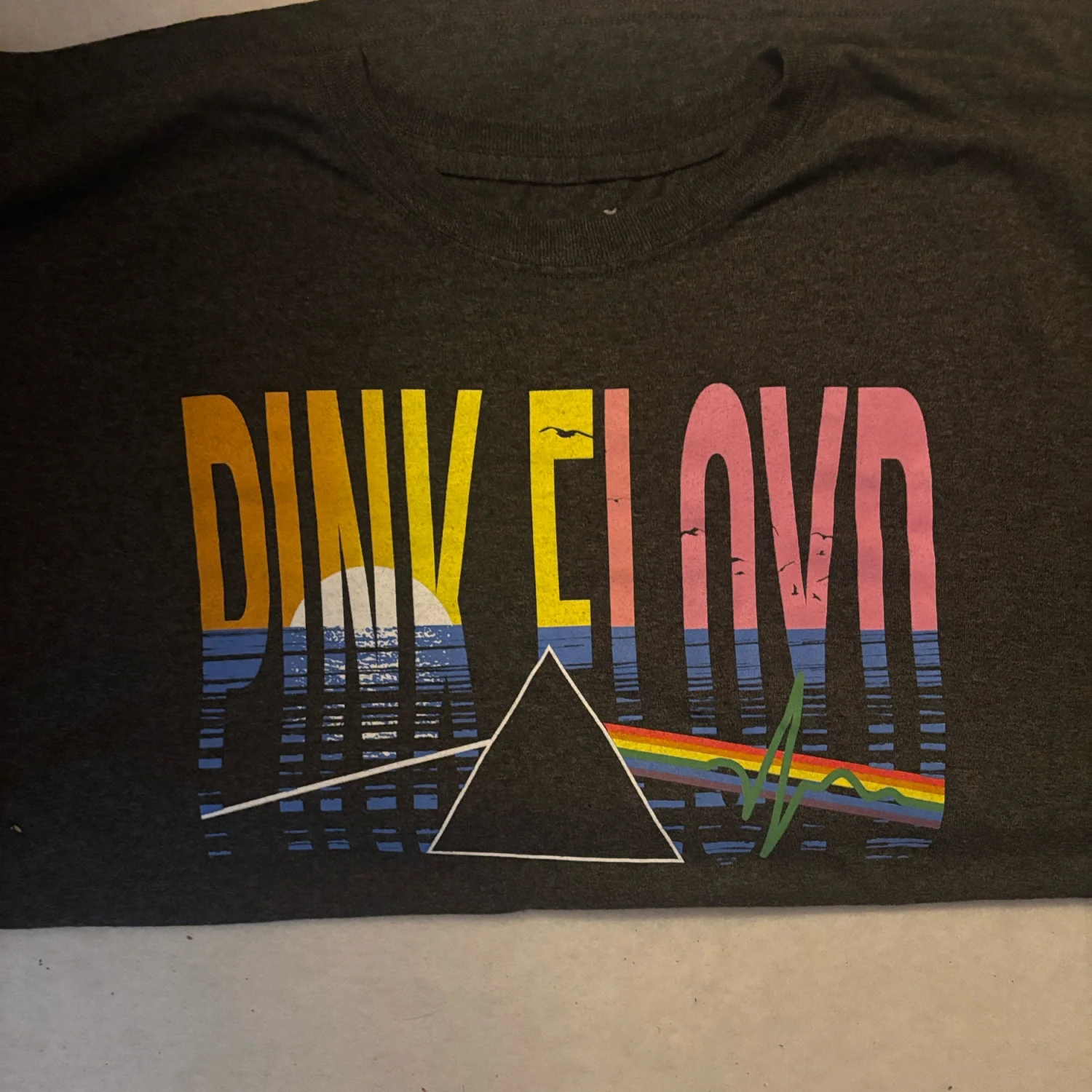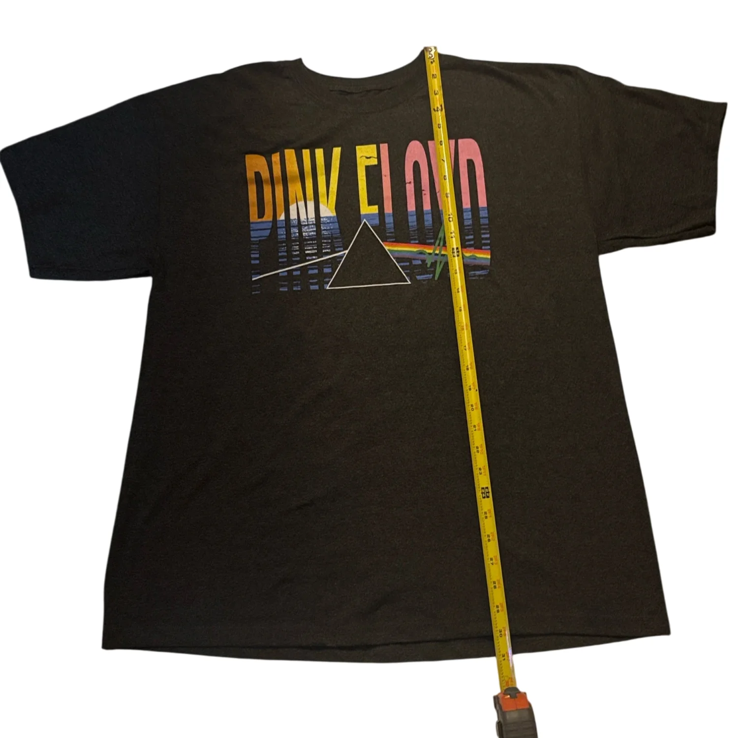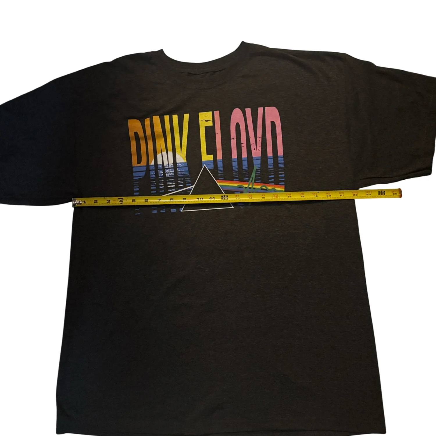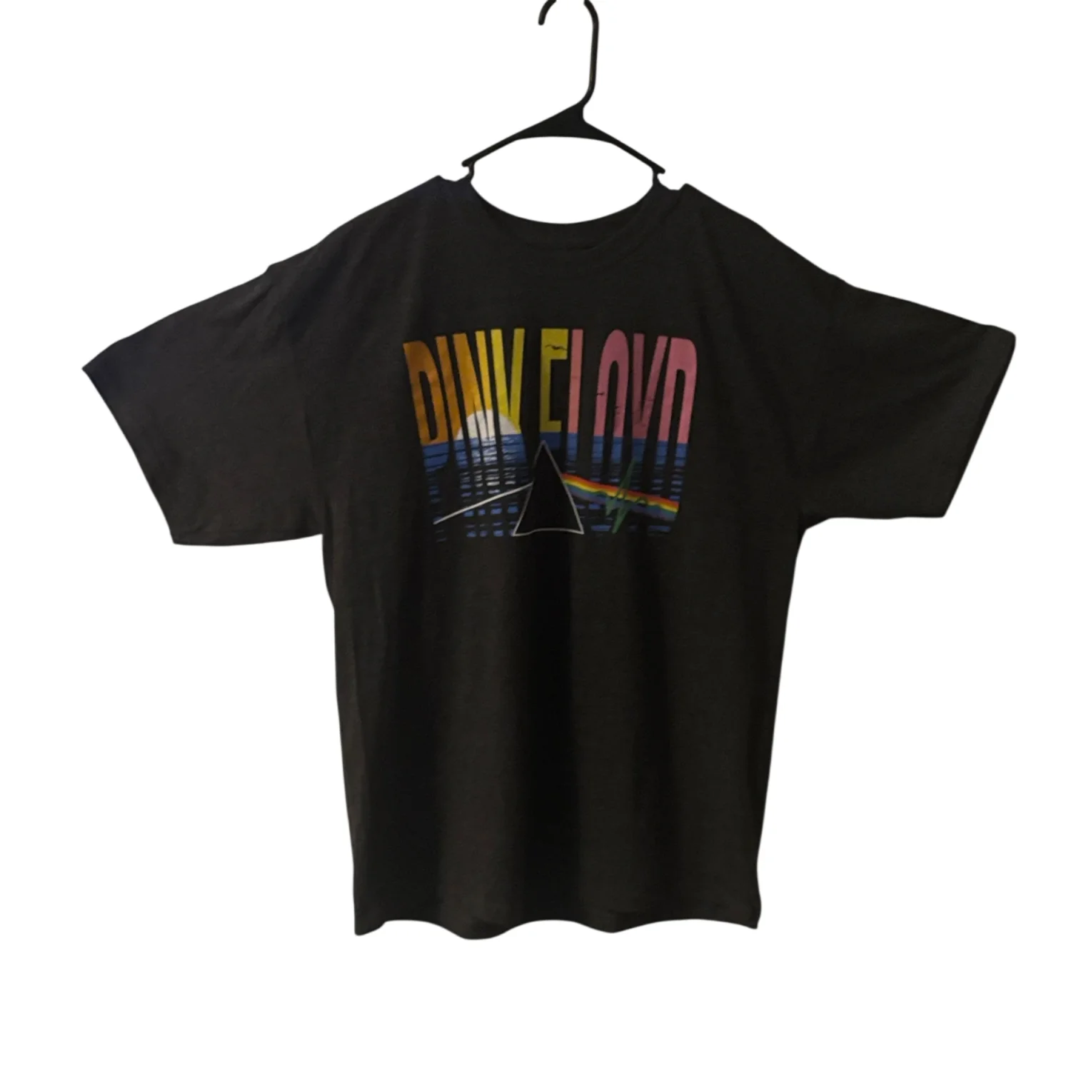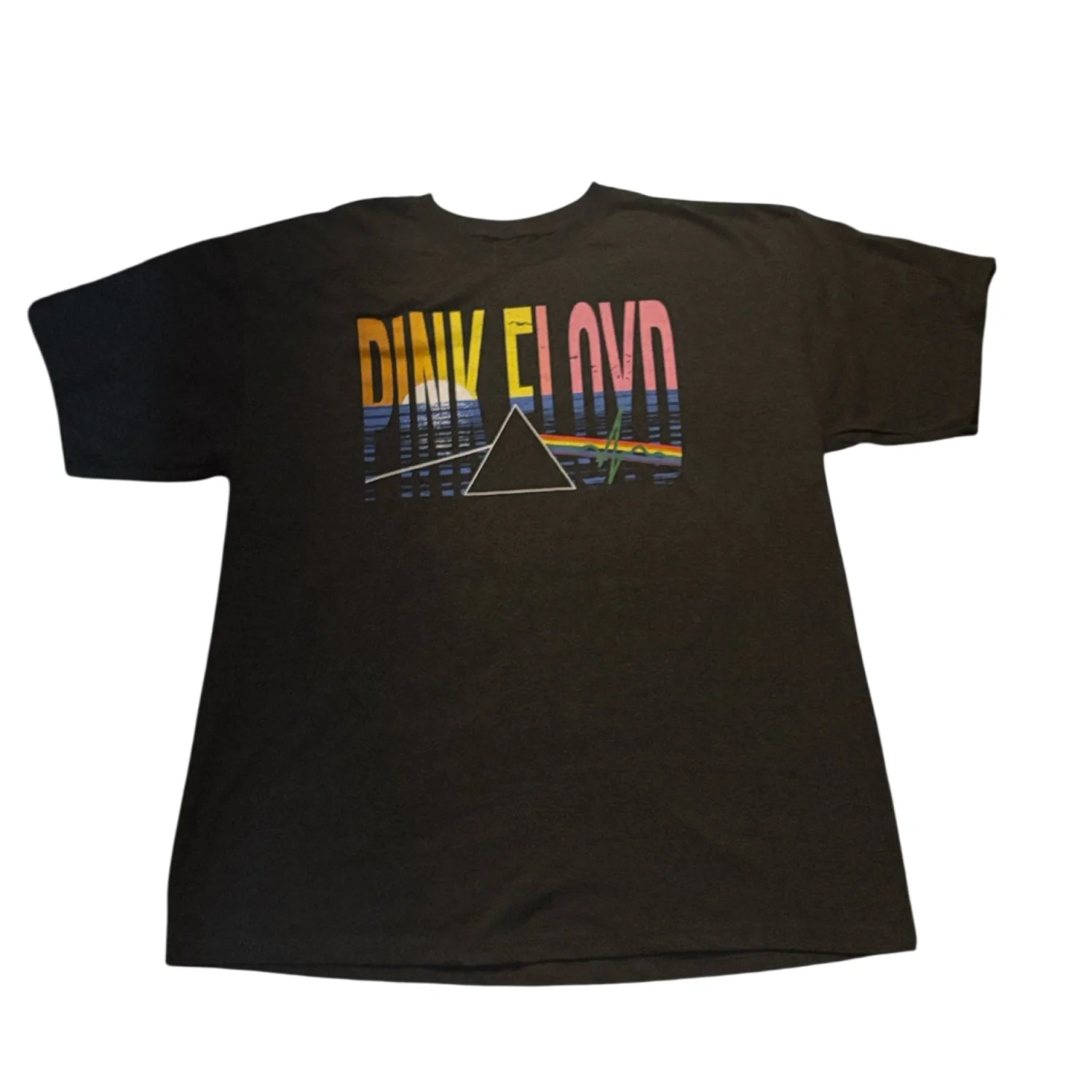 Style: Grey Pink Floyd t-shirt with bold multicolor band artwork. Features yellow sun, blue waves and pink lettering. Classic band-prism motif across chest. Color: Grey Size: XL Armpit: 22" Length: 31" Condition: New without tags 50% Cotton 50% Polyester Machine wash cold