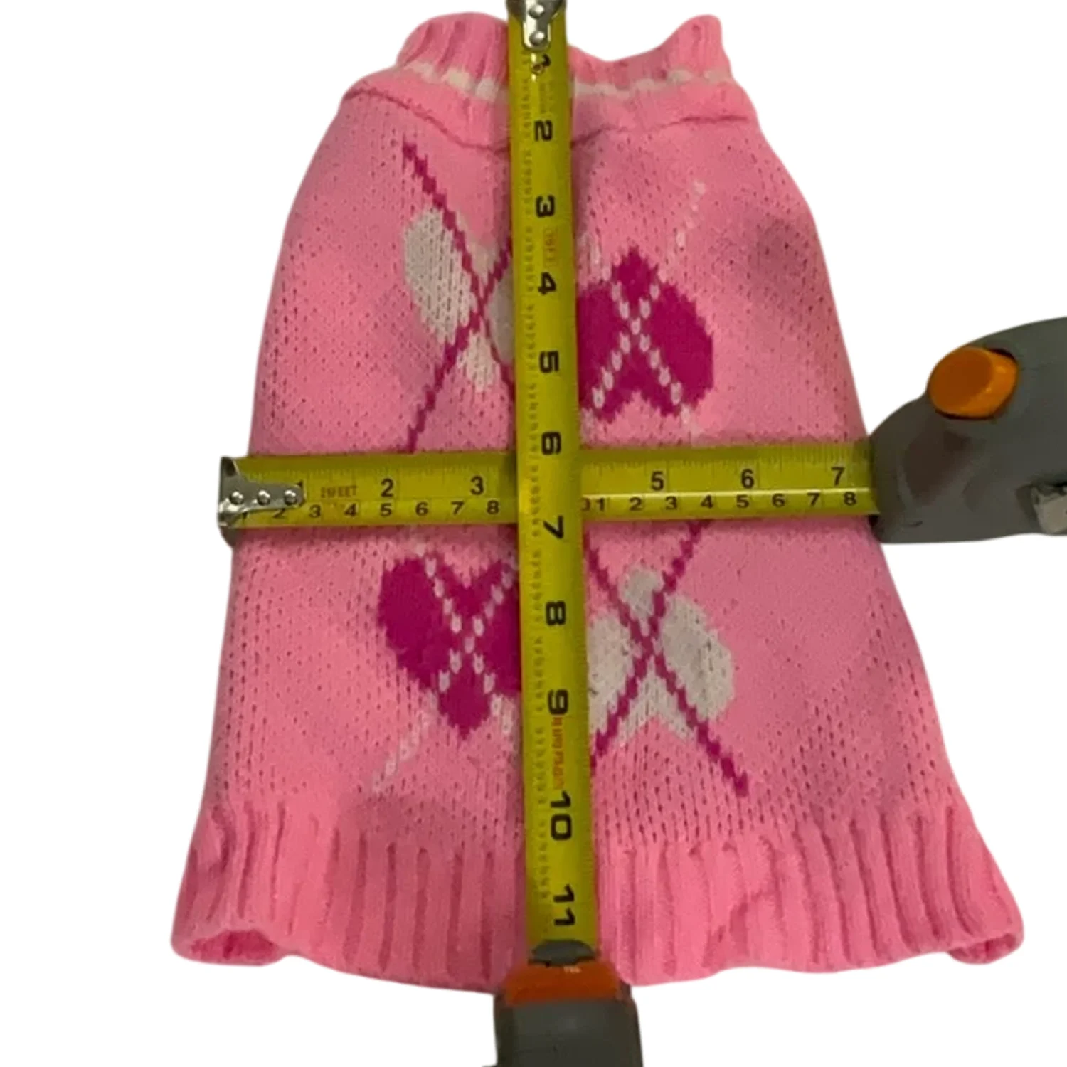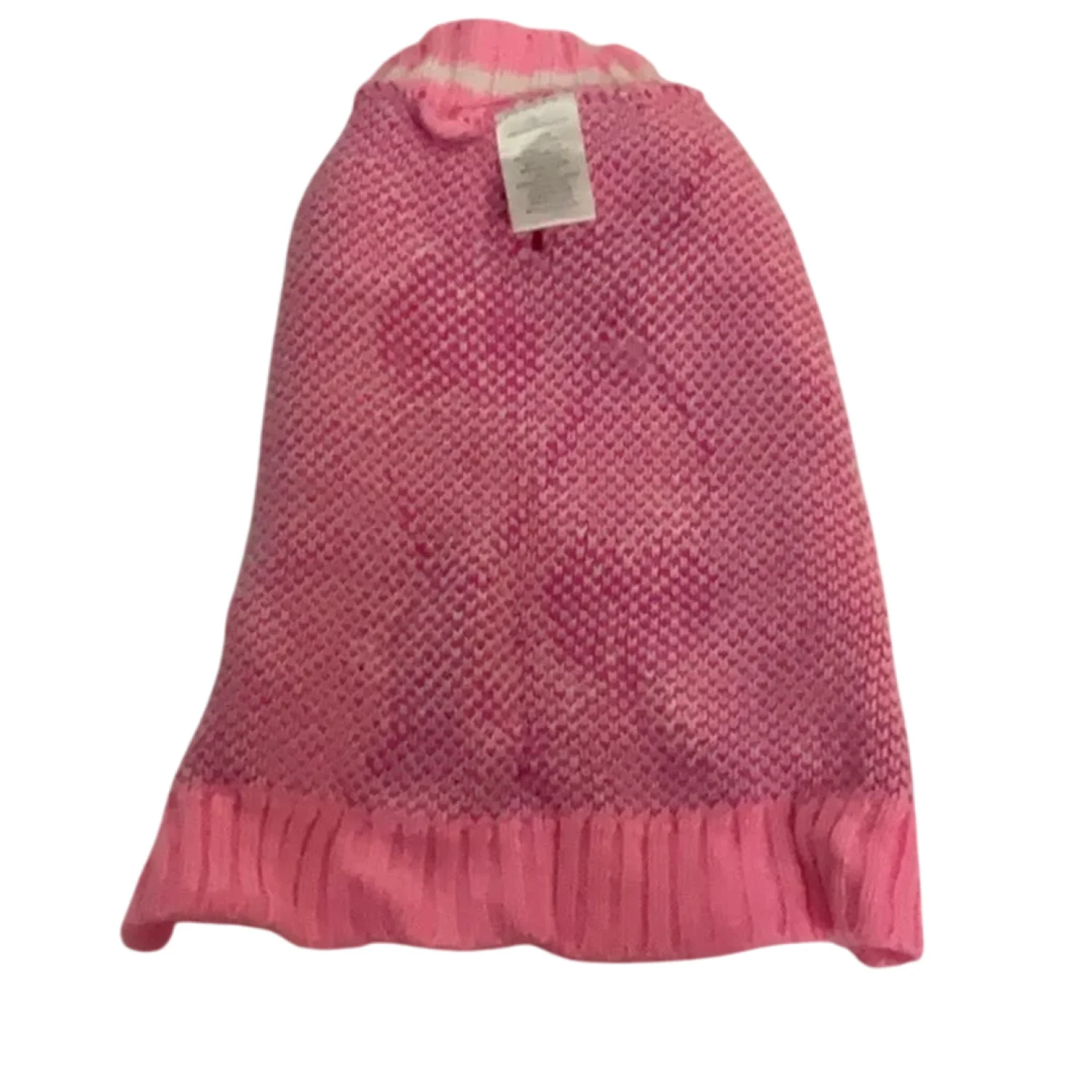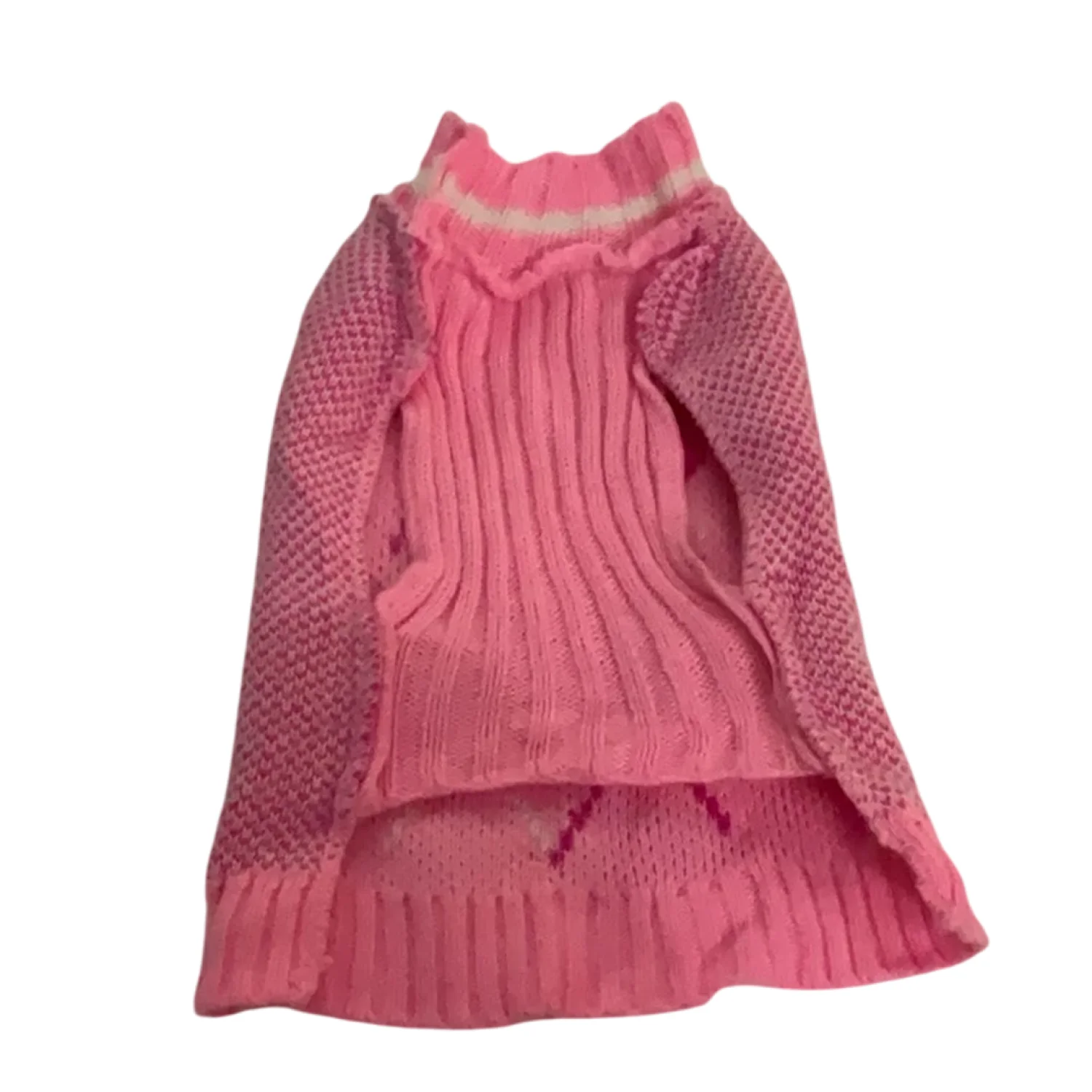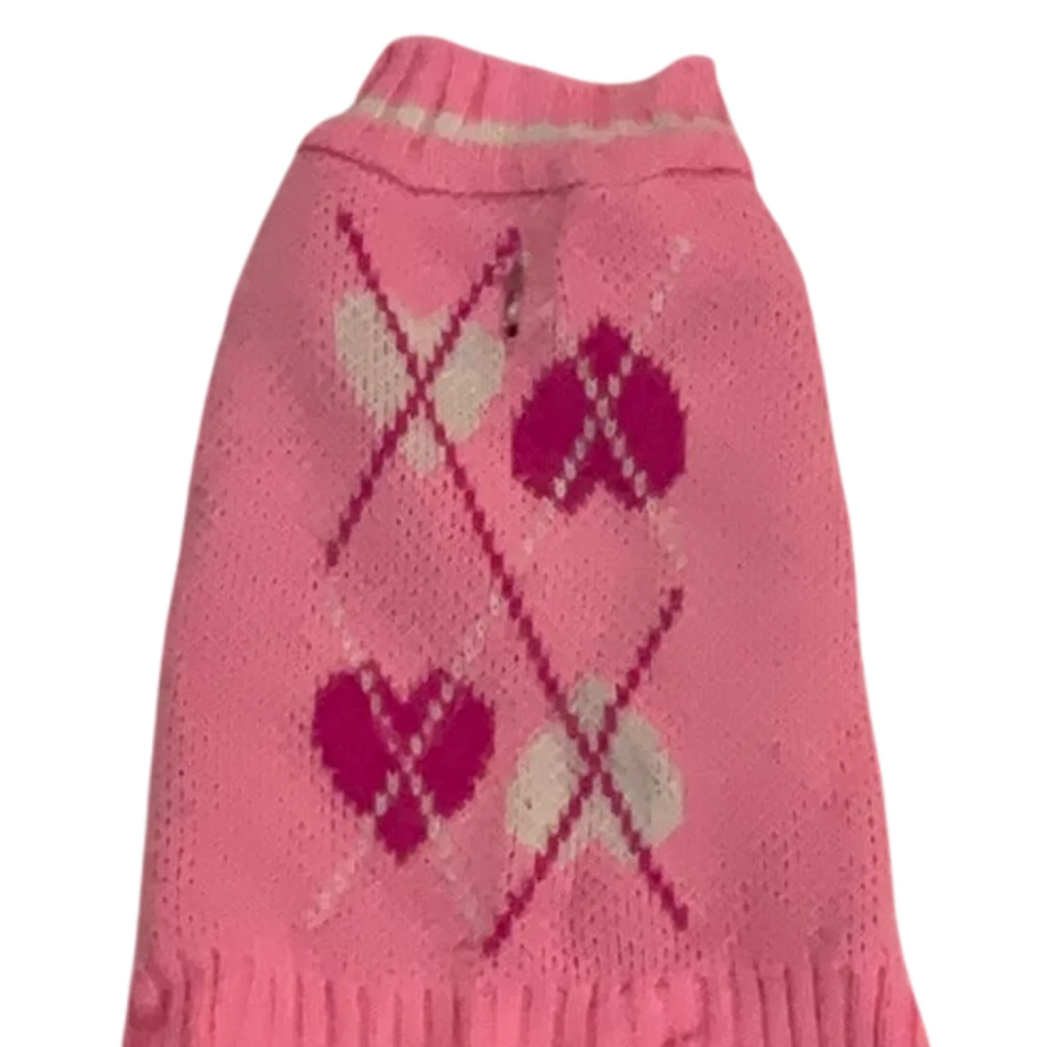 Style: Argyle design dog sweater with two arm holes, with tail hole Color: Light Pink/Dark Pink/White Size: S (Small breeds like Betty Maria White Trent) Paw to Paw 7” Length: 12” Condition: Good, some pilling Machine wash cold