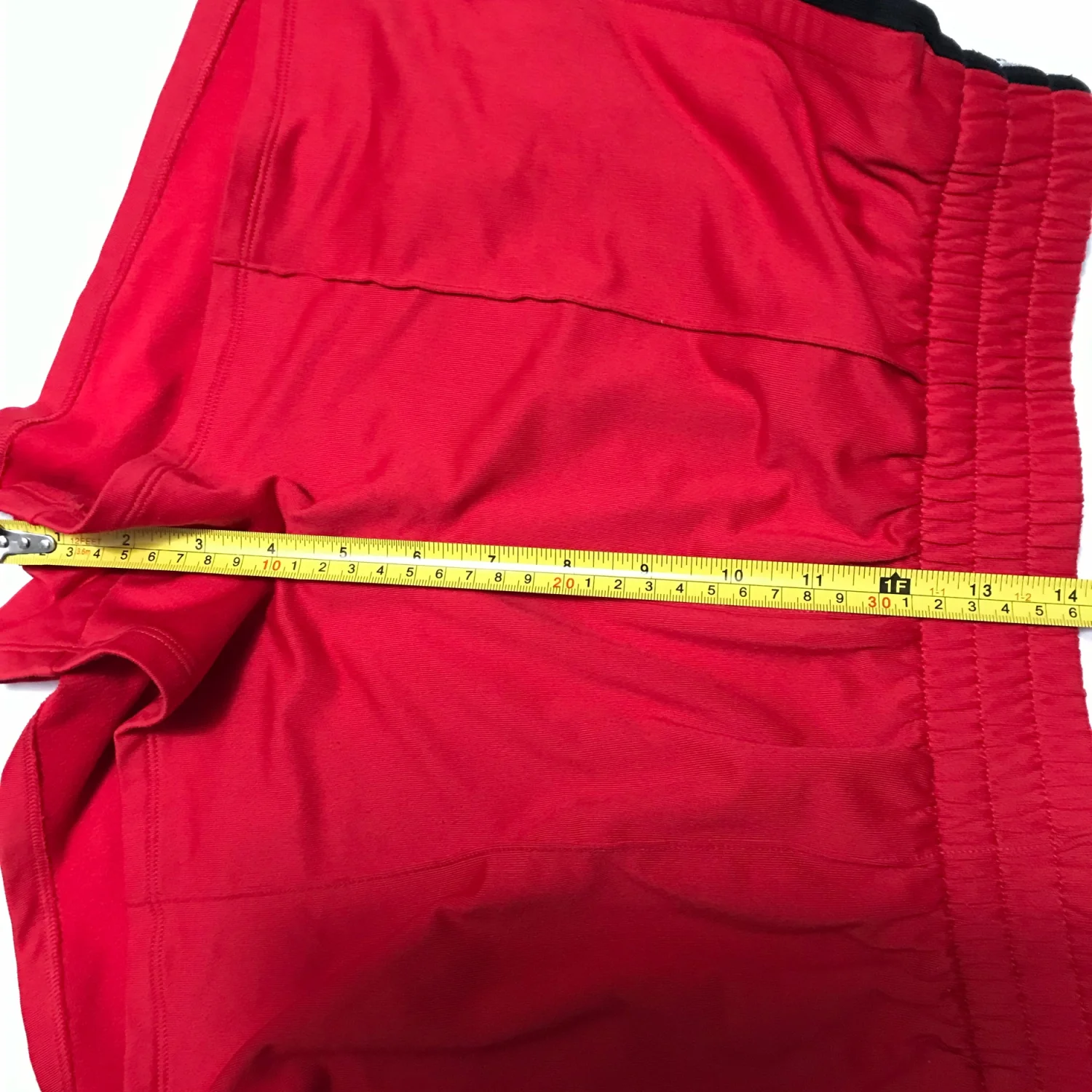 Style: Pleat front strip with back pocket and silver sparkle detail at side Color: Red/Black Size: L Waist: 14" Length: 14" Condition: Good 93% Polyester 7% Elastane Machine wash