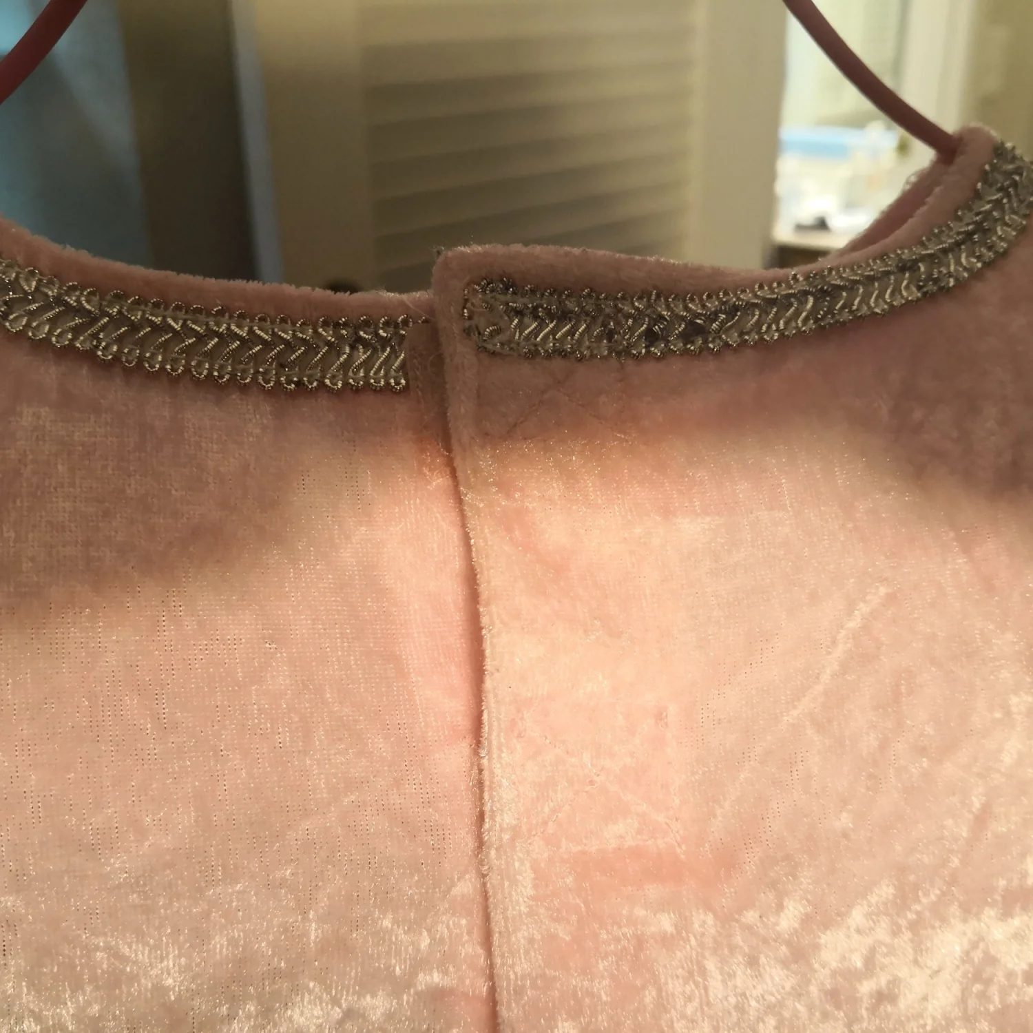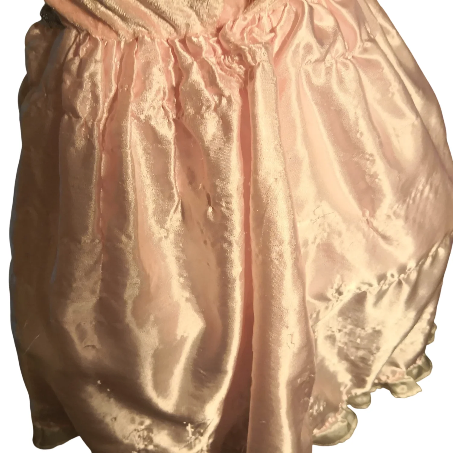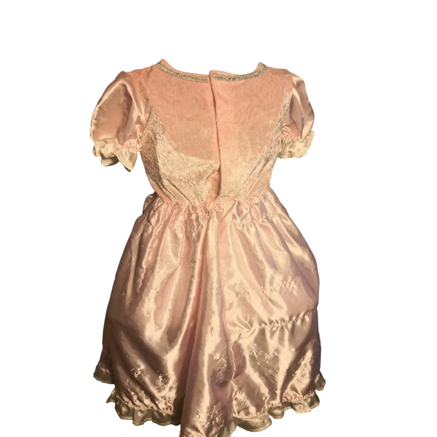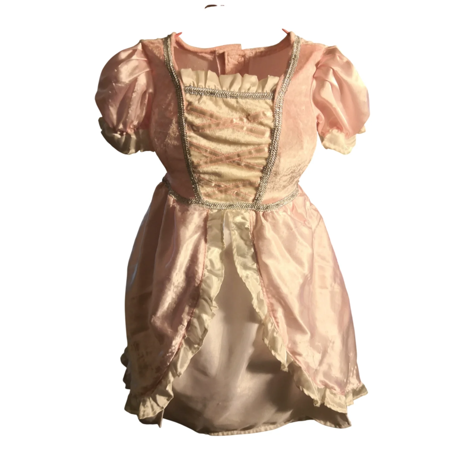 Style: Princess dress with mini hoop crinoline under dress. Velvet like lined bodice Color: Pink/White Size: Armpit 11" Length 28" Condition: Fabric thread pulling on back of garment. As is condition. Has been very loved. Flaws noted in pics.