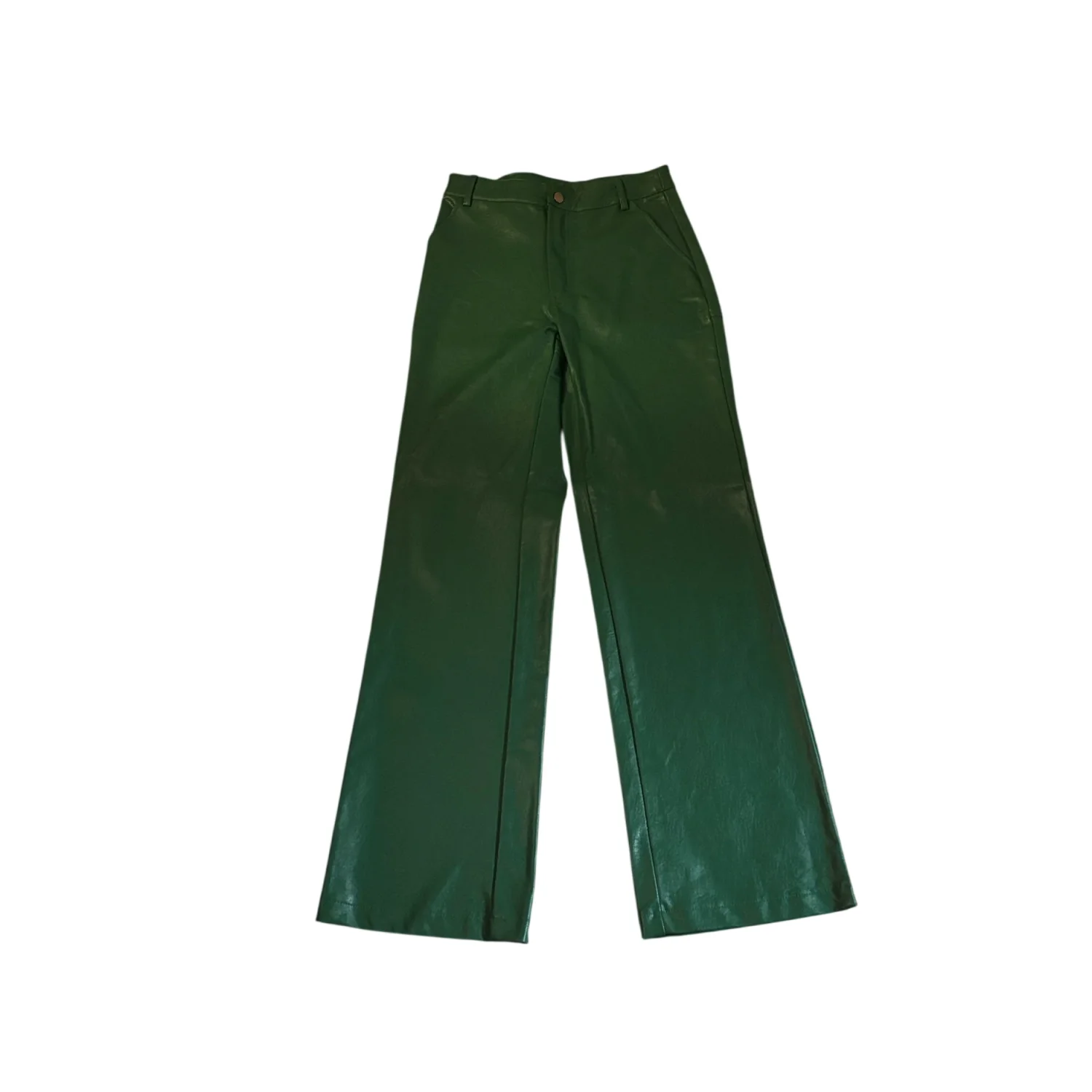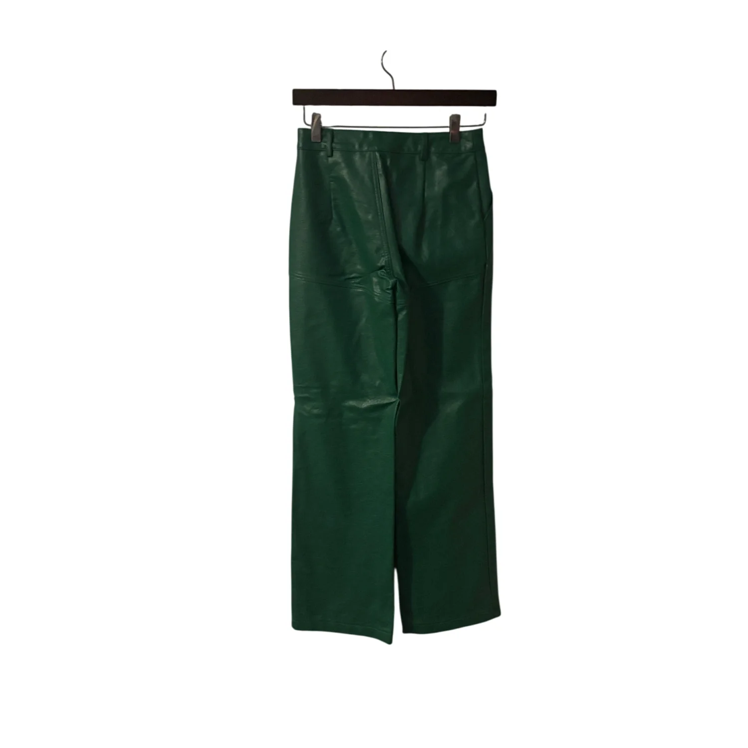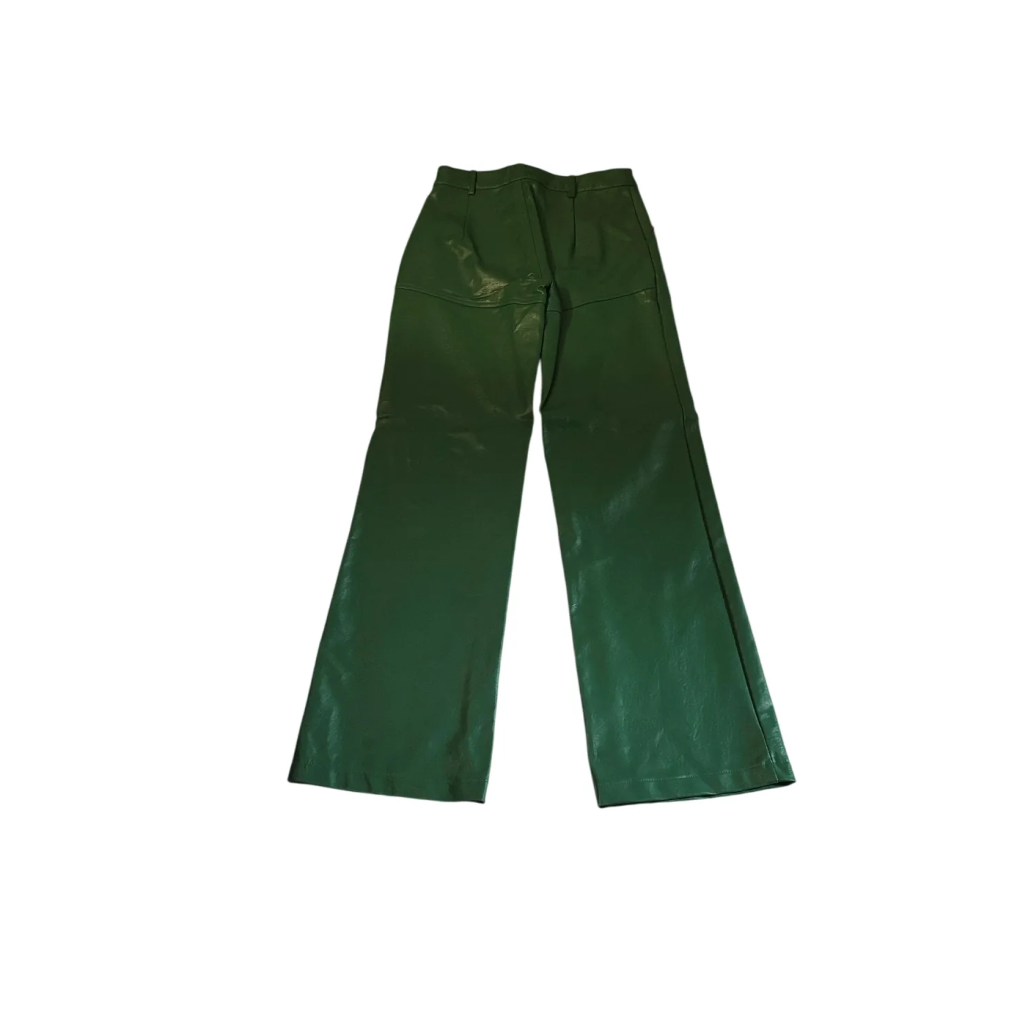 Style: Flat front wide leg faux leather pants Color: Green Size: 2 Waist: 13" Rise: 12" Length: 30" Condition: Good, two small hang tag holes as pictured 55% PU 45% Rayon Hand wash only