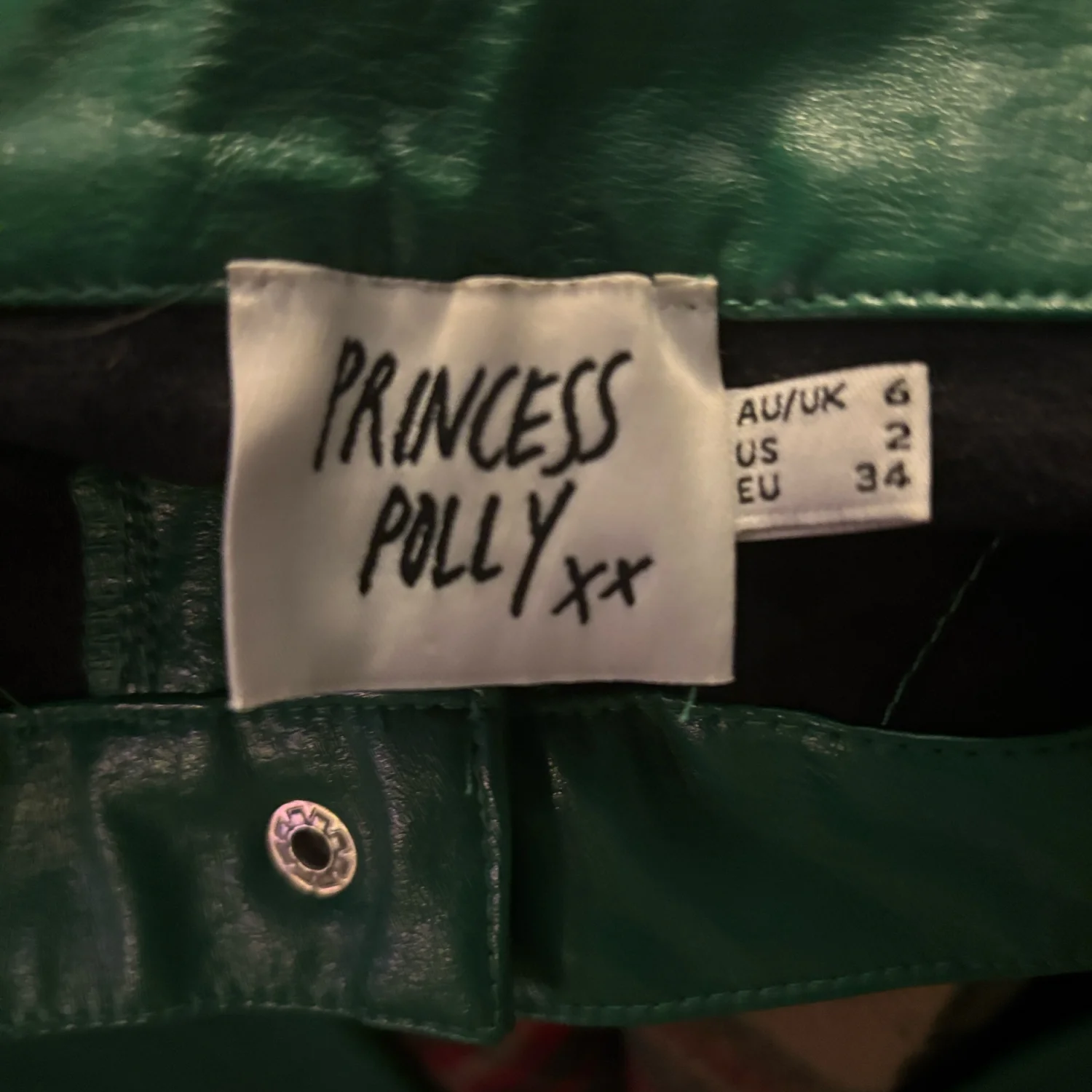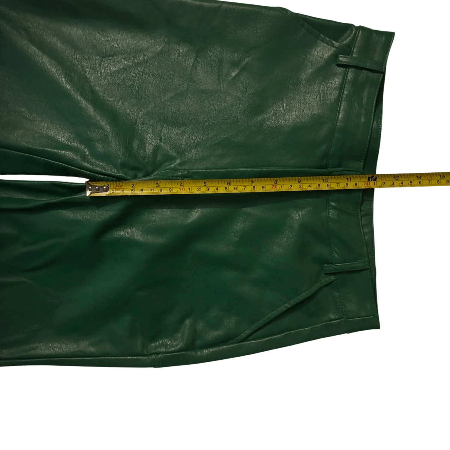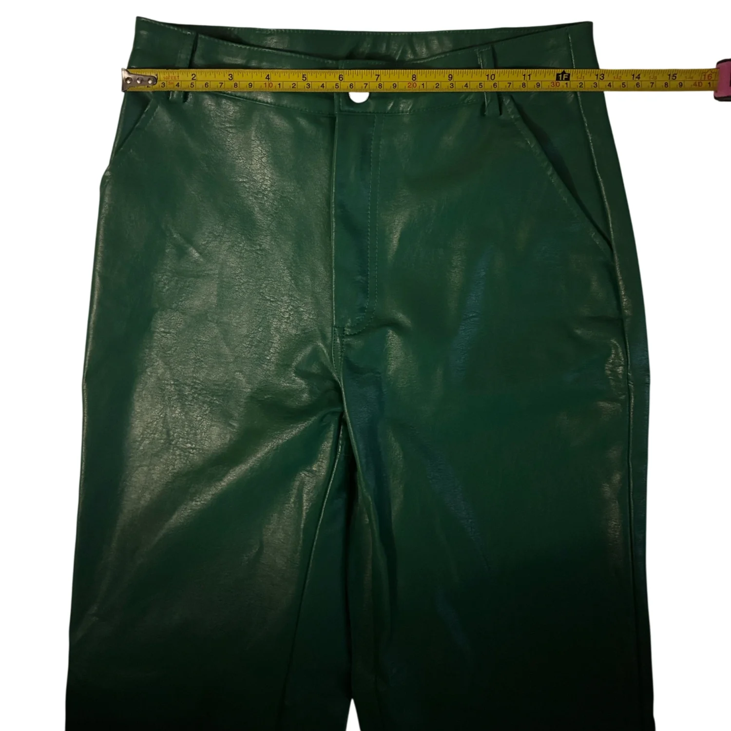 Style: Flat front wide leg faux leather pants Color: Green Size: 2 Waist: 13" Rise: 12" Length: 30" Condition: Good, two small hang tag holes as pictured 55% PU 45% Rayon Hand wash only