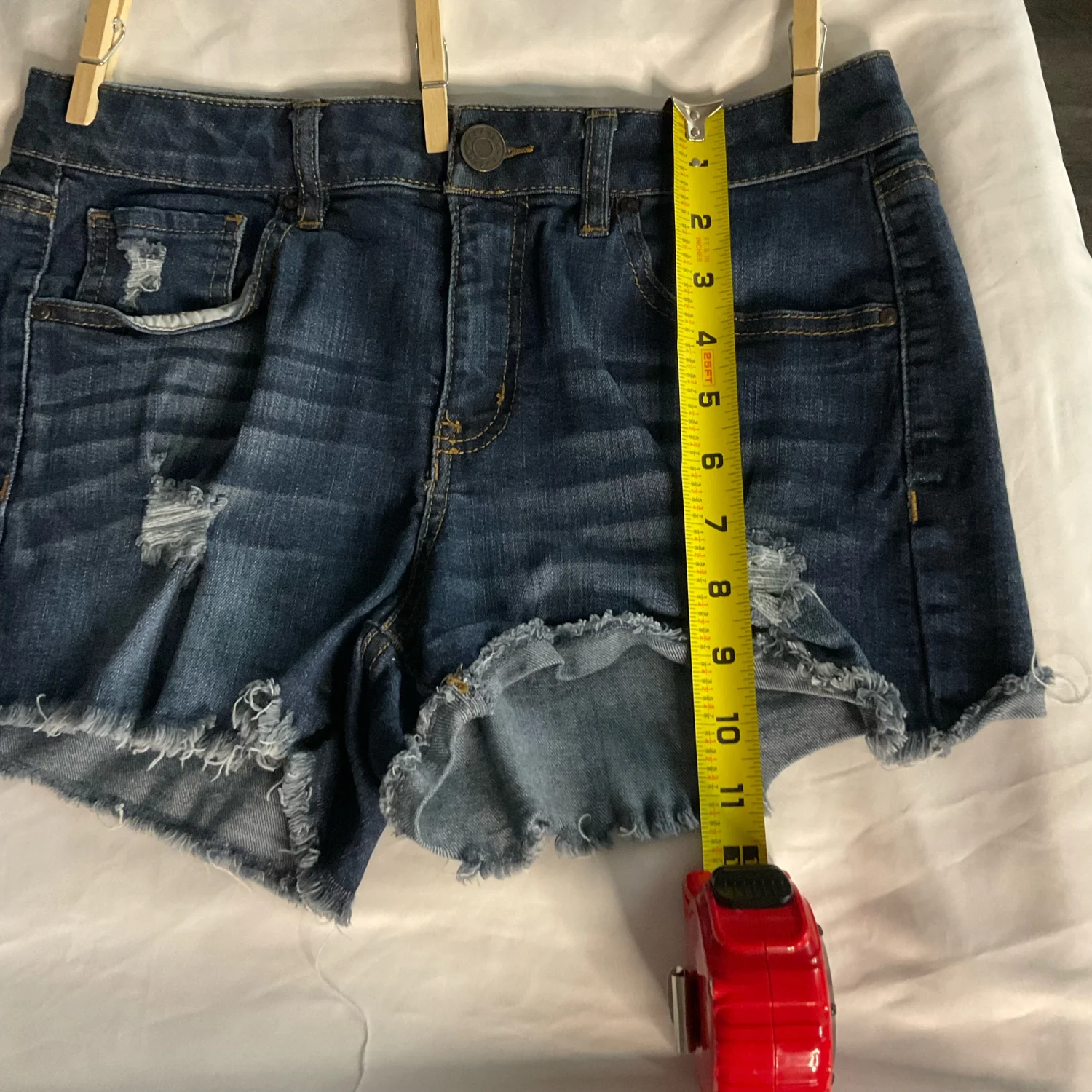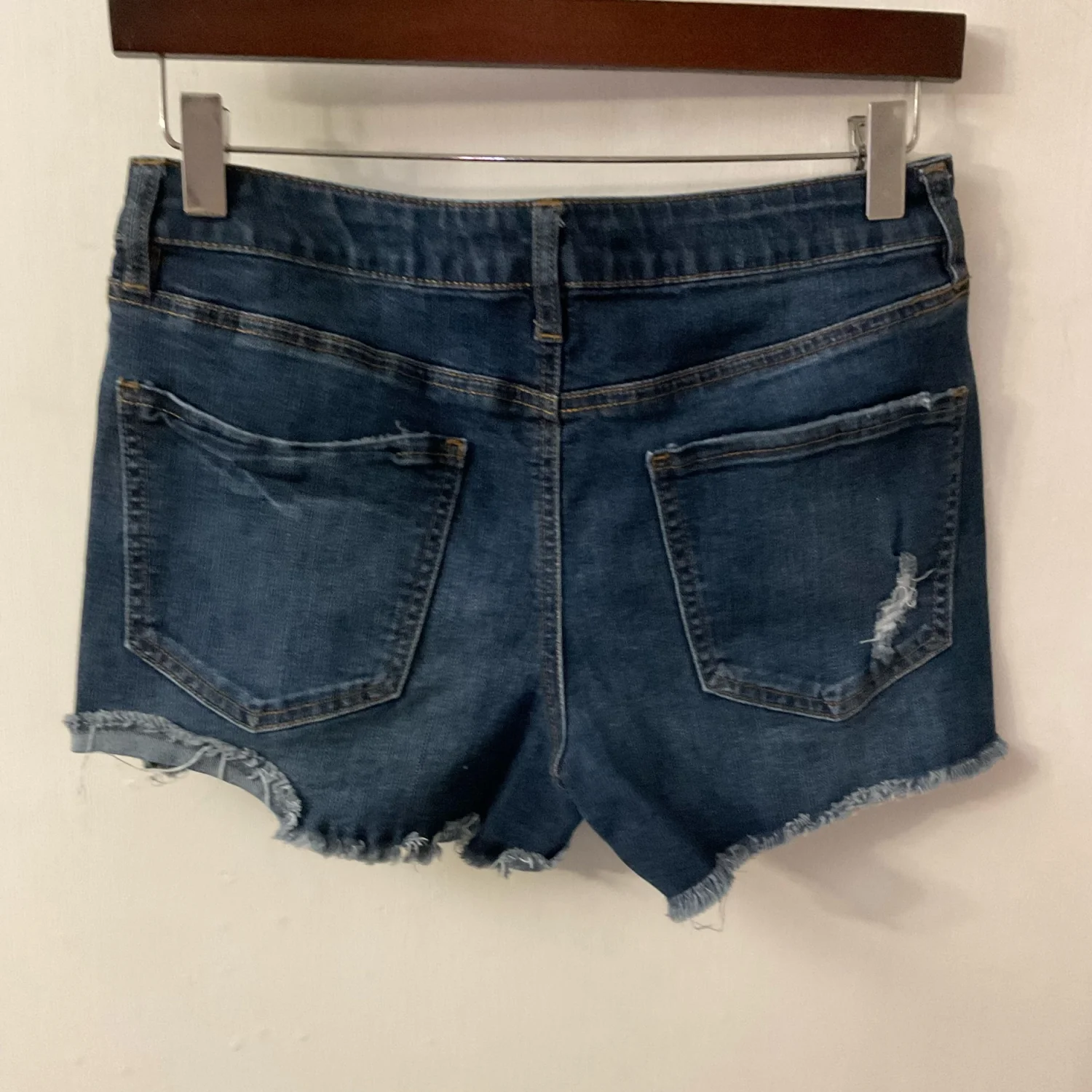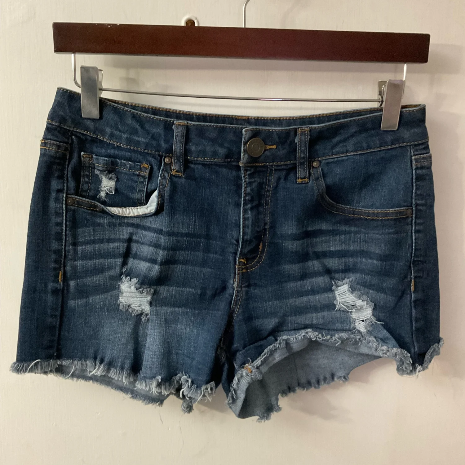 Style: Distressed denim shorts with 5 pockets and raw hem Color: Blue Size: 6 W: 15” Rise: 10” Length: 11” Condition: Good 72% Cotton 18% Polyester 9% Rayon 1% Spandex Machine wash cold