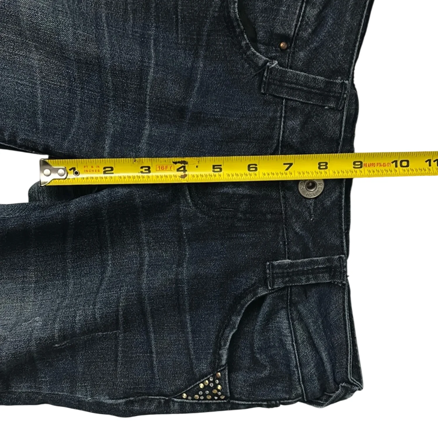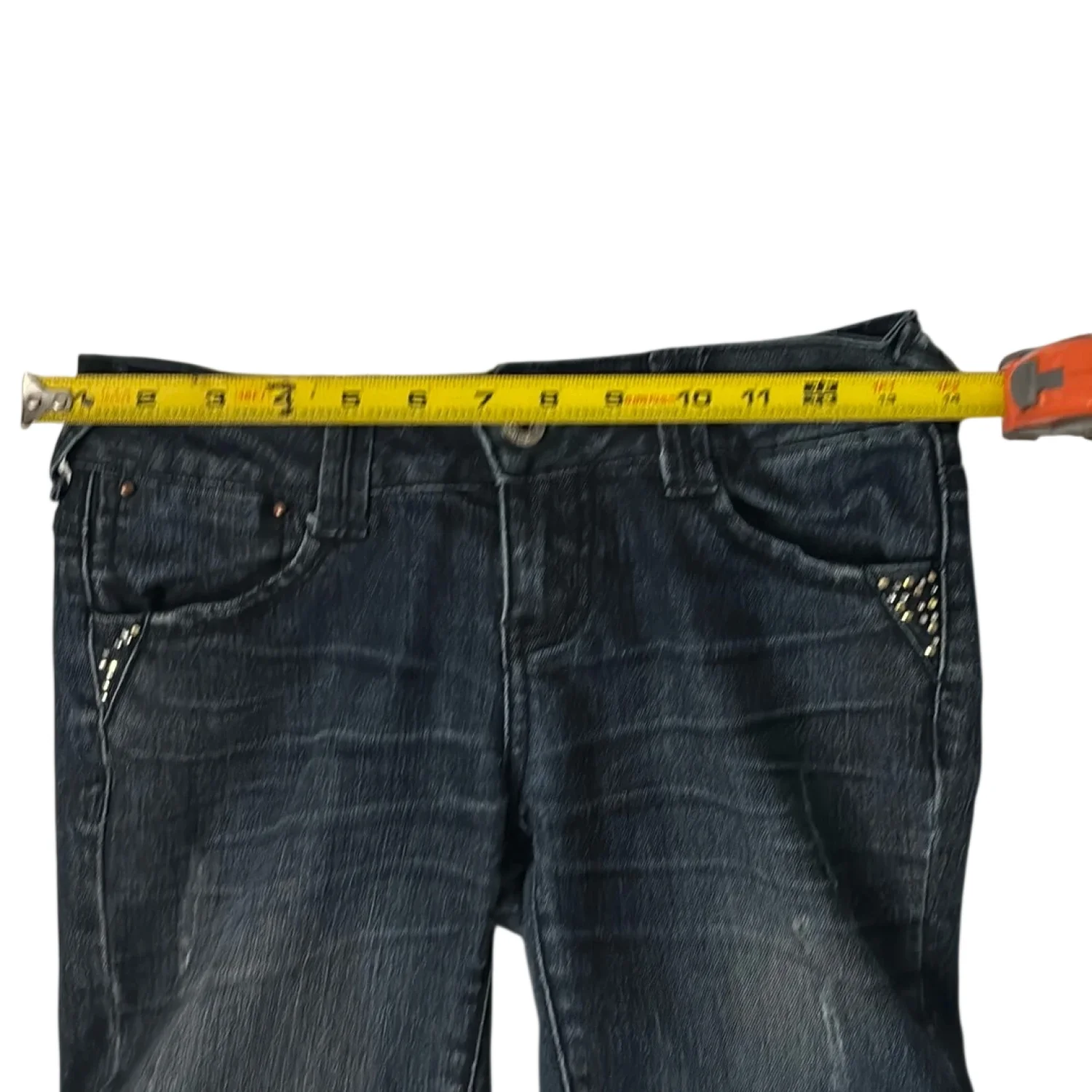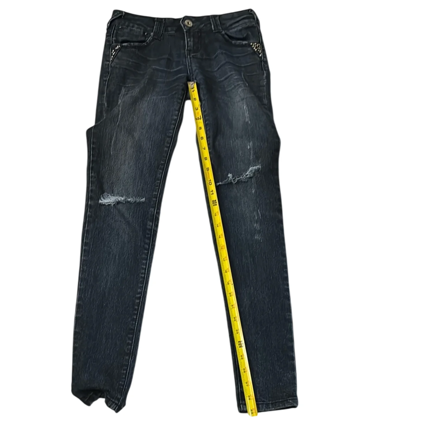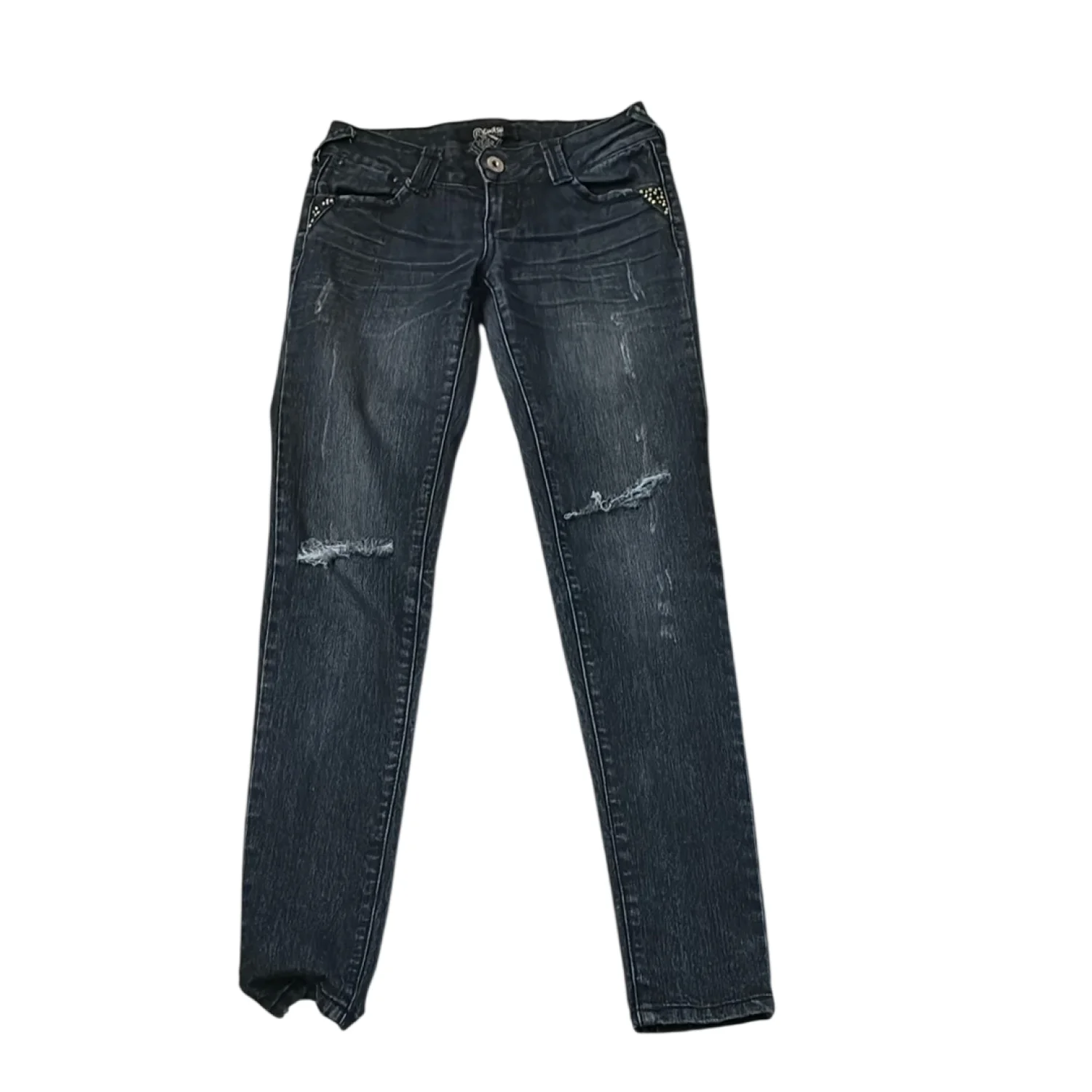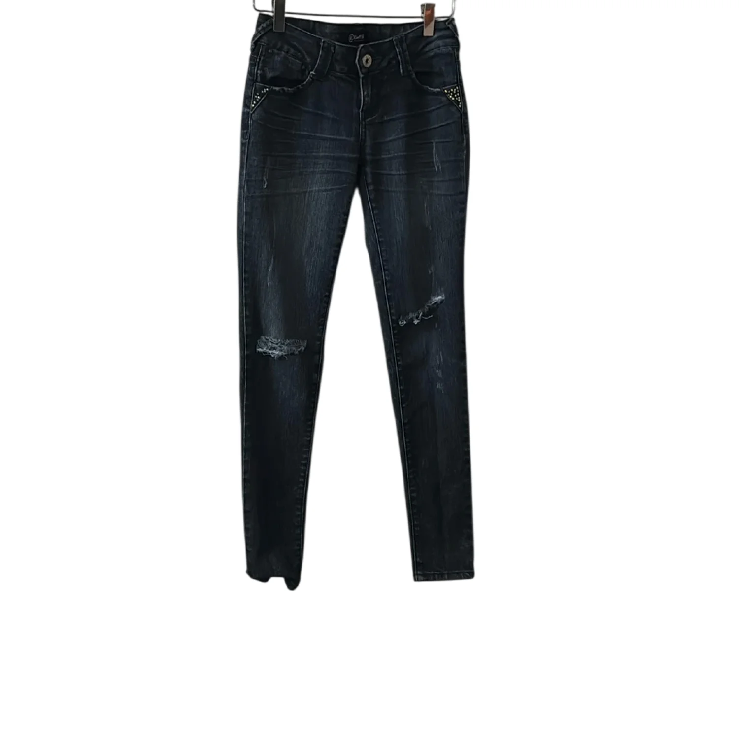 Style: 5 pocket zip fly distressed skinny jeans Color: Blue Size: 1 Waist: 14” Rise: 9” Inseam: 29” Condition: Good, some missing gem embellishments Machine wash cold