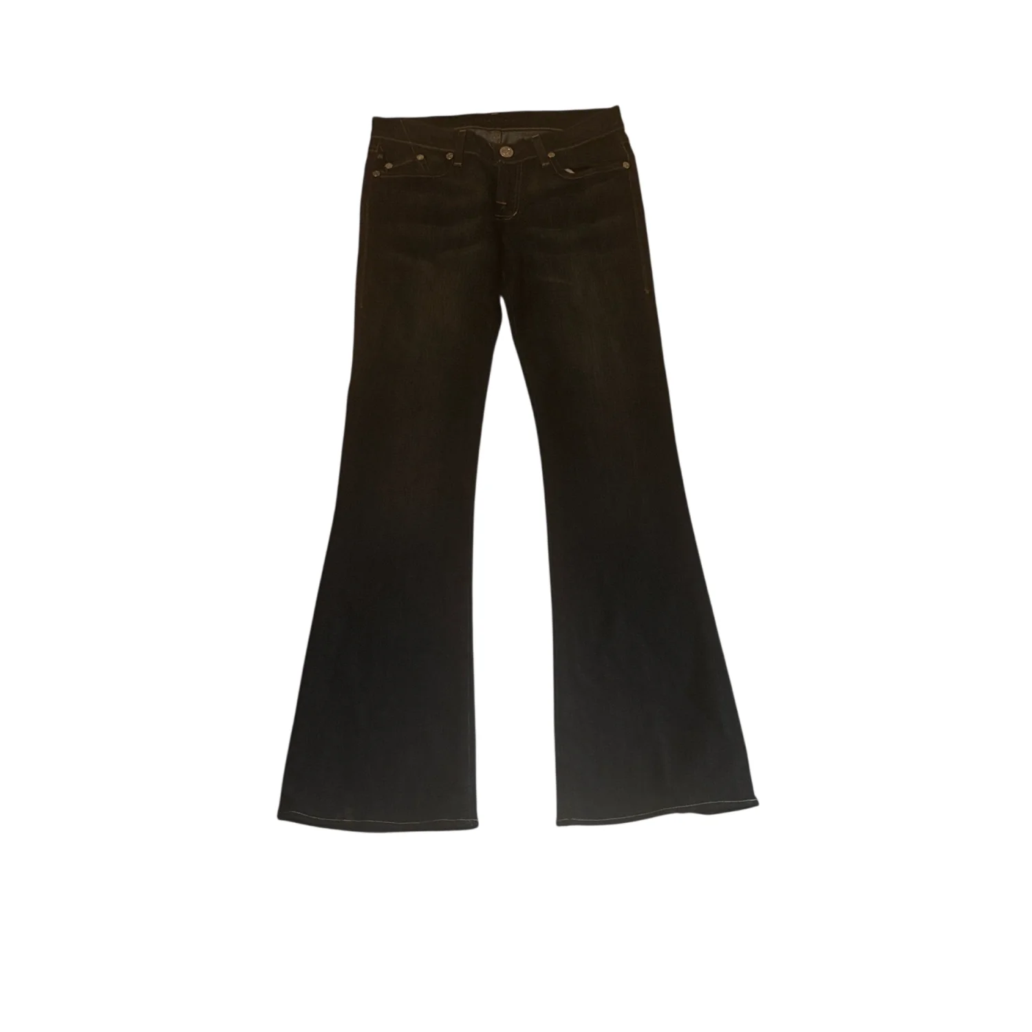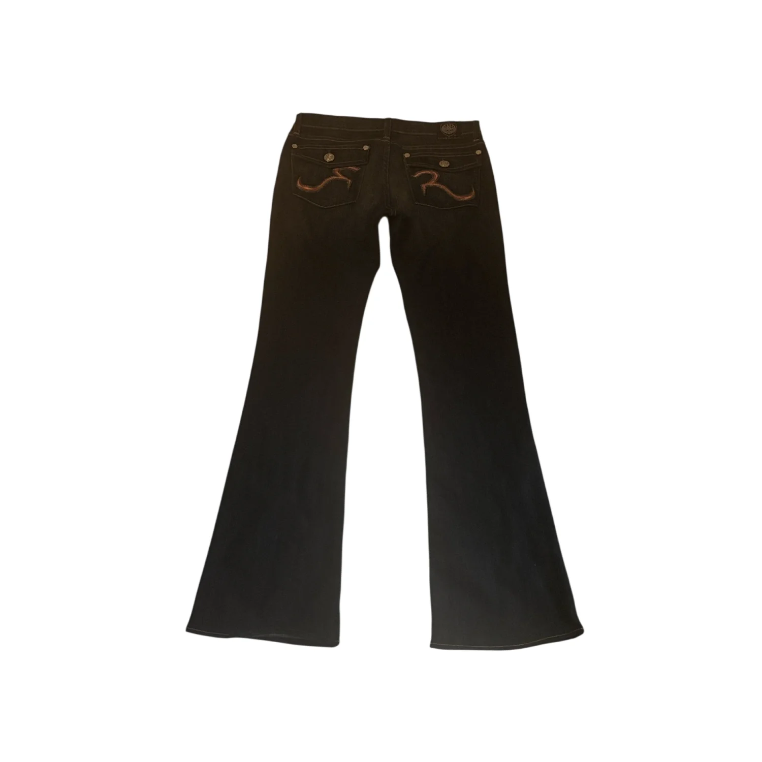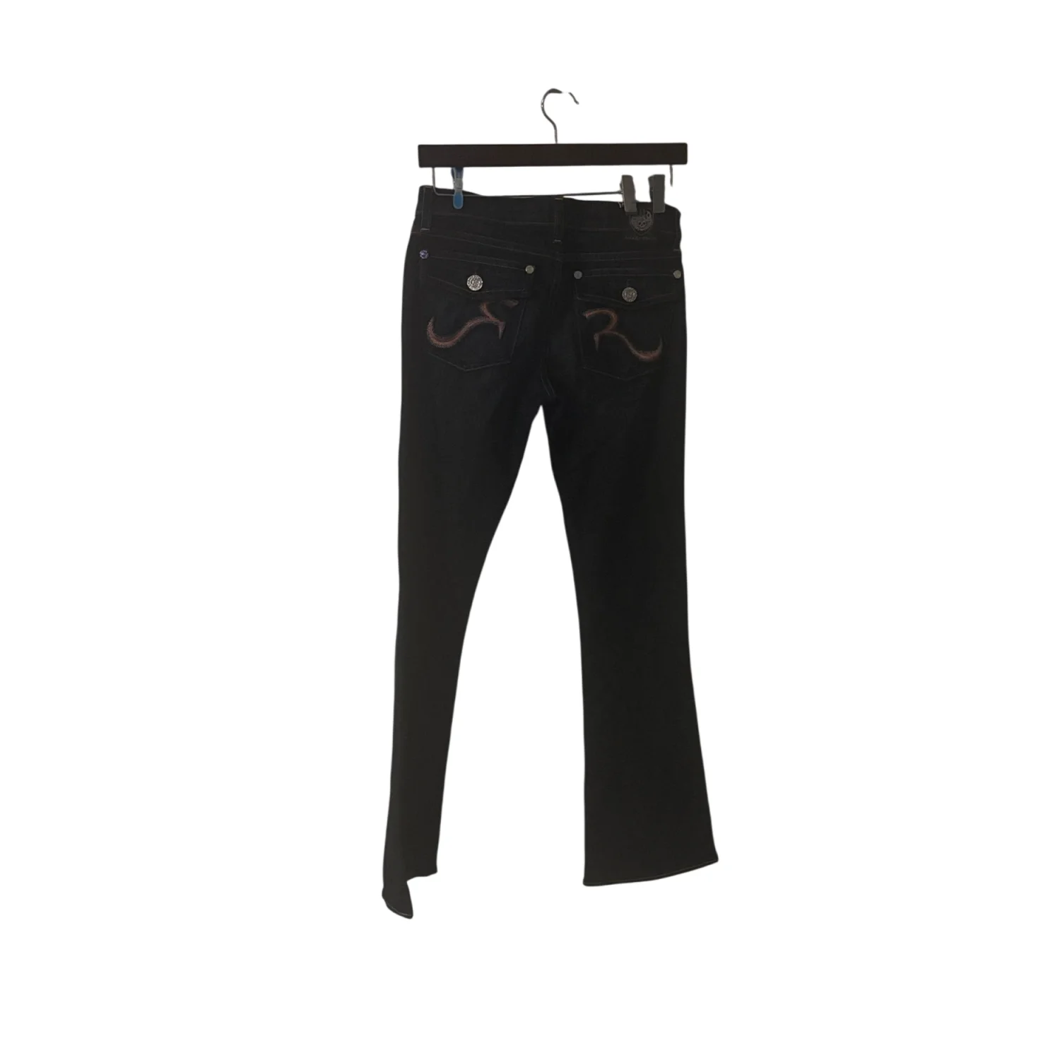 Style: 5 pocket flare jean with pink trim and stitching Color: Blue/Pink/Silver Size: 27 Waist: 14" Rise: 10" Inseam:31" Flare: 8" Condition: Good 70% Cotton 30% Polyester Machine wash cold