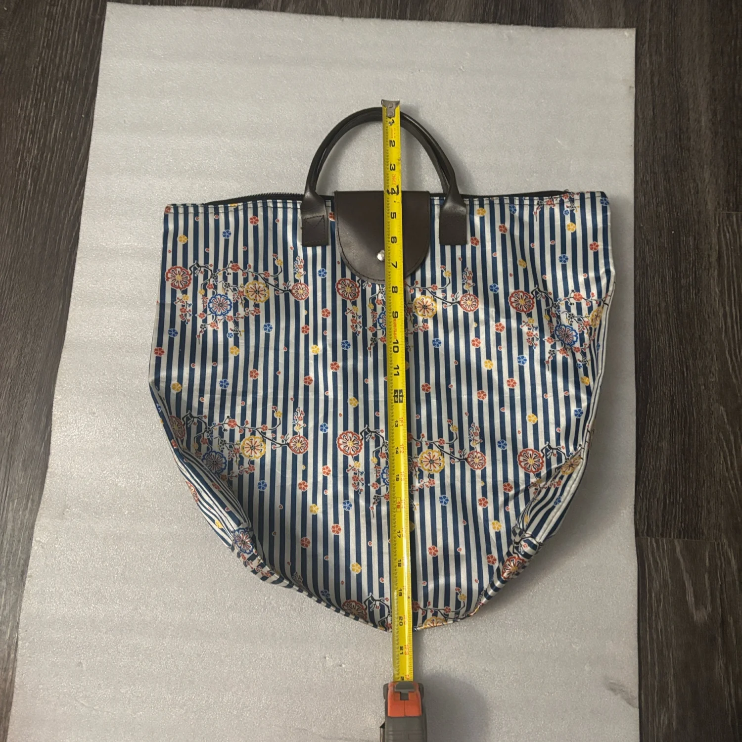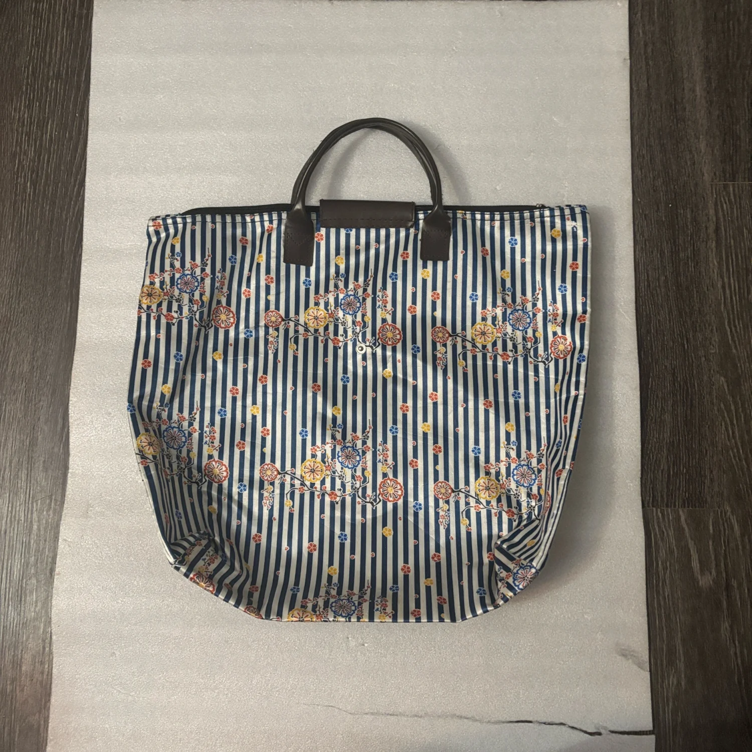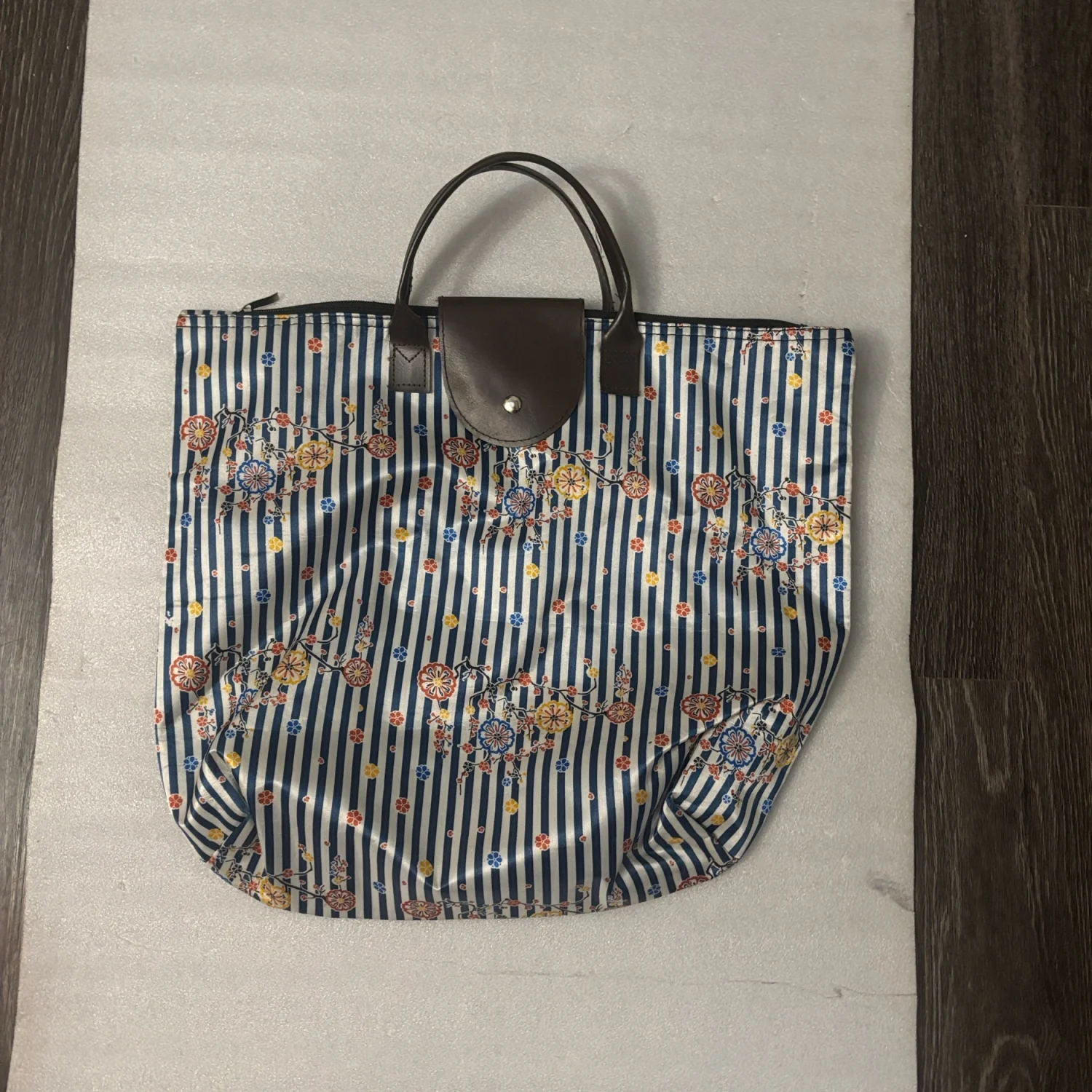 Style: Light zippered floral foldable tote bag with printed flowers over striped blue and white background. Great for travel and vacationing. Color: Blue/White Size: Width: 17" Length: 20" Condition: Good Wipe with damp cloth to clean
