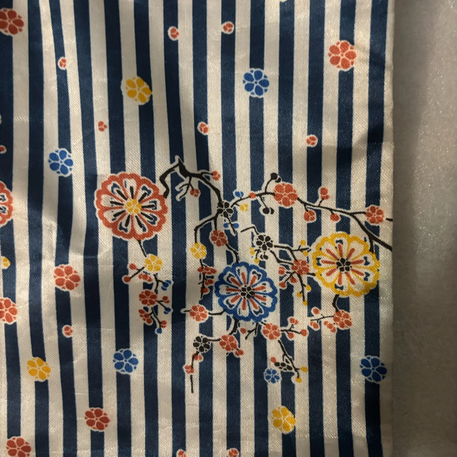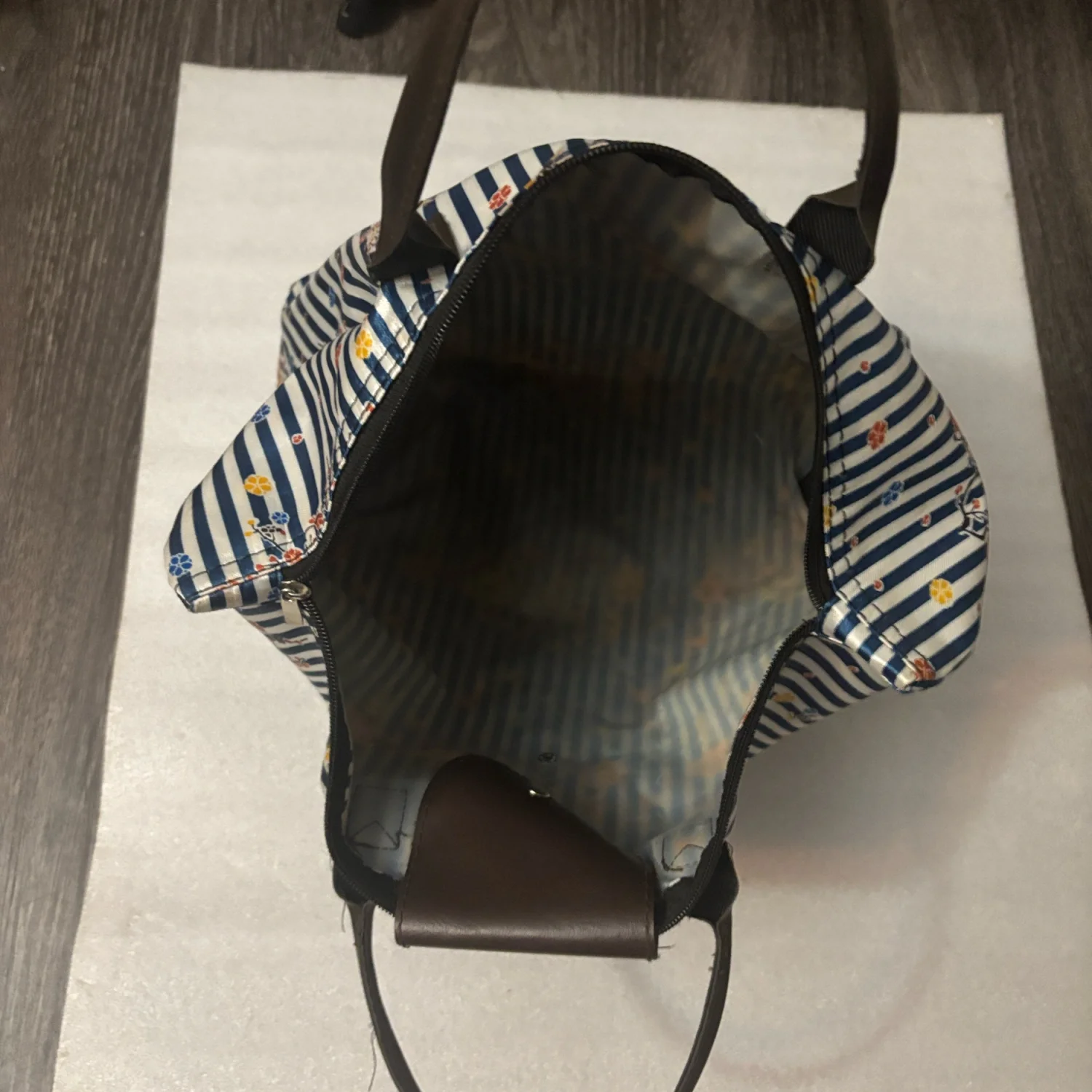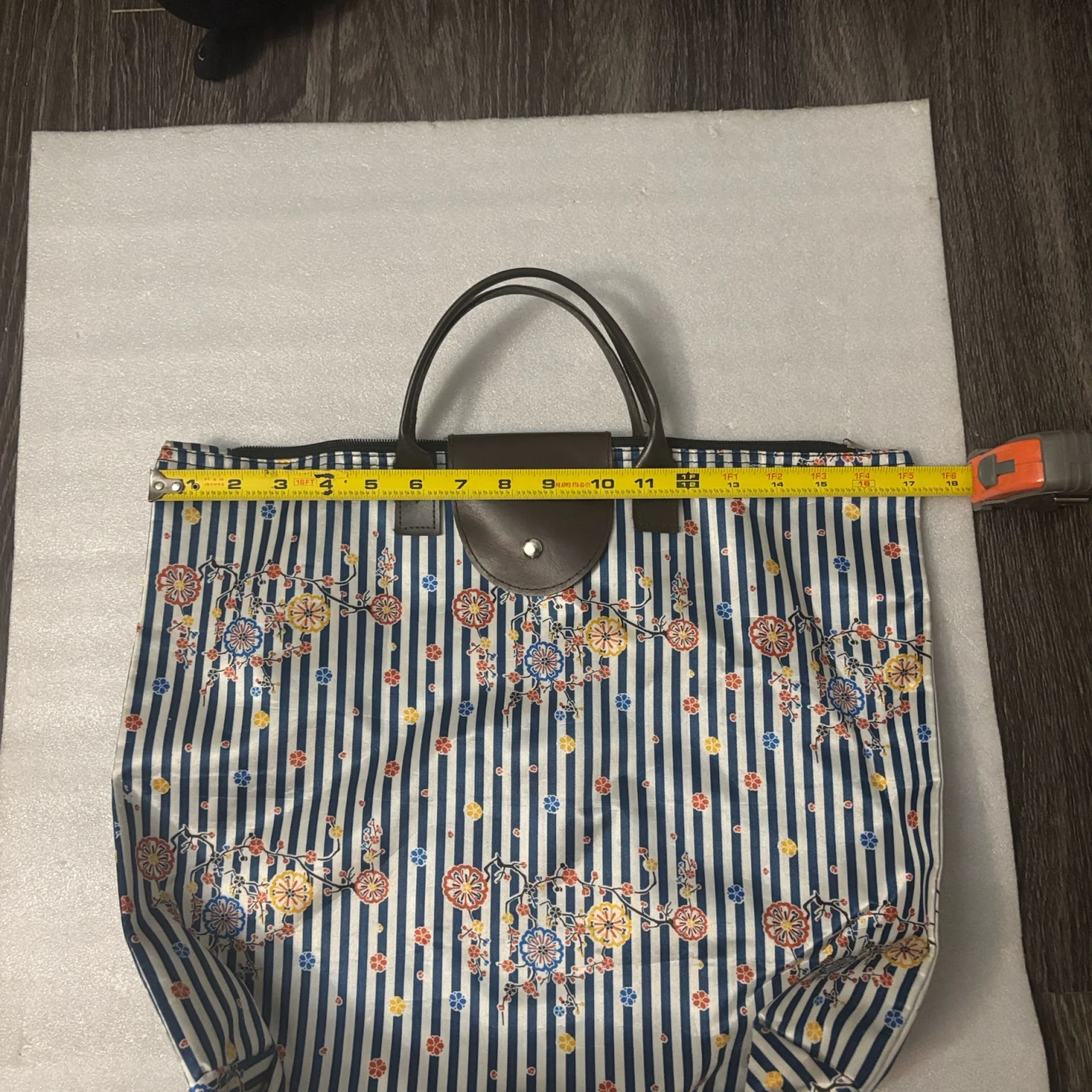 Style: Light zippered floral foldable tote bag with printed flowers over striped blue and white background. Great for travel and vacationing. Color: Blue/White Size: Width: 17" Length: 20" Condition: Good Wipe with damp cloth to clean