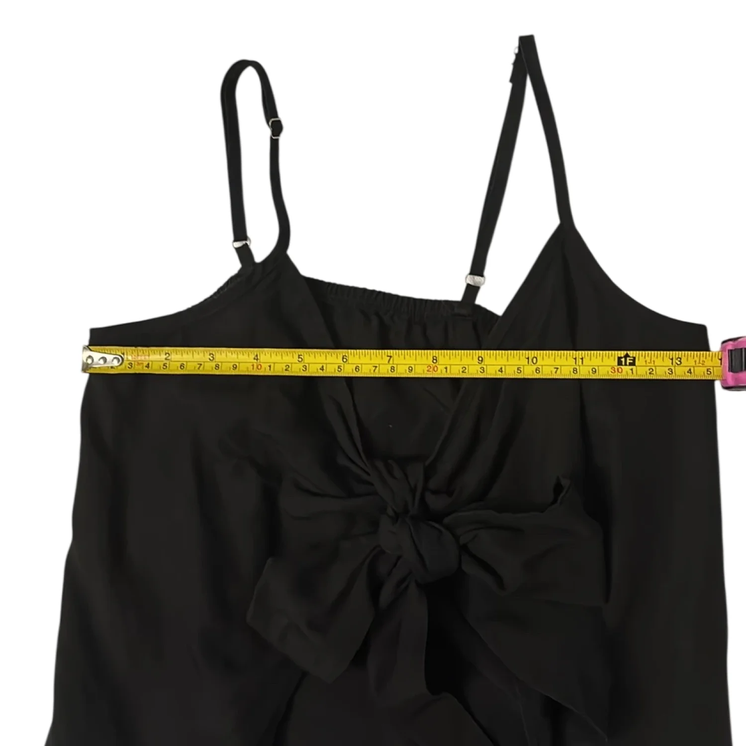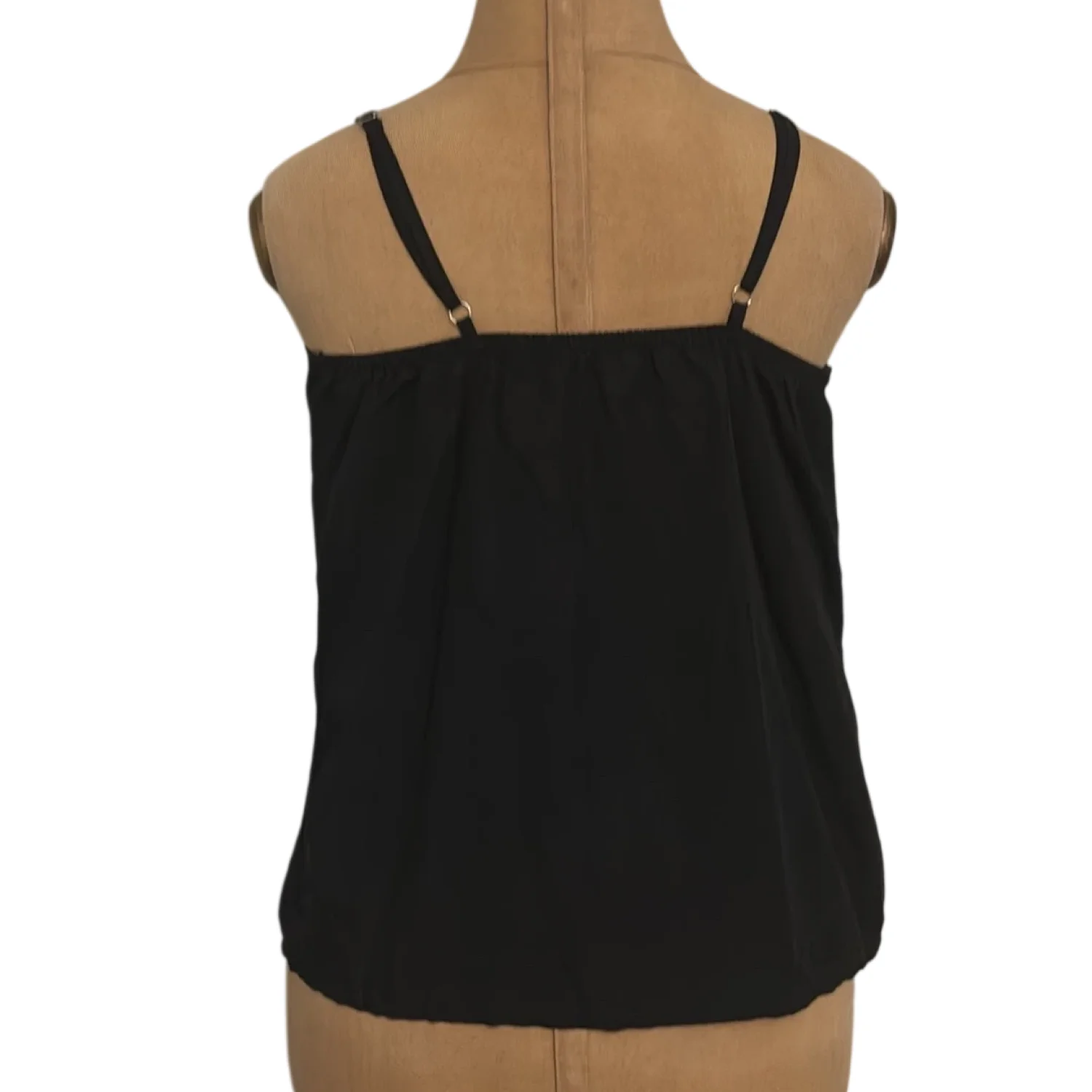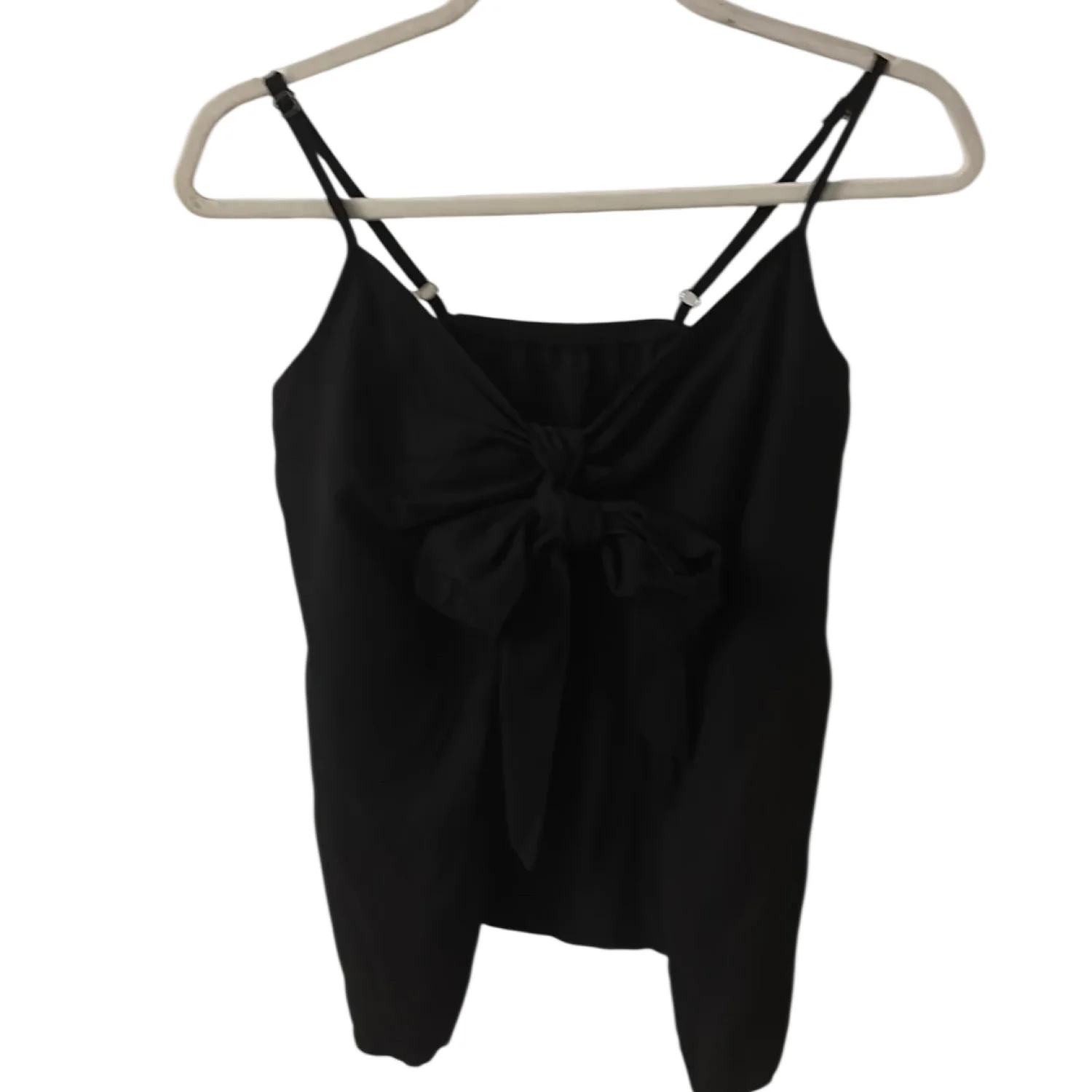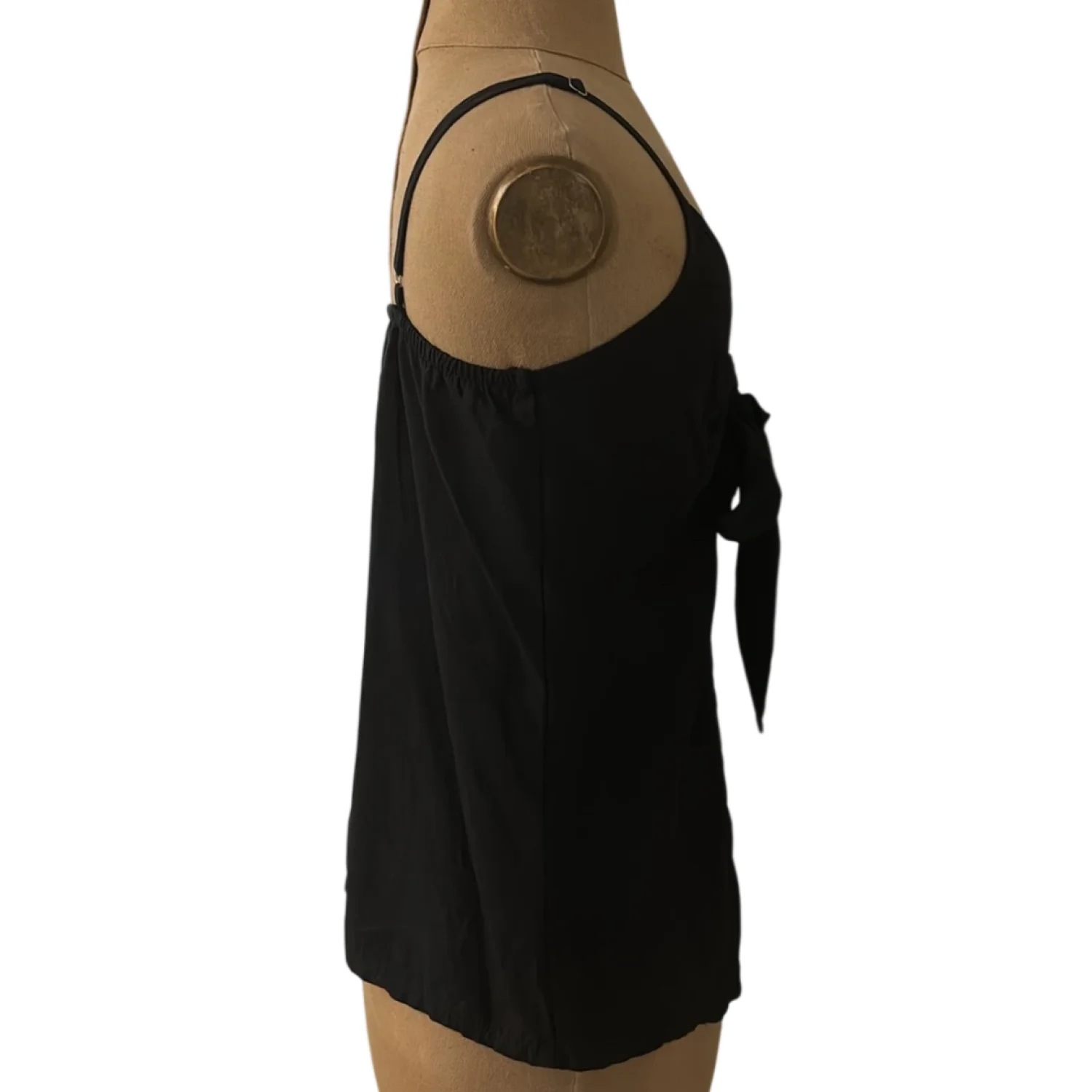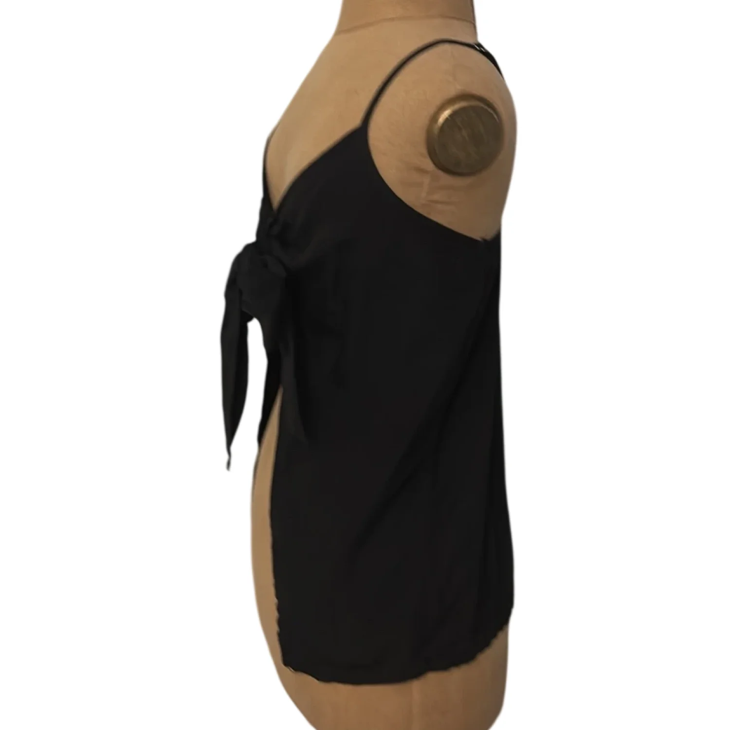 Style: Adjustable strap tank with tie- front and open front Color: Black Size: S Armpit: 13” Length: 23” Condition: Good 80% Lyocell 20% Linen Machine wash/ Hand wash