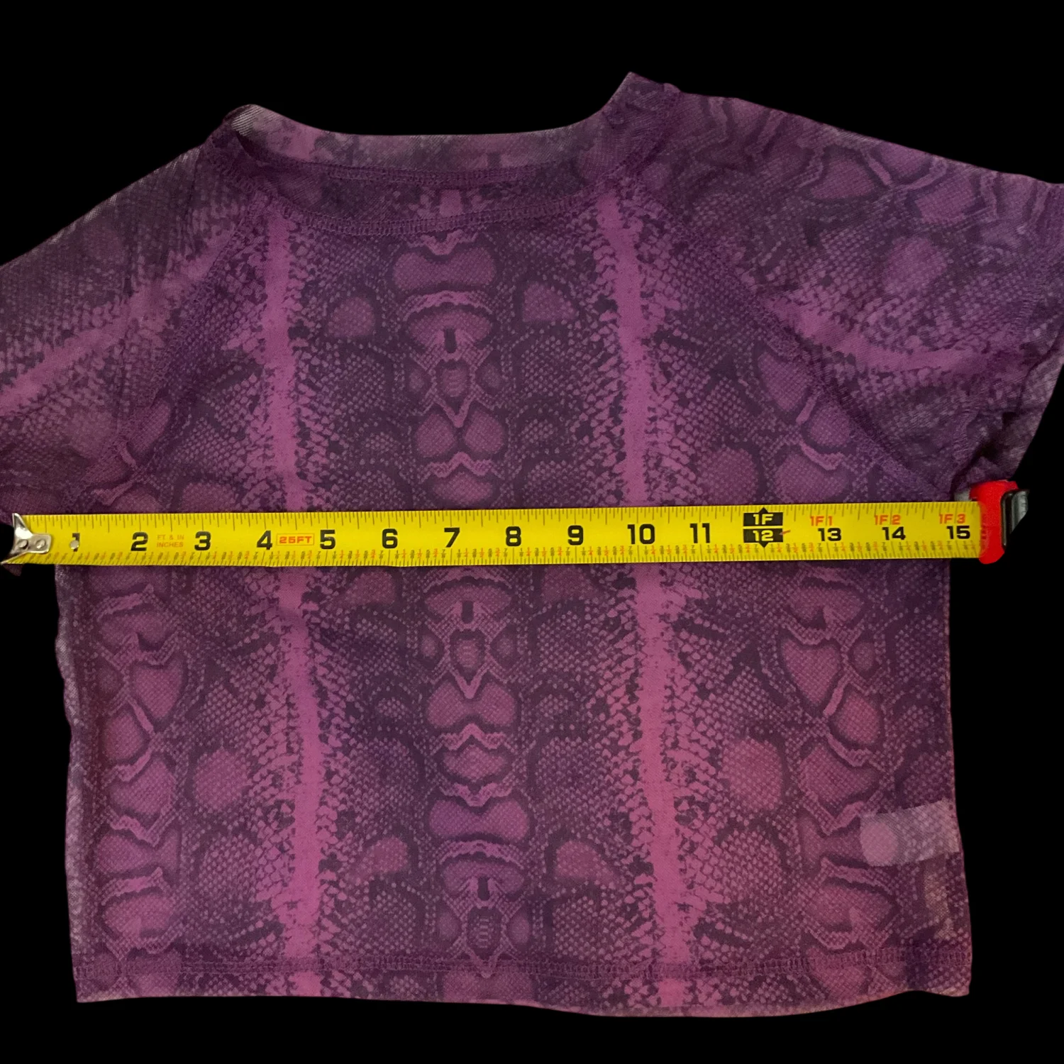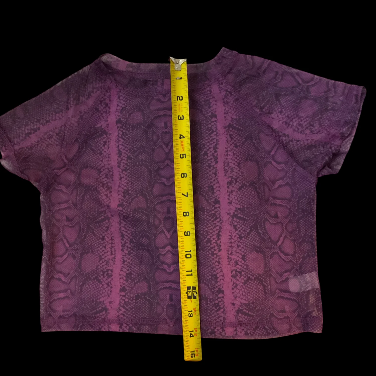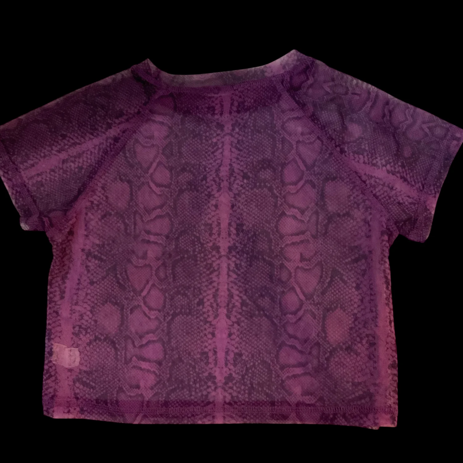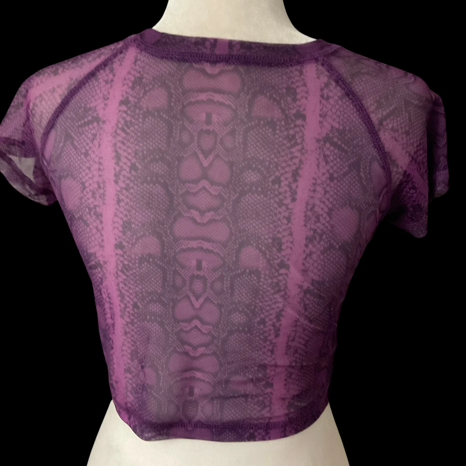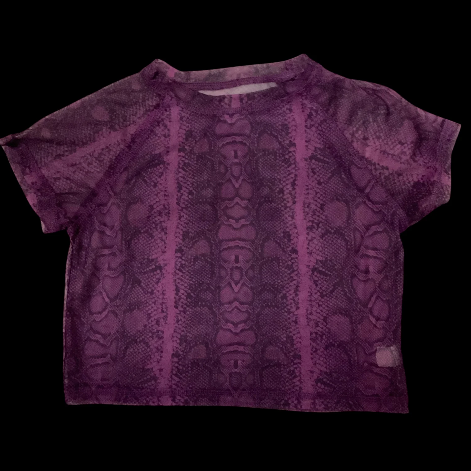 Style: Sheer Crop Top with snakeskin print Color: Purple/Black Size: M Armpit:15” Length: 14” 65% Cotton 35% Polyester Dry Clean/Wash separately