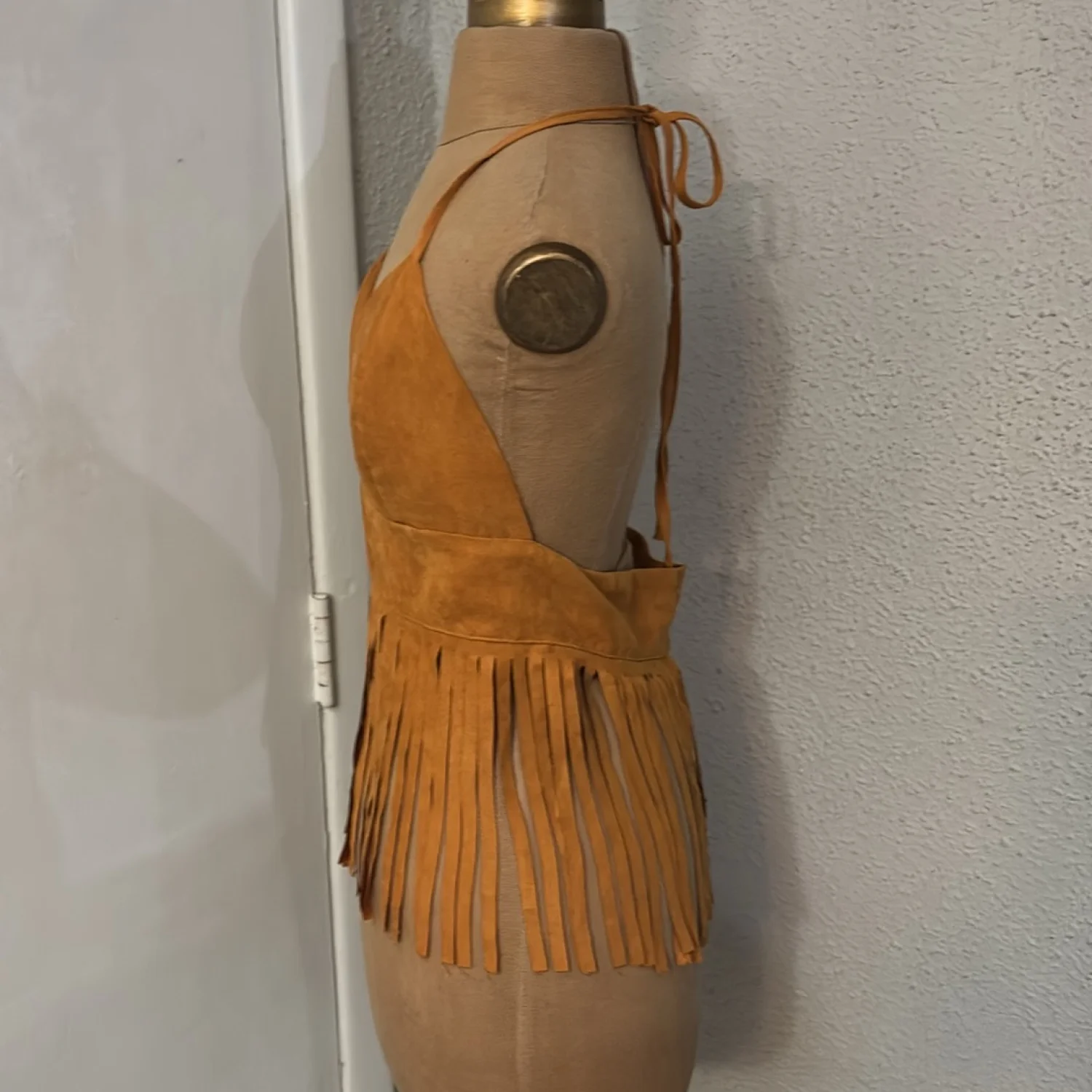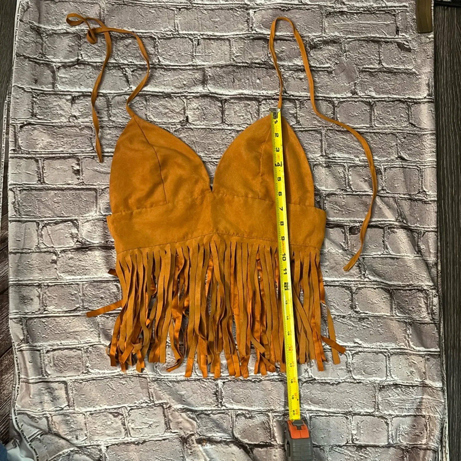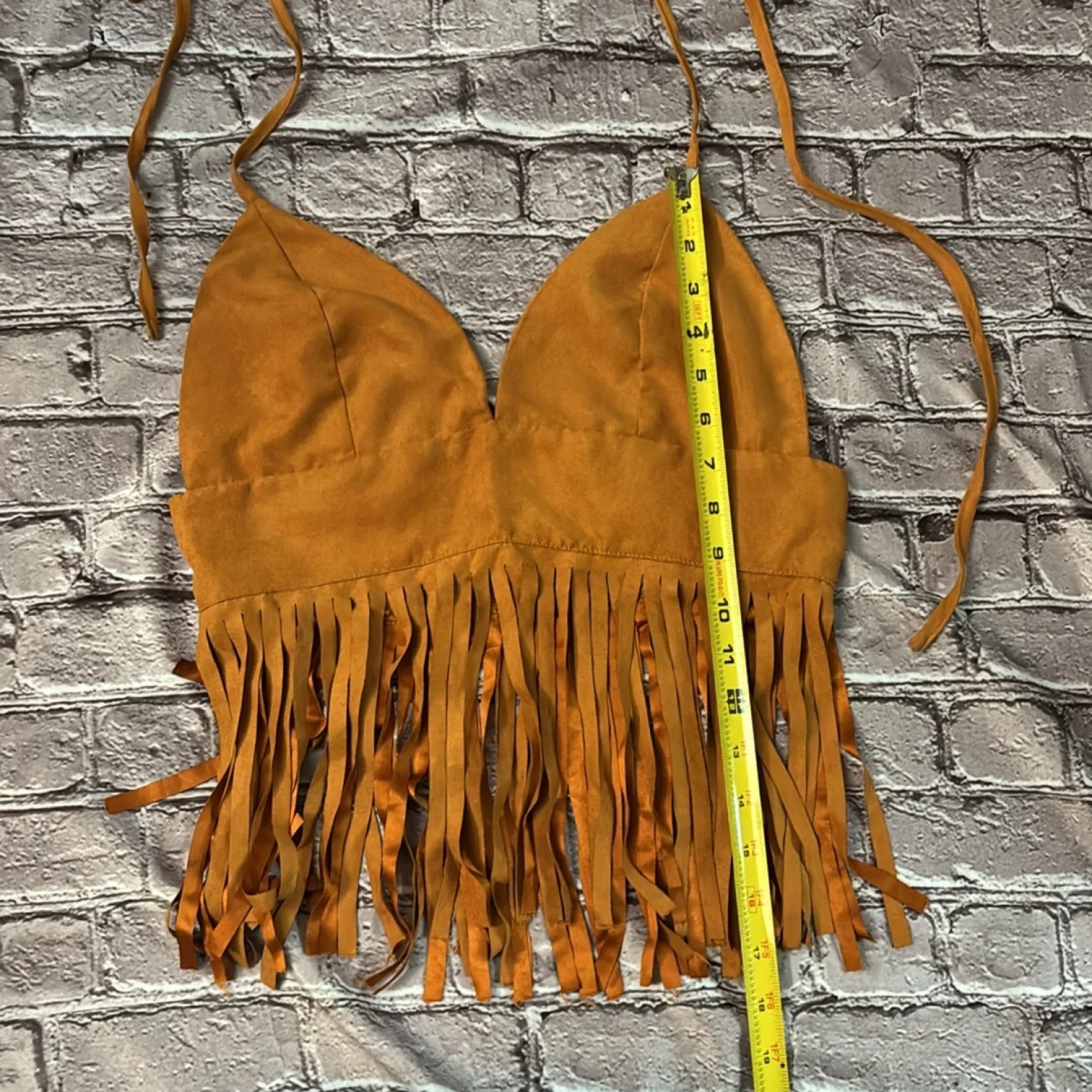 Style: Fringed halter crop top with tie/ hook loop closure Color:Brown Size: S Armpit: 13” Length: 17” Condition: Good 100% Polyester Machine wash cold