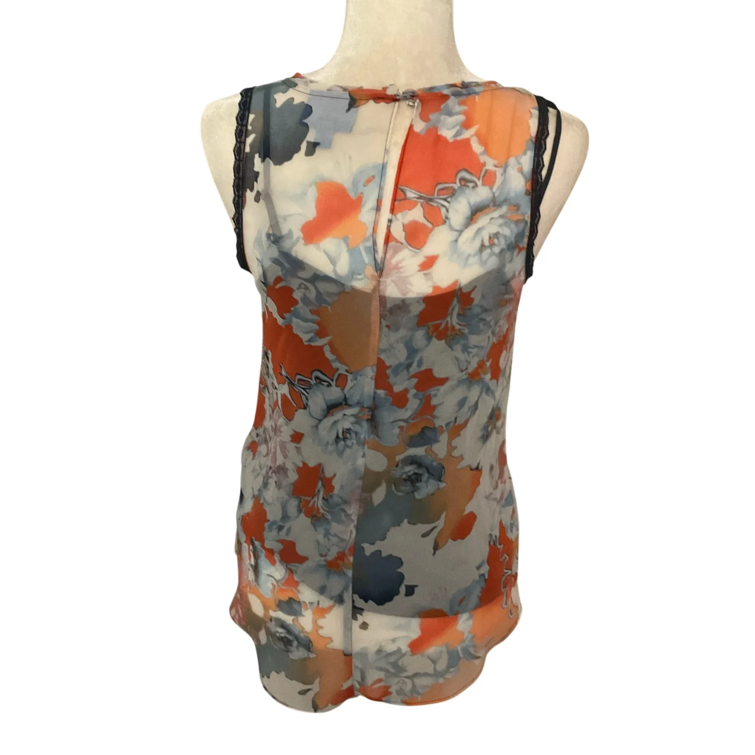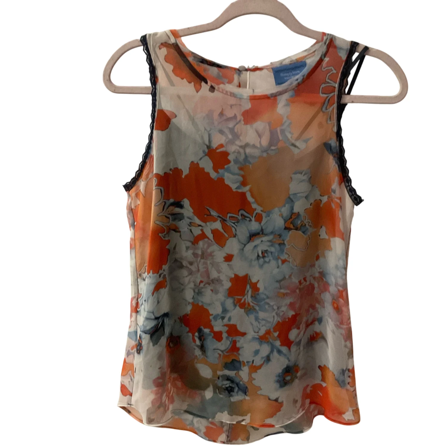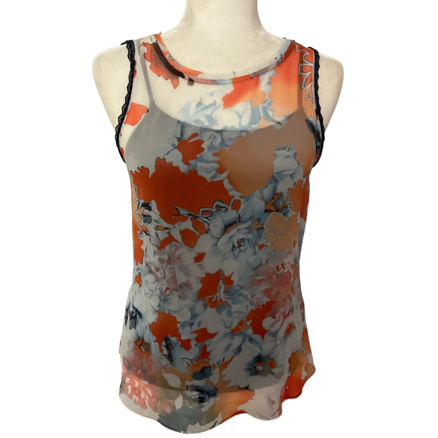 Style: Sleeveless lined top with lace detail at arm openings Color: Orange/Blue Size: XS Armpit: 15" Length: 25" Condition: Good 100% Polyester Hand wash