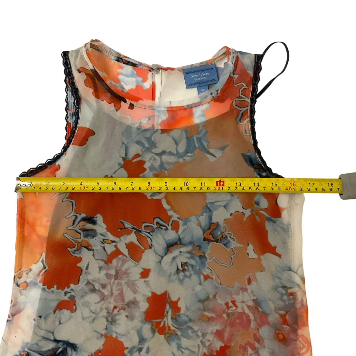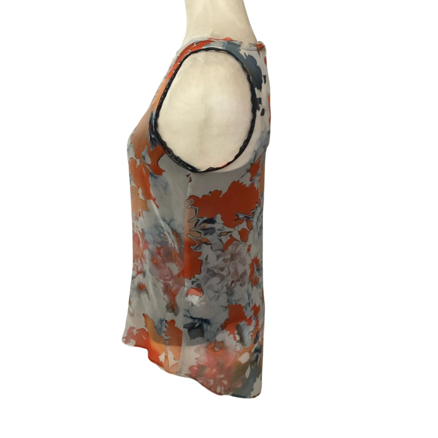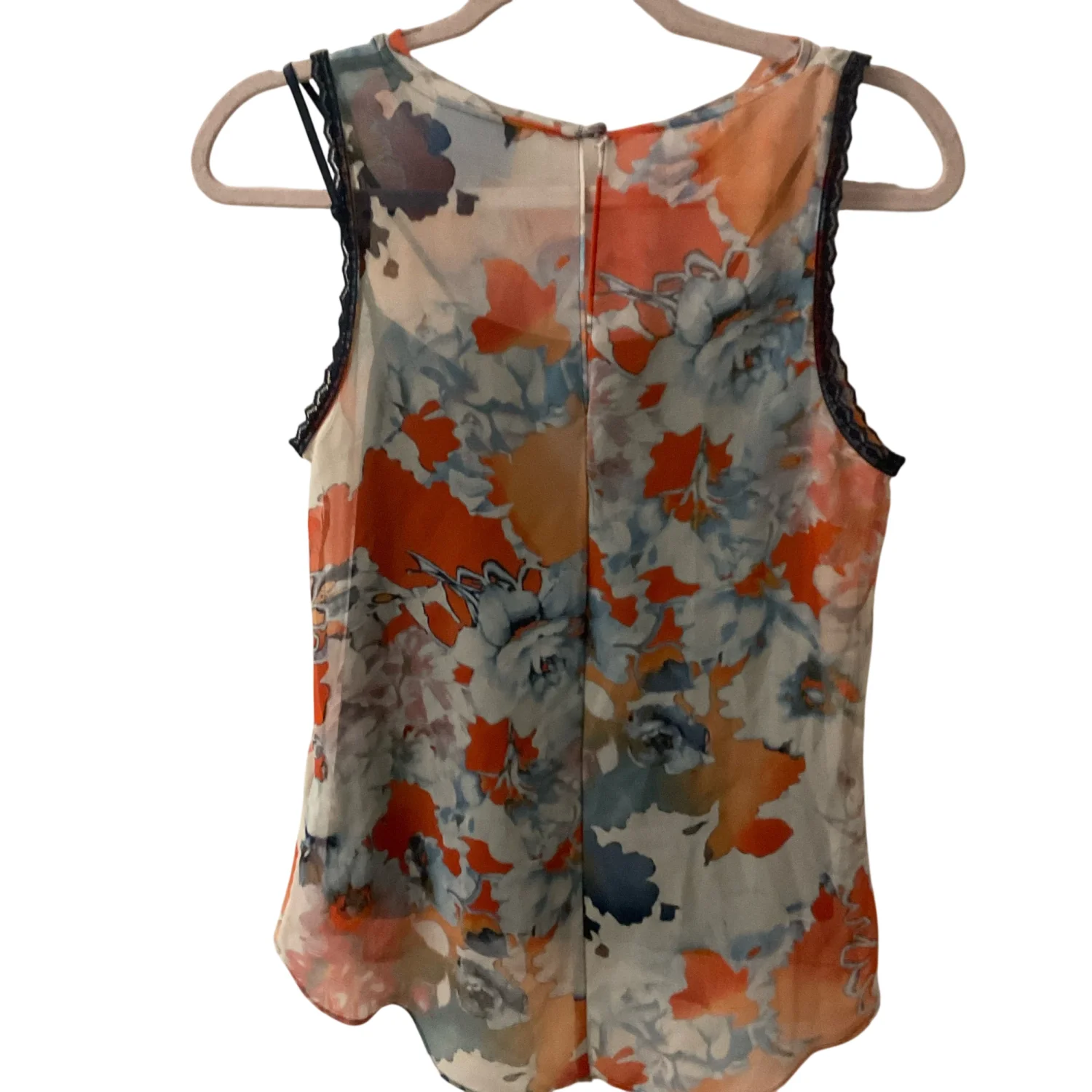 Style: Sleeveless lined top with lace detail at arm openings Color: Orange/Blue Size: XS Armpit: 15" Length: 25" Condition: Good 100% Polyester Hand wash