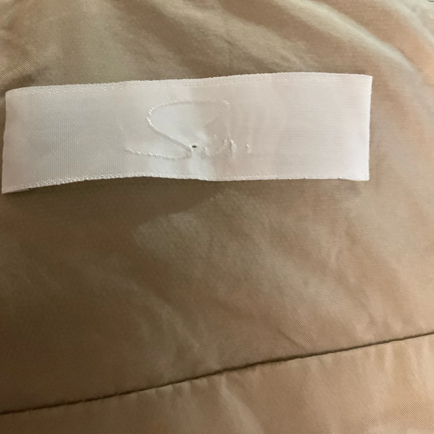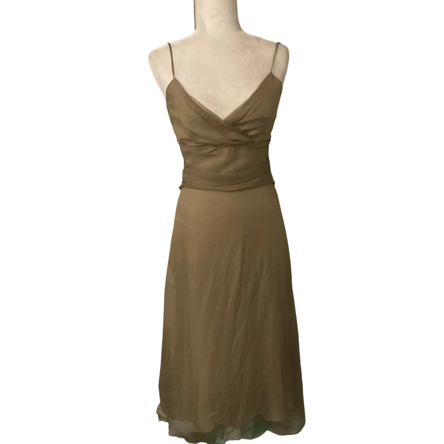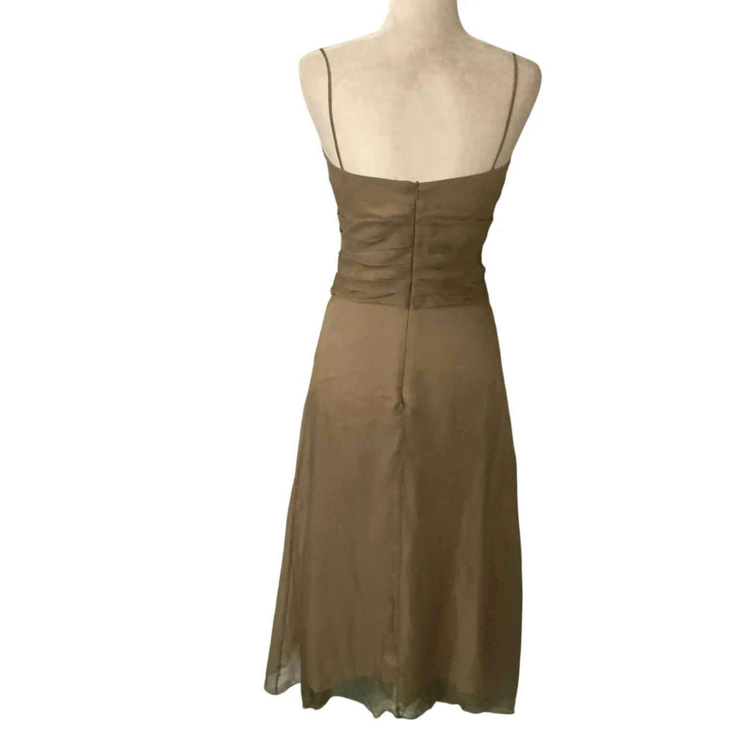 Style: Midi V-neck sheer overlay evening dress Color: Beige Size: 4 Condition: needs small repair at zipper closure as pictured 100% Rayon Dry clean only