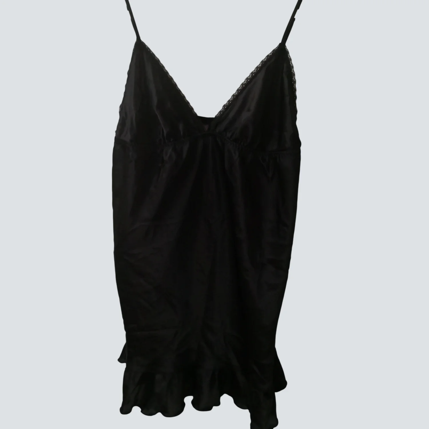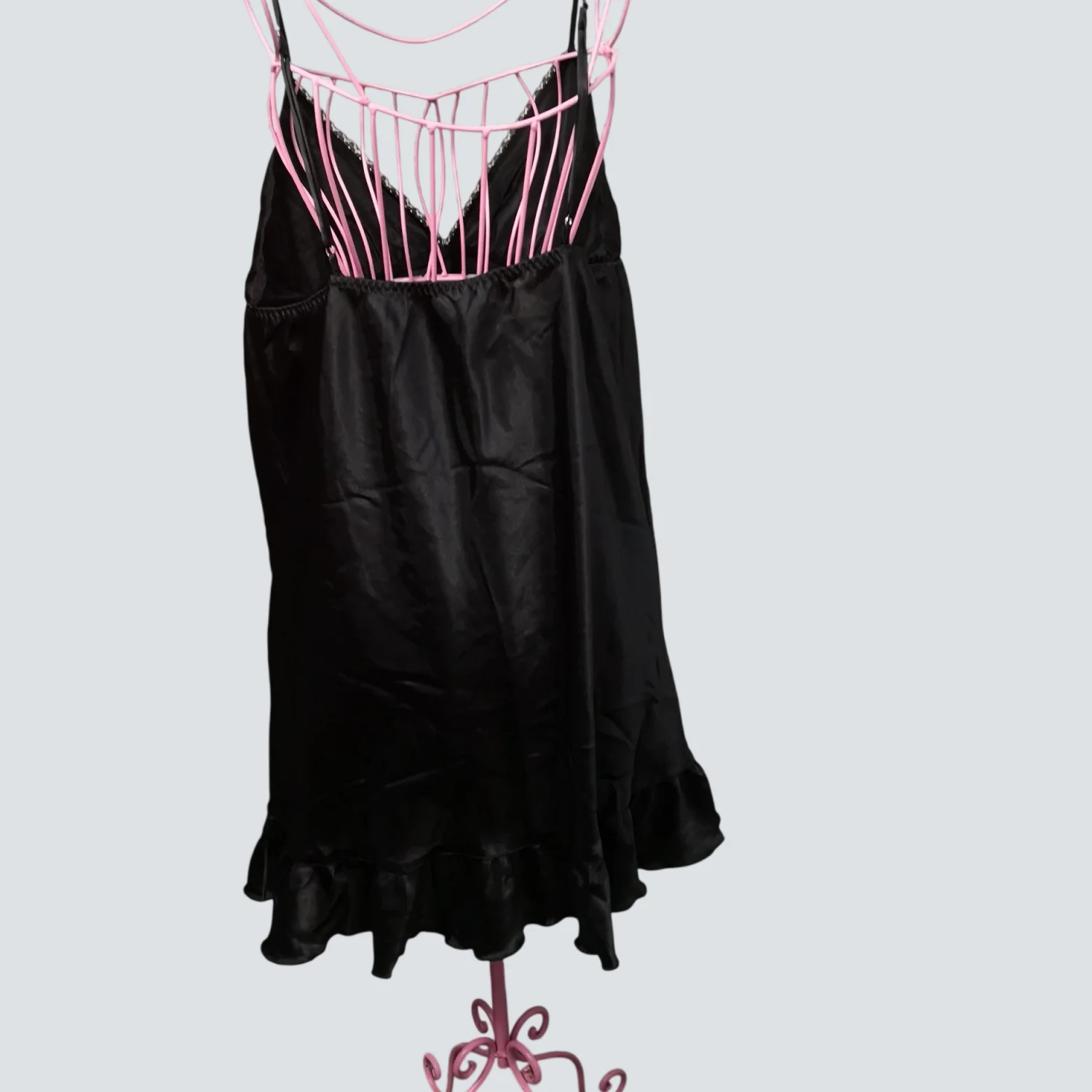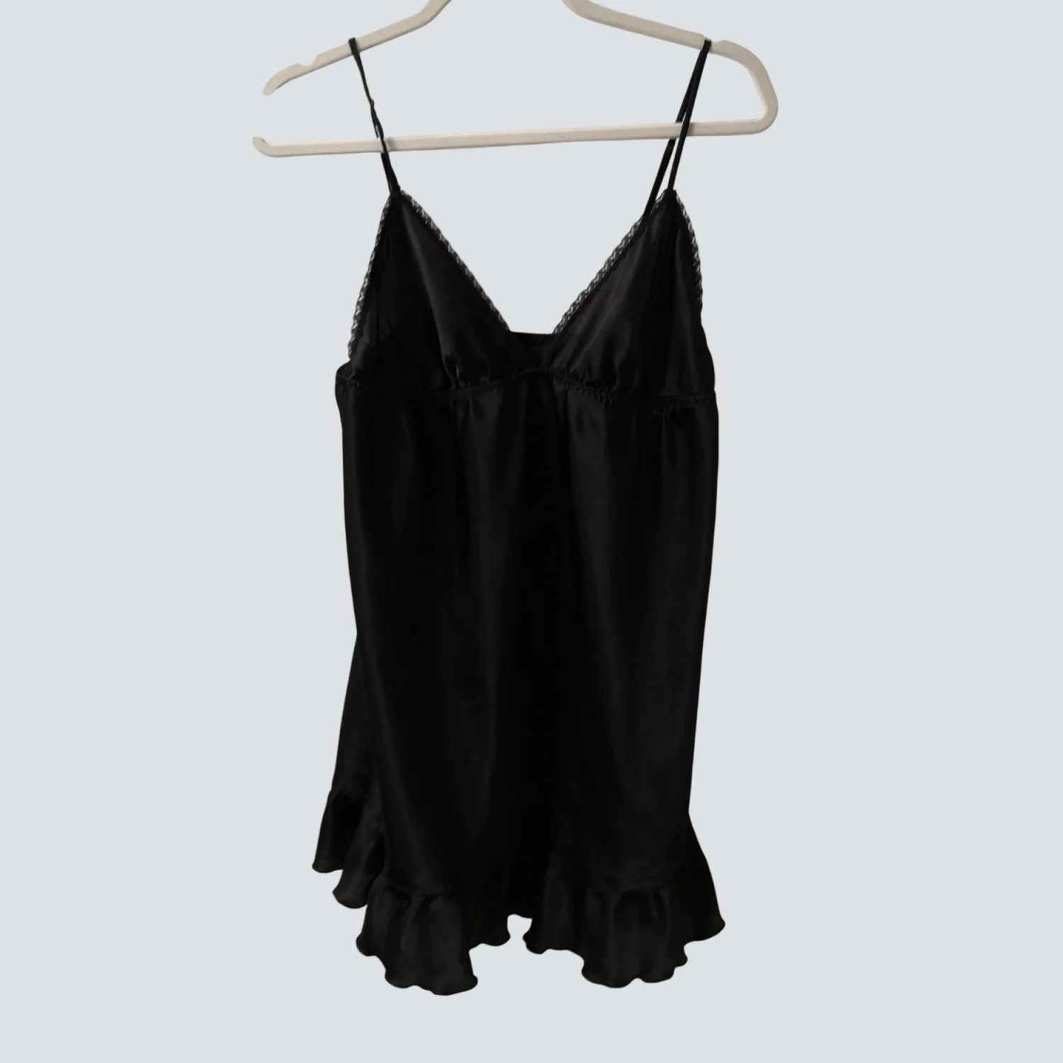 Style: Scalloped top babydoll nightgown with flared edges Color: Black Size L Armpit: 15” Length: 30” Condition: Good 100% Polyester Machine wash cold