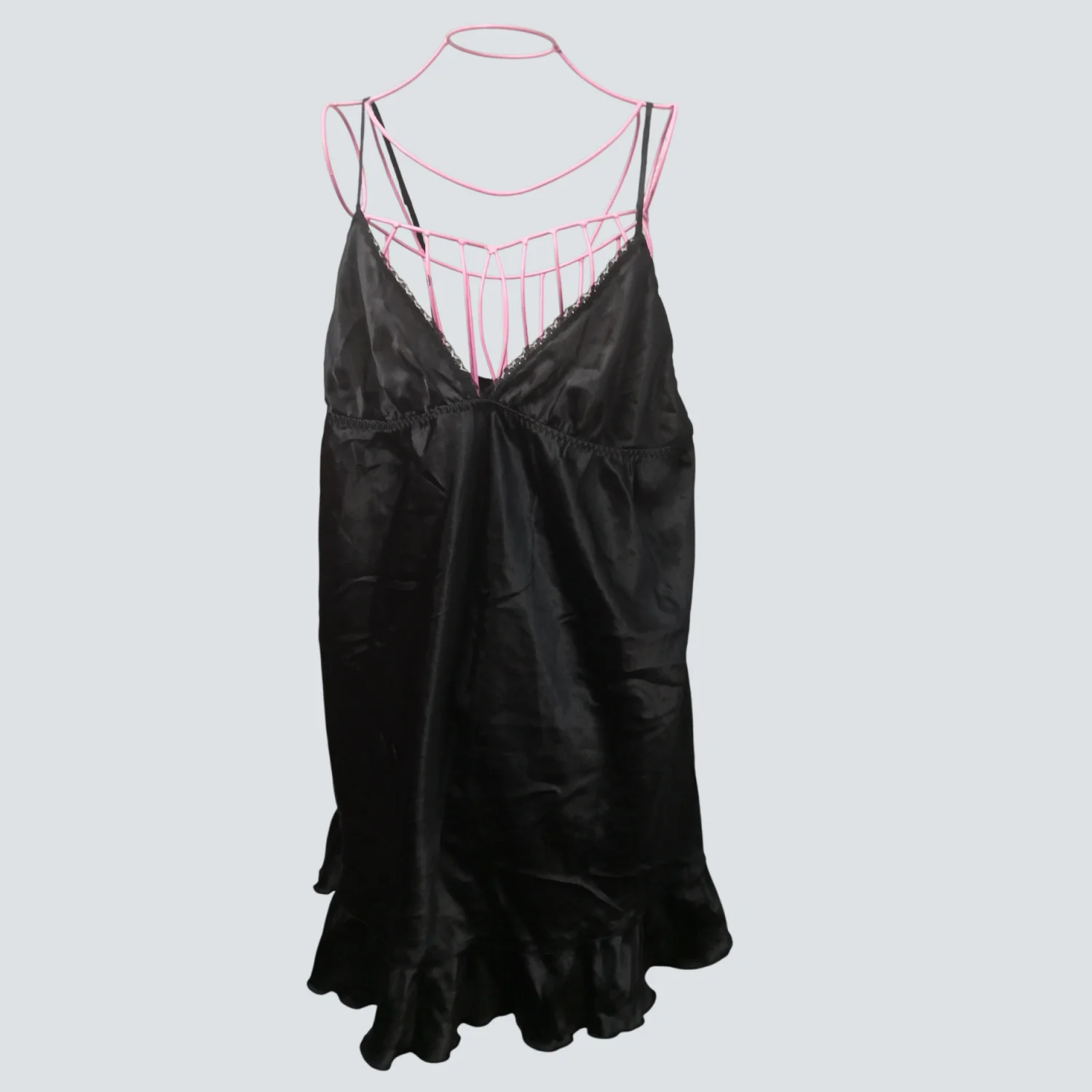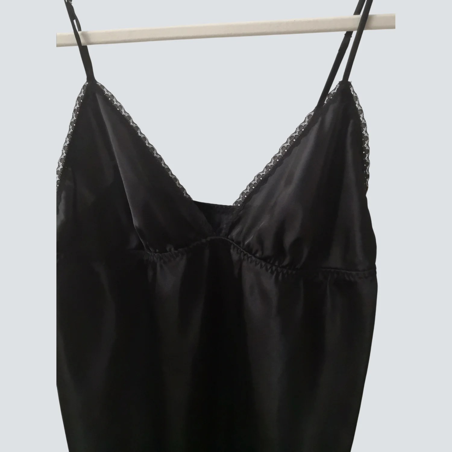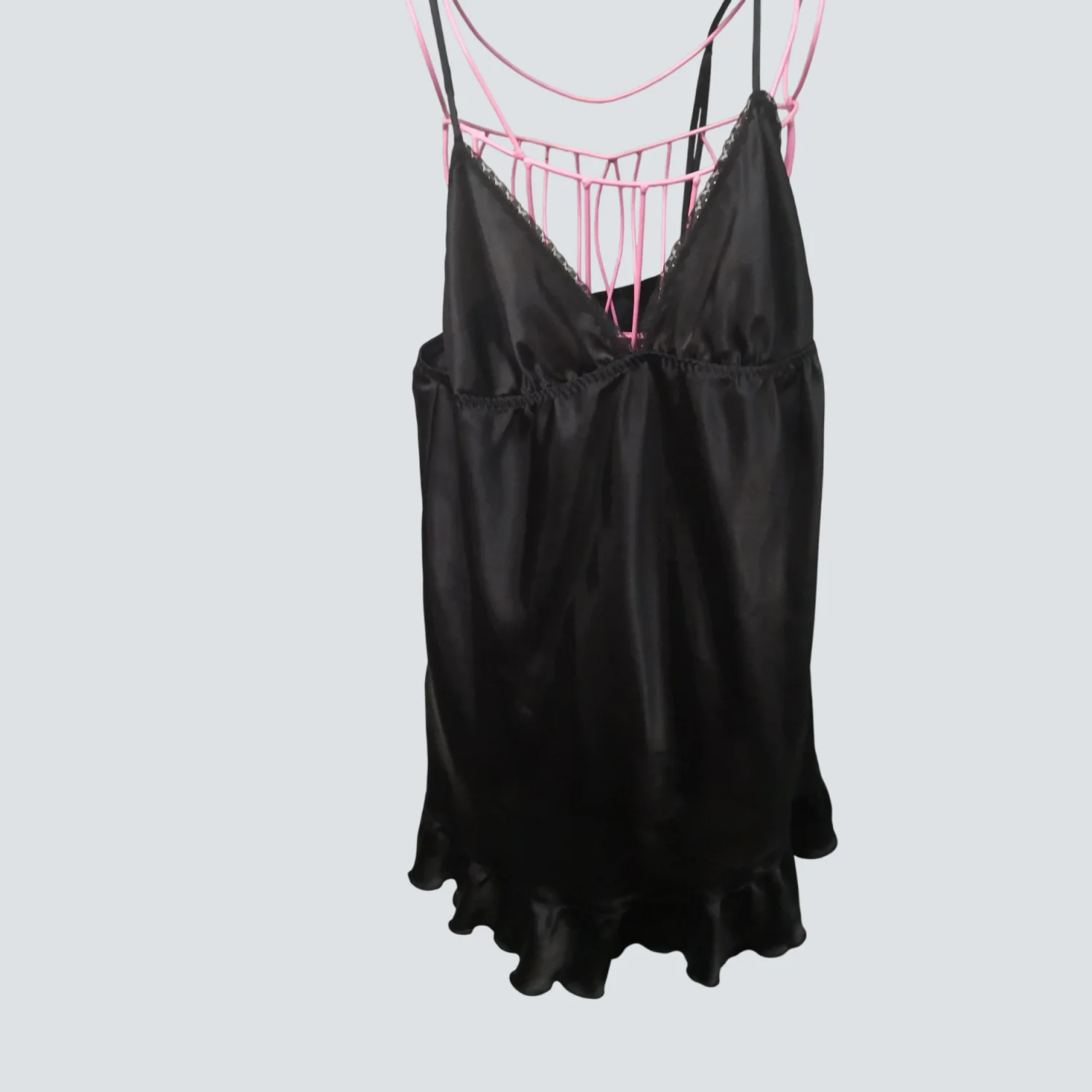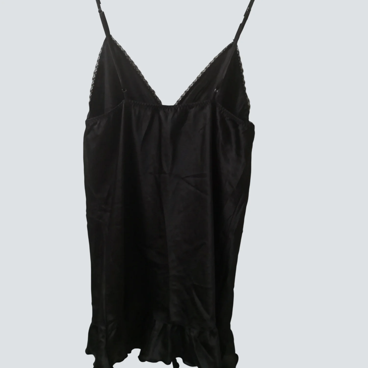 Style: Scalloped top babydoll nightgown with flared edges Color: Black Size L Armpit: 15” Length: 30” Condition: Good 100% Polyester Machine wash cold
