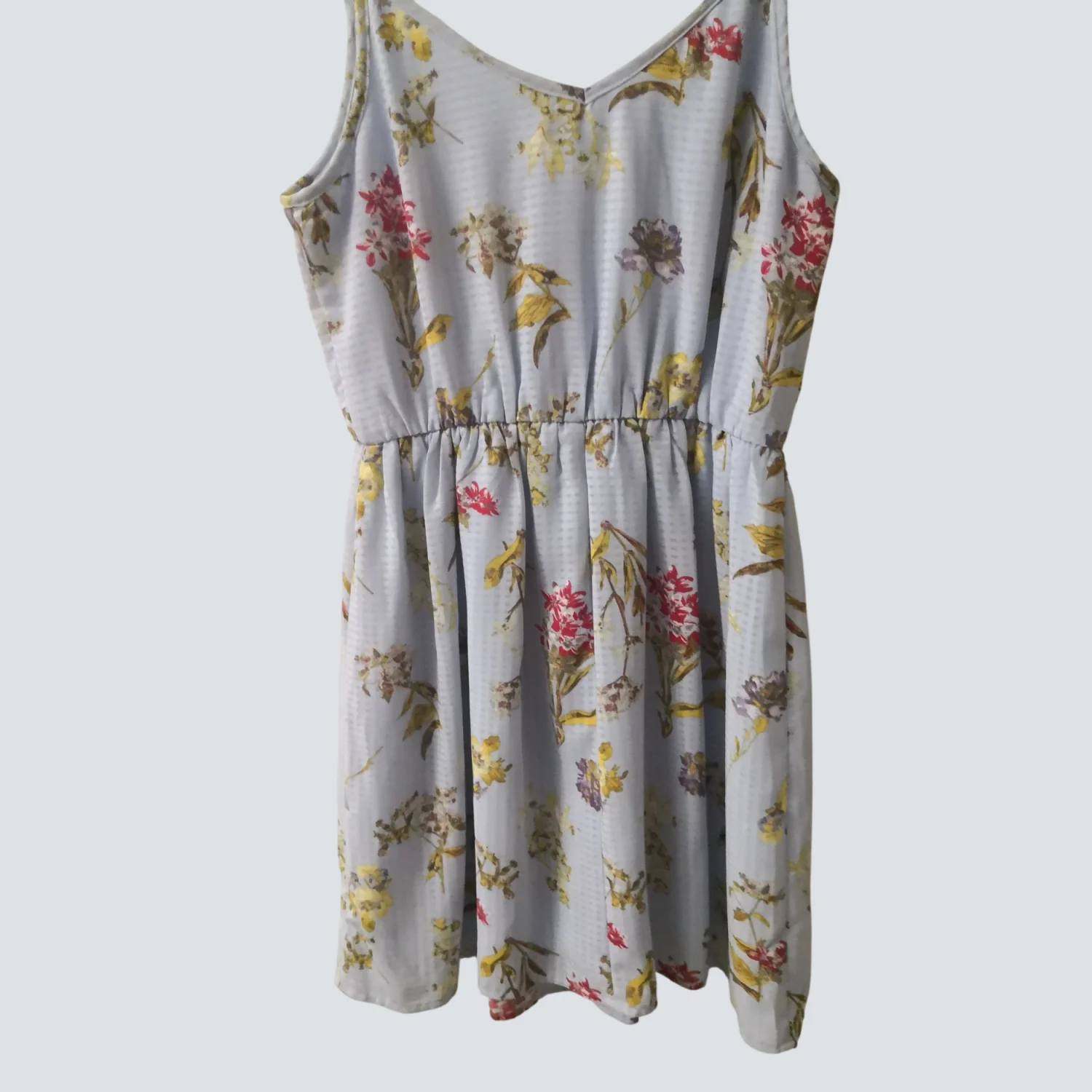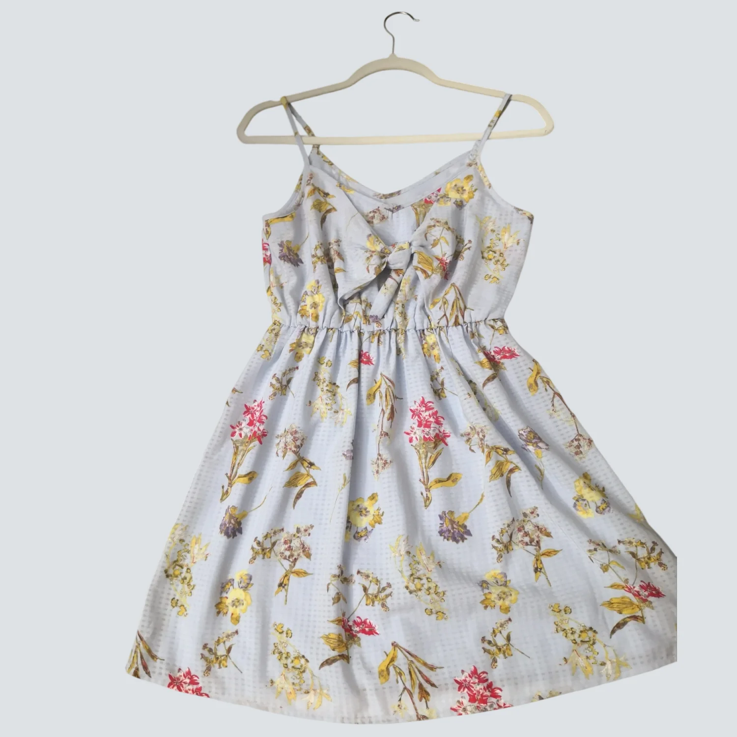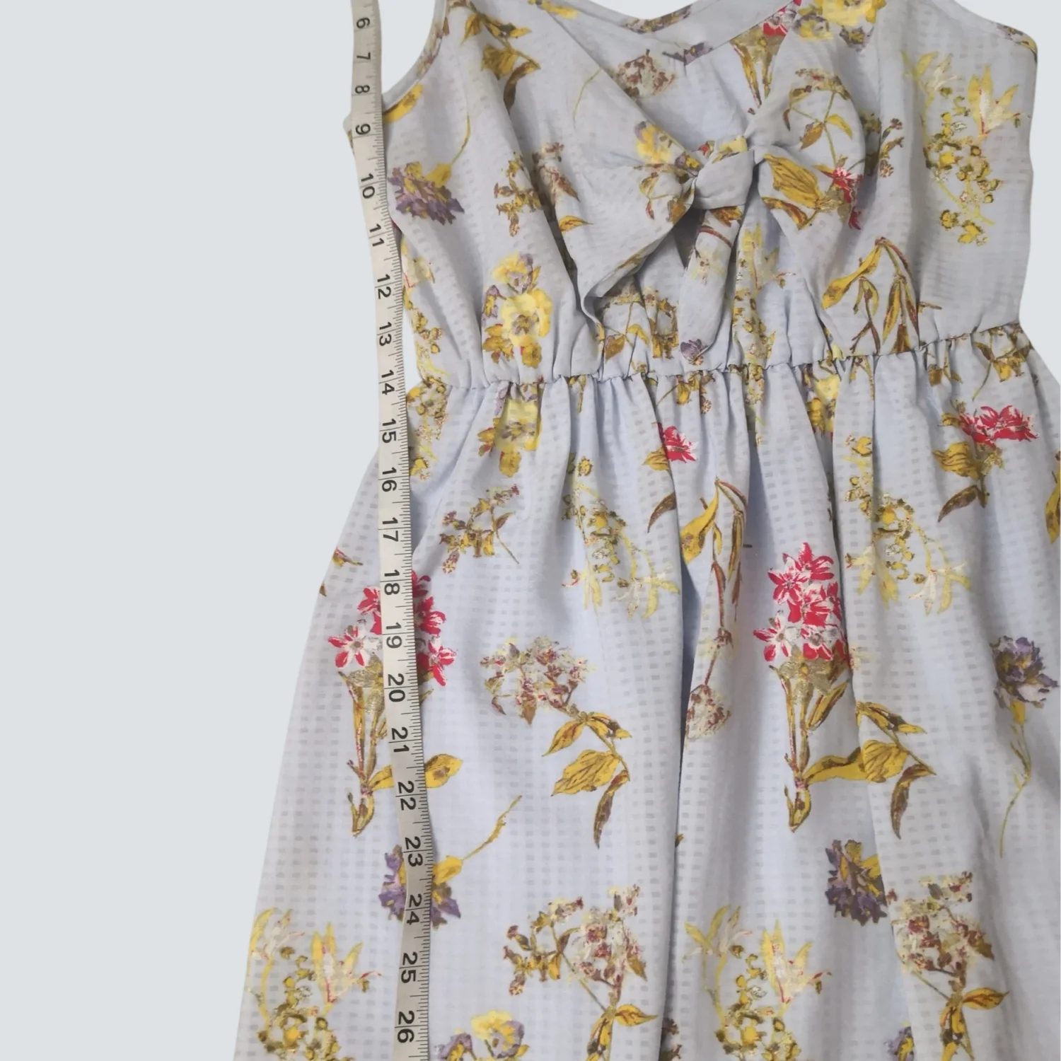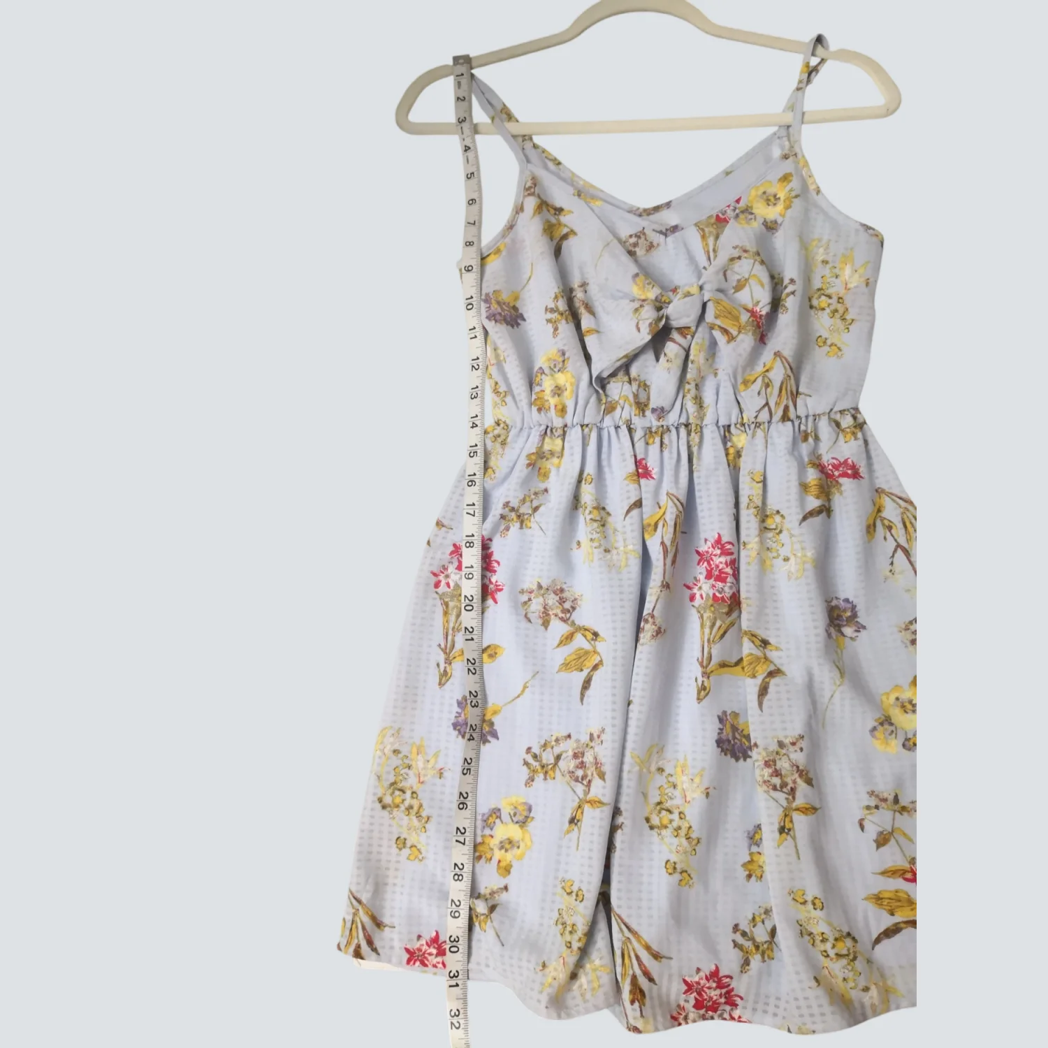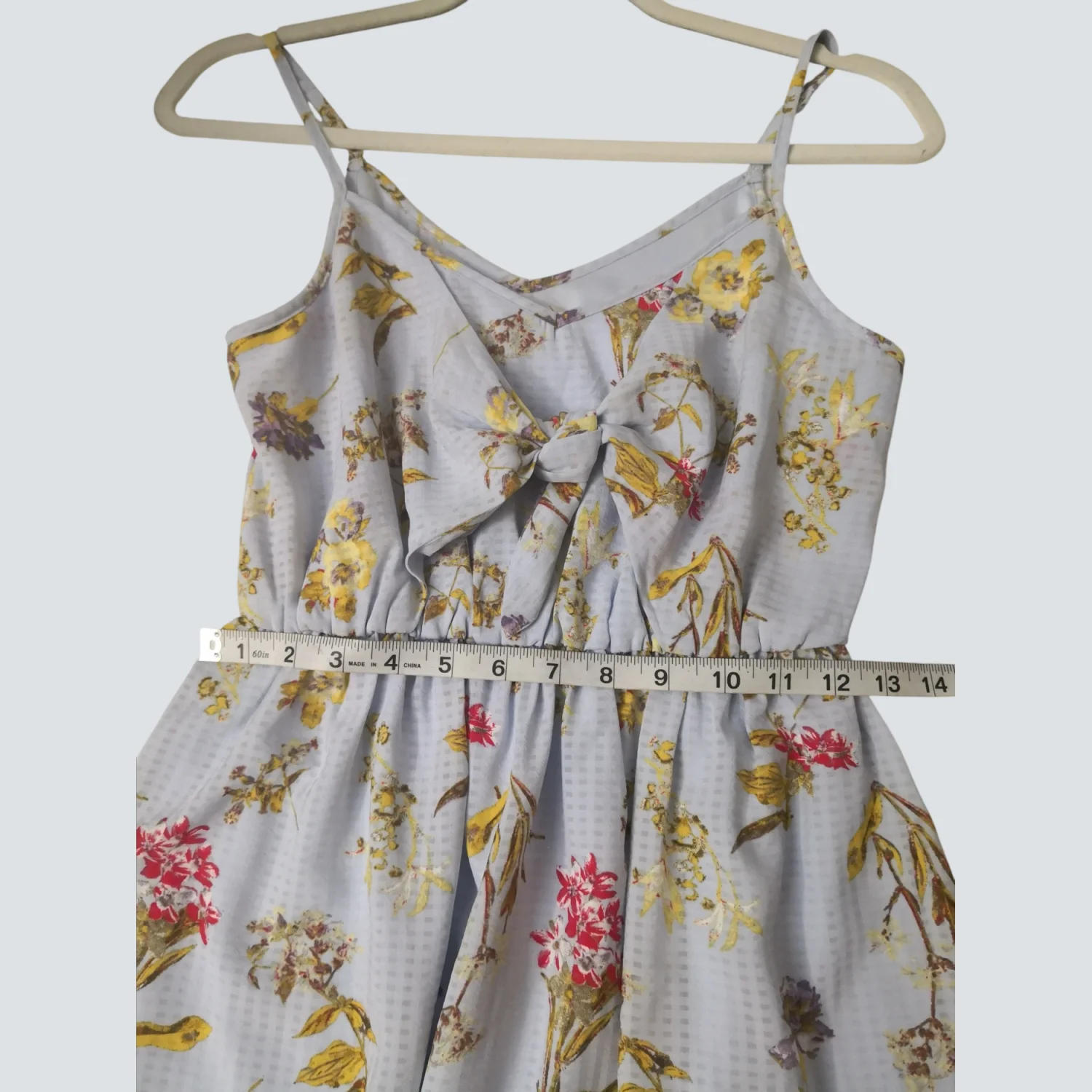 Style: Tie front mini sundress with spaghetti straps Color: Blue background with floral motif Size: XS Armpit: 13" Waist: 12" Length: 31" Condition: Good 100% Polyester Machine wash cold