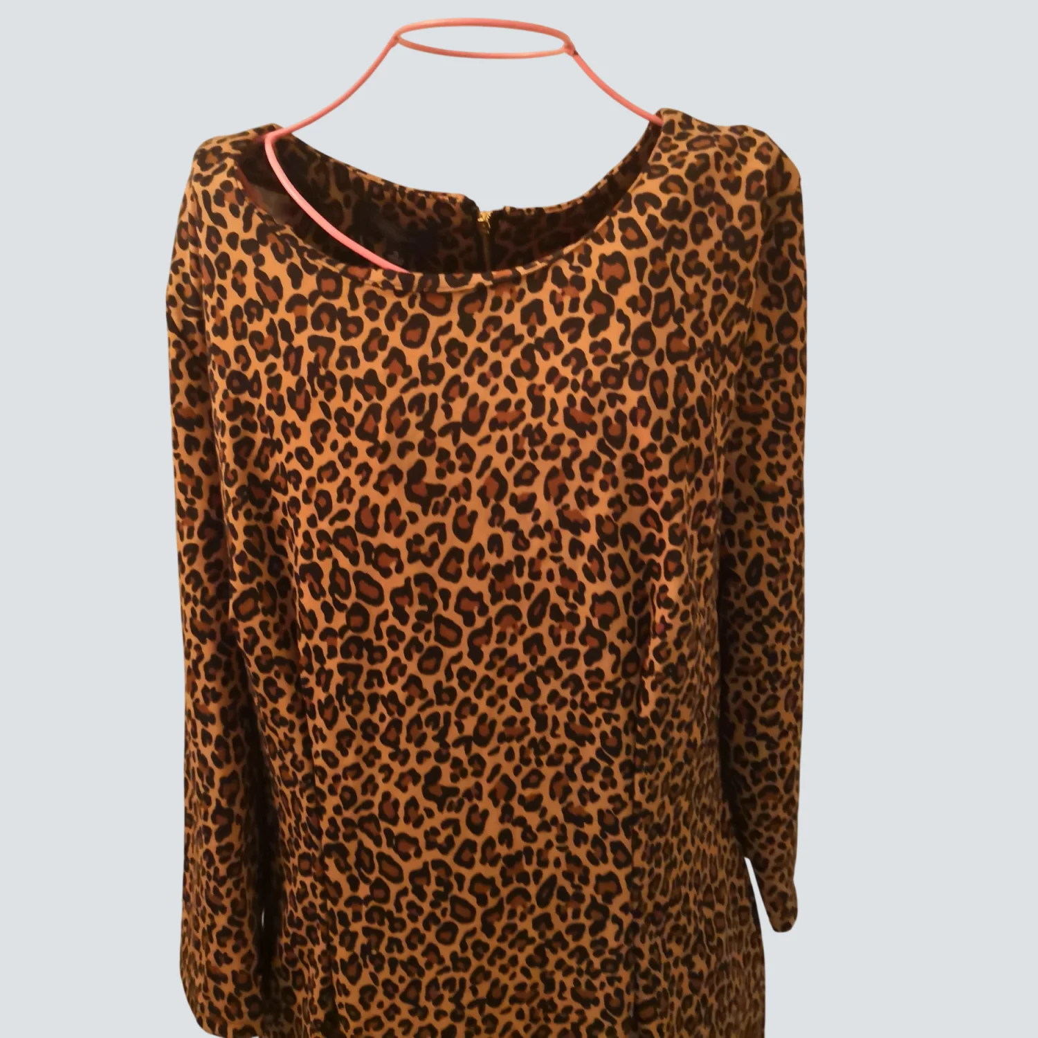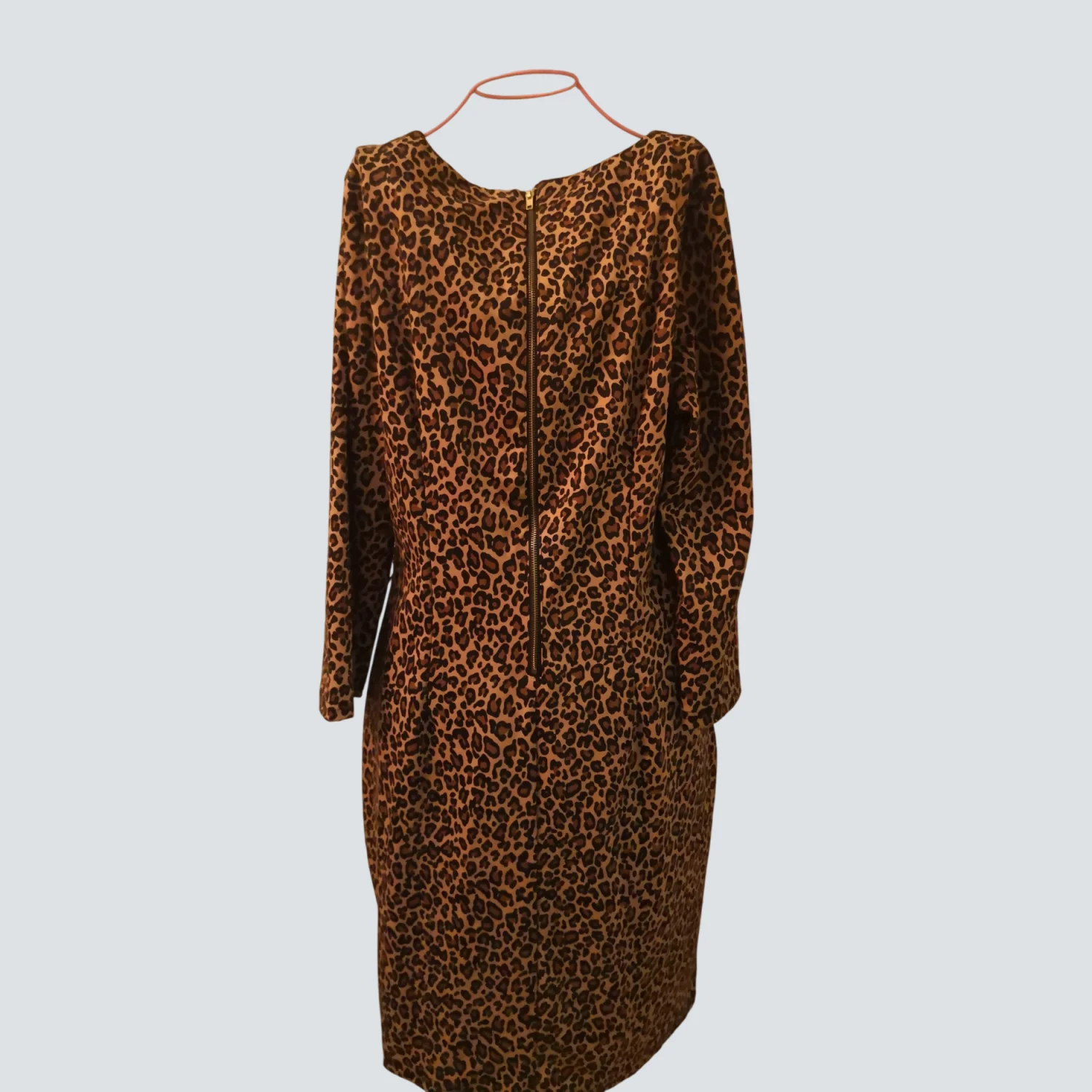 Style: Long sleeved crewneck animal print dress with exposed zipper on back Color: Brown/Black Size: 10 Armpit :17" Waist: 16" Length: 36" Condition: Good, item is missing belt 96% Polyester 4% Spandex Machine wash cold