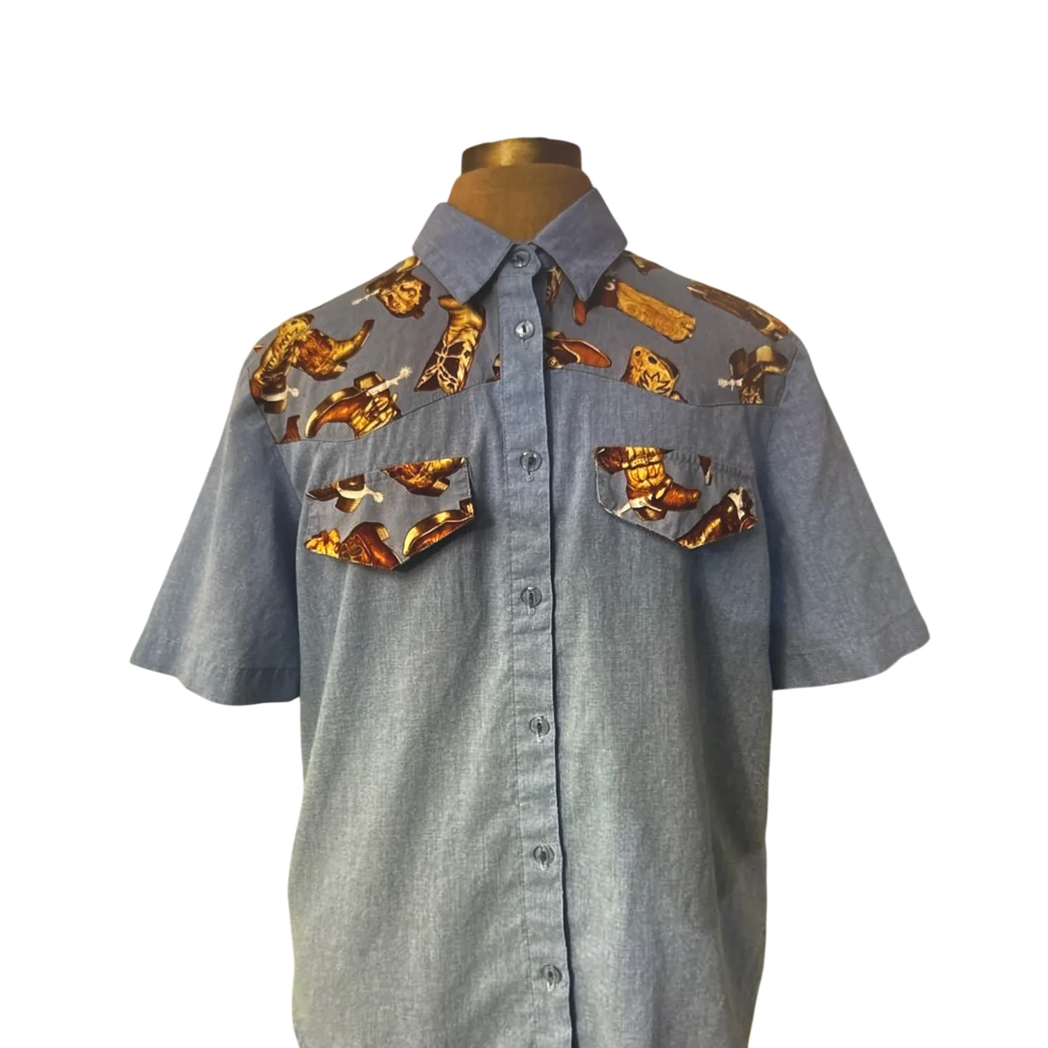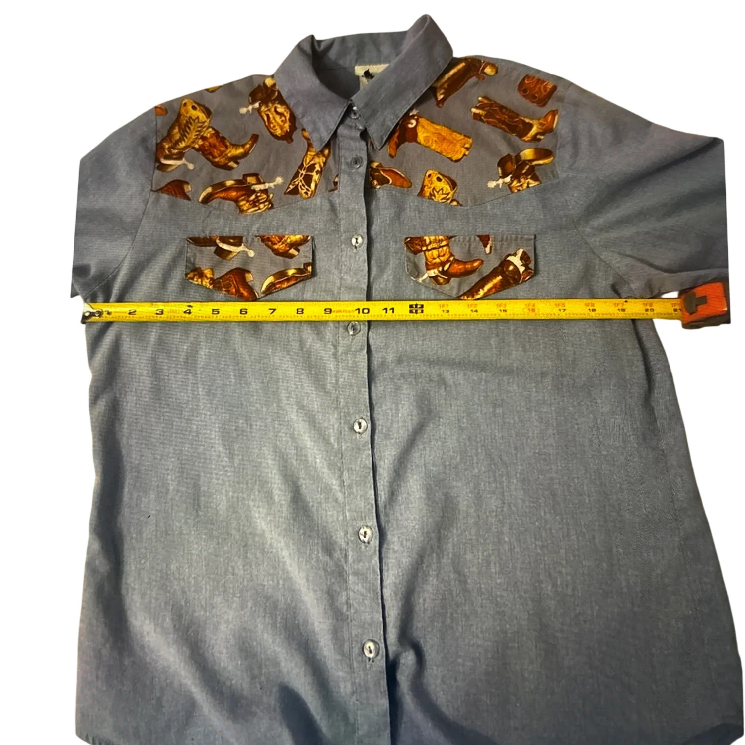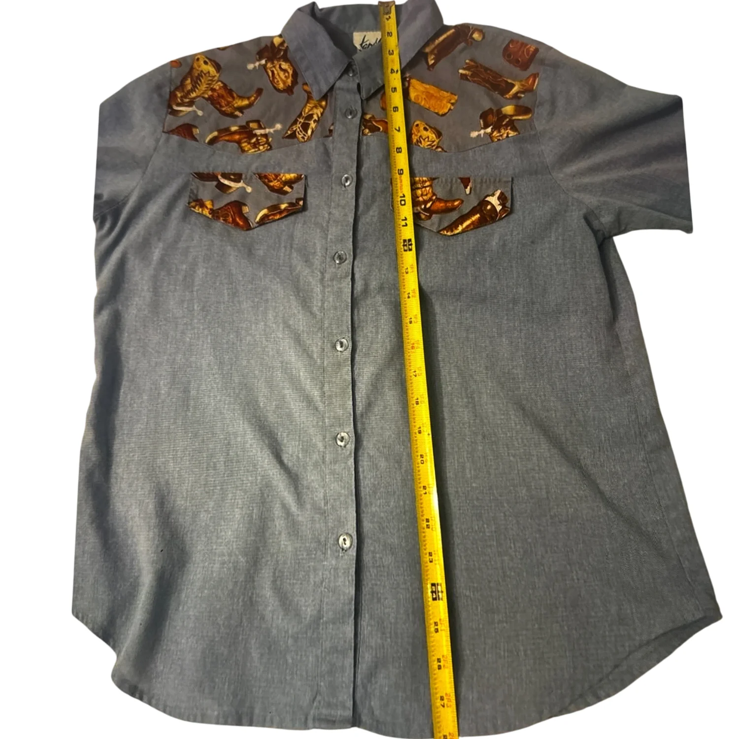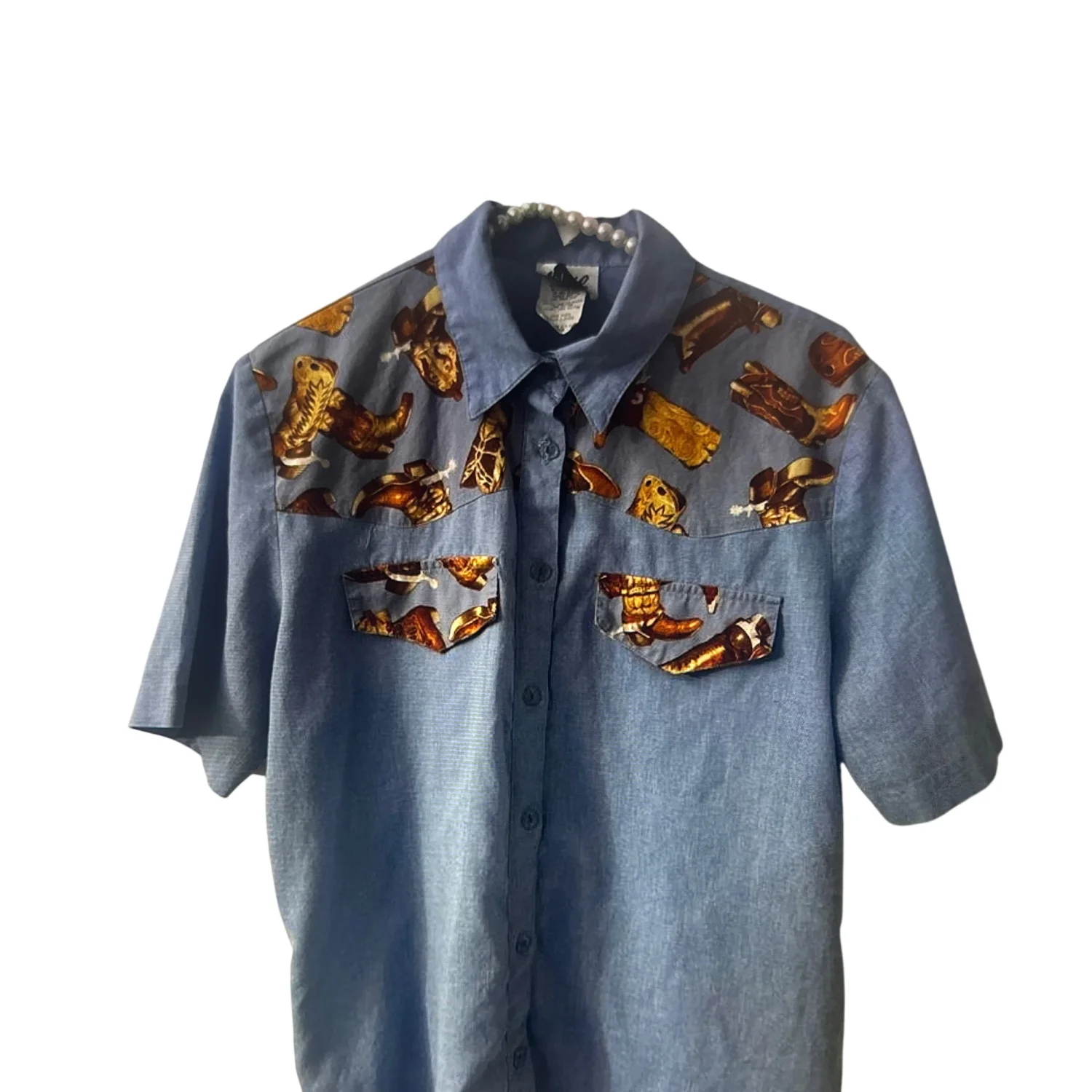 Style: Vintage cowboy boot print short sleeve button down top. Made in the USA Color: Blue/ Brown Size: M Armpit: 20” Length: 28” Condition: Good 50% Polyester 50% Cotton Machine wash cold