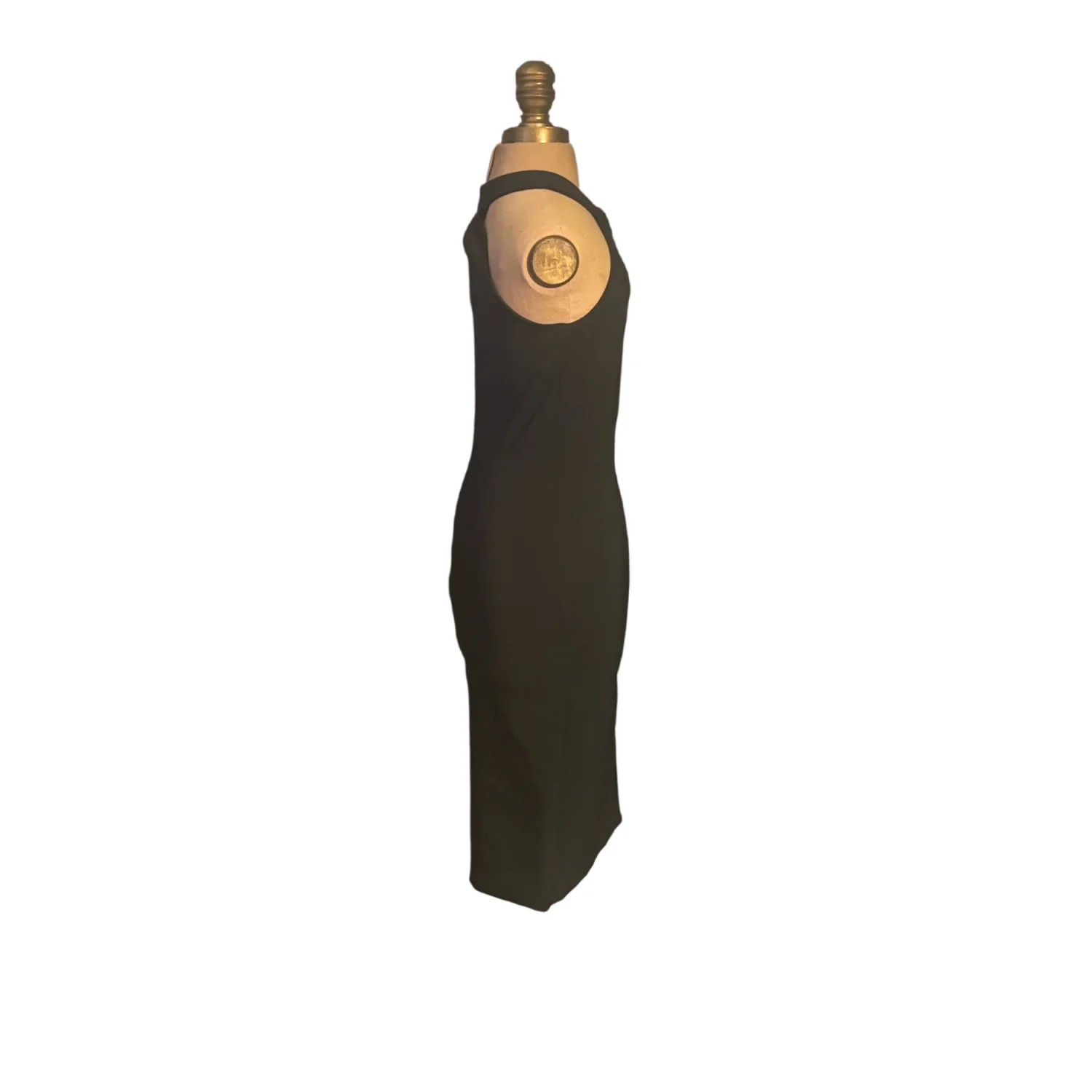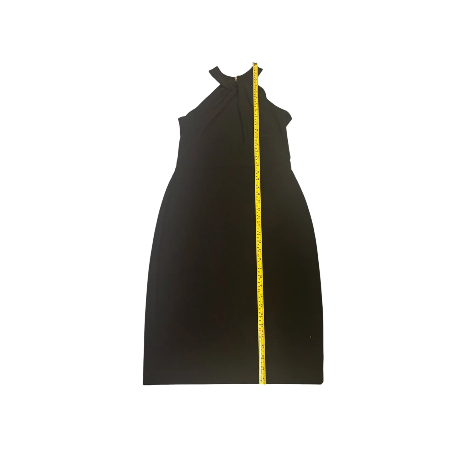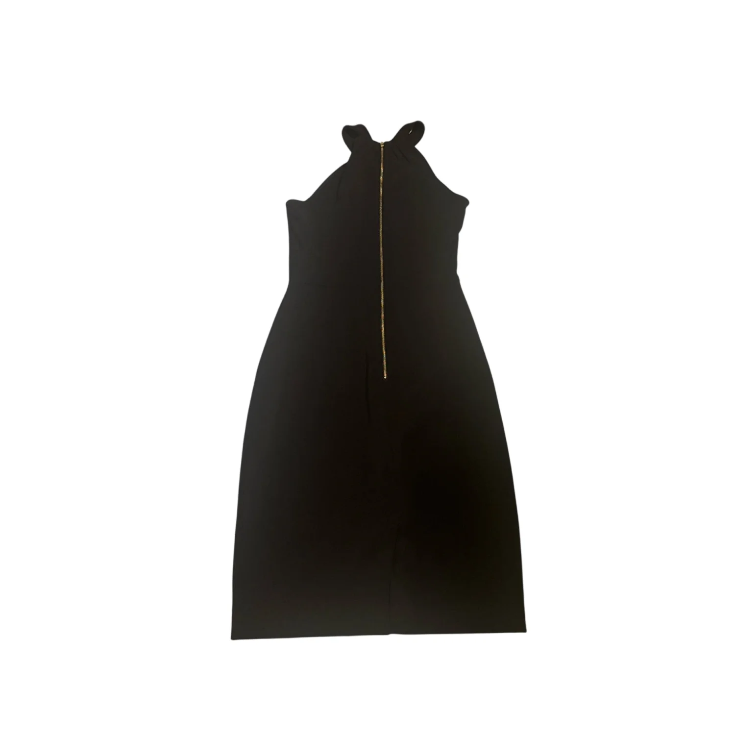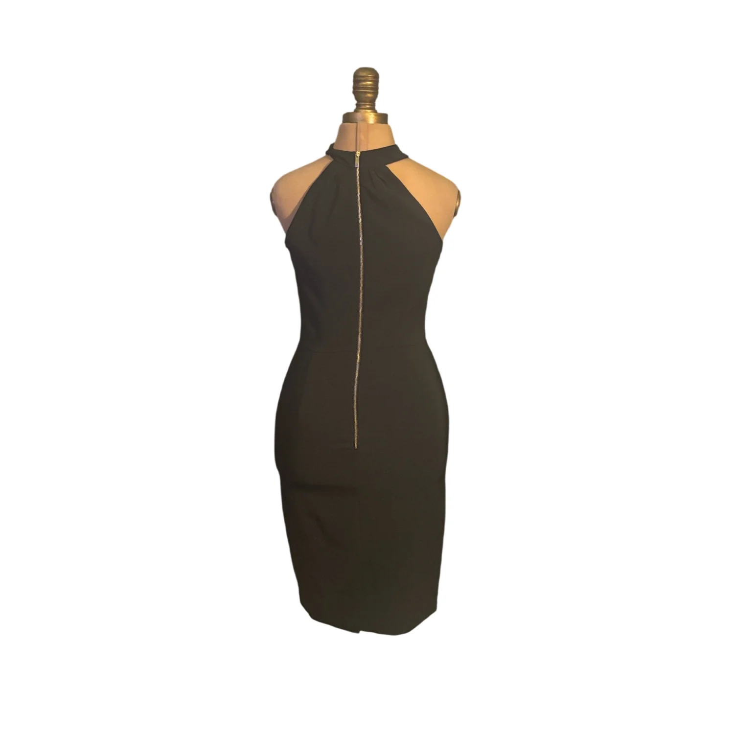 Style: Elegant halter sheath dress designed for a sleek, tailored look. Features a crossed halter neckline that flatters the shoulders and collarbone. Back of garment has exposed zipper. Smooth, form-fitting silhouette suitable for evening events and special occasions. Dress color offers timeless versatility for your wardrobe. Color: Black/Gold Size: 2 Armpit: 14" Length: 40" Condition: Good 96% Polyester 4% Spandex Hand wash cold